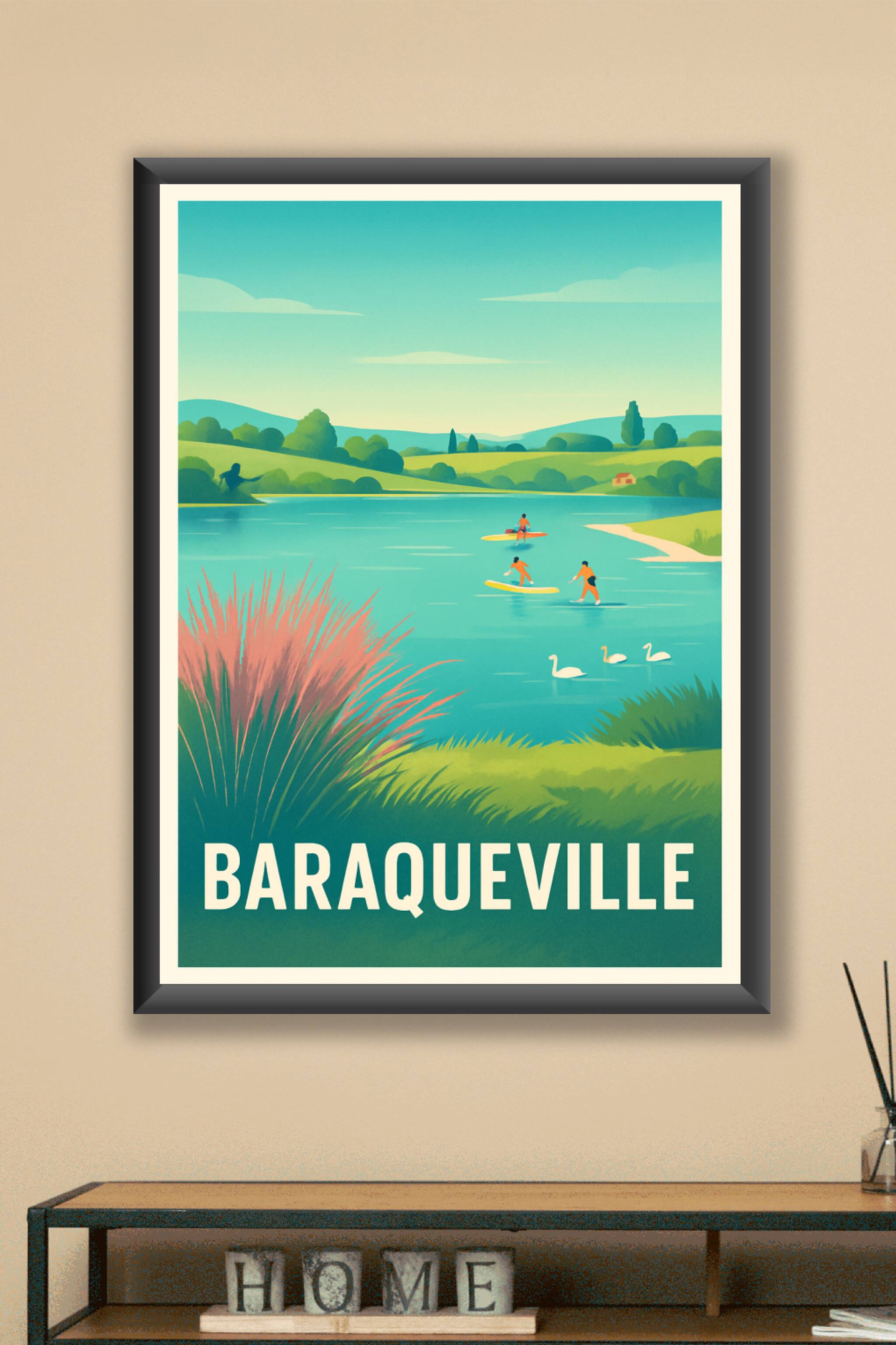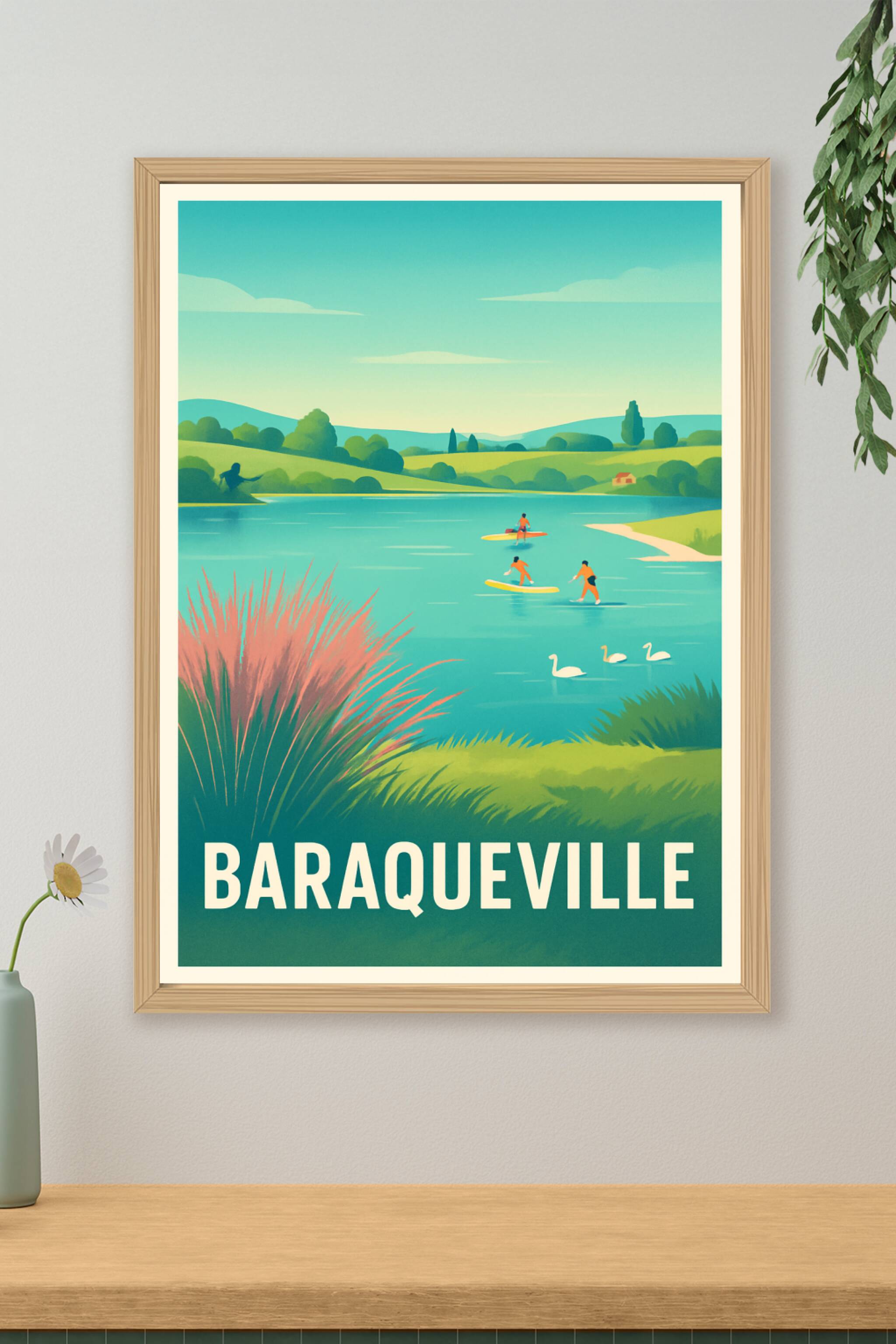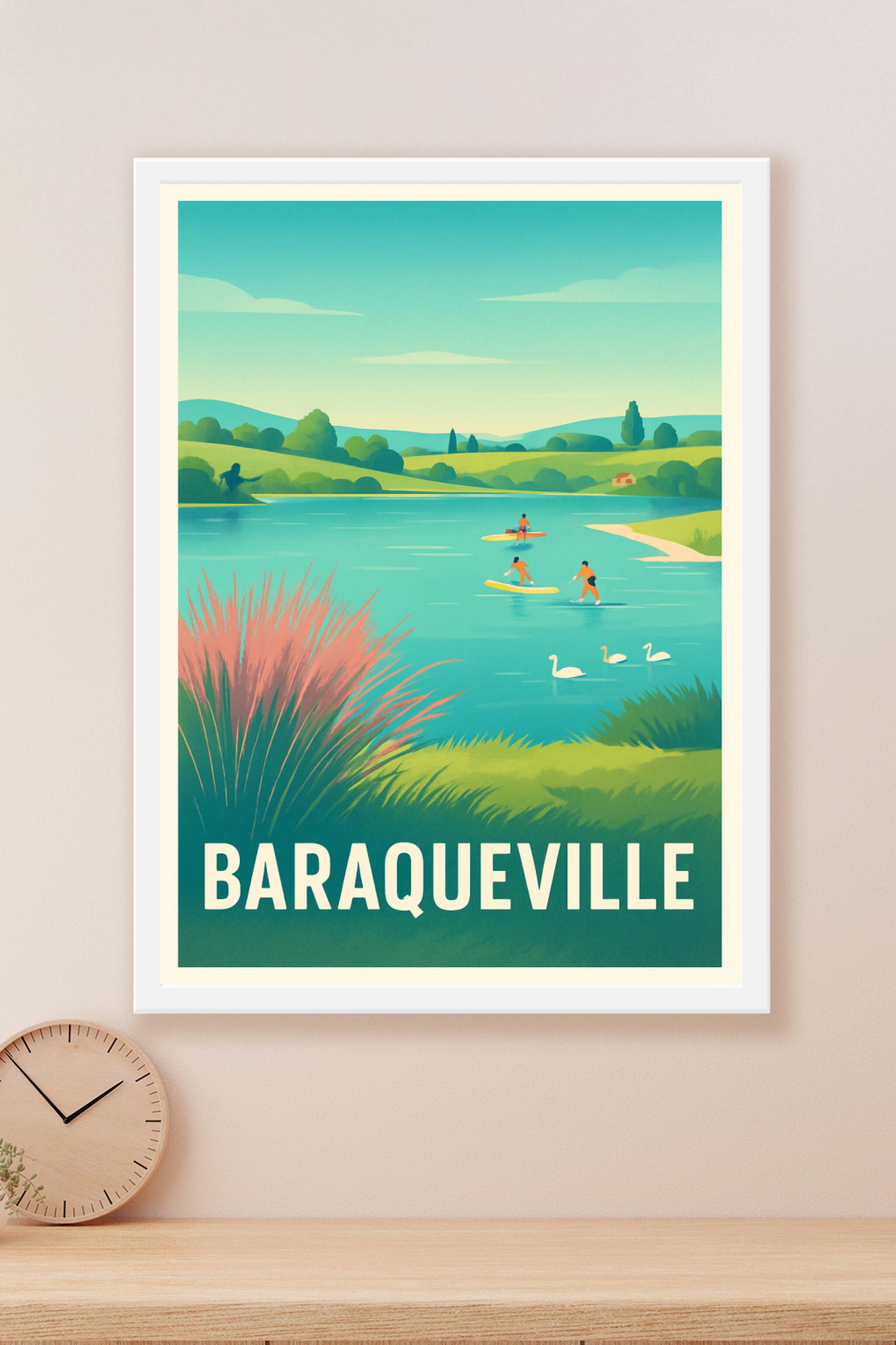 Découvrez le charme paisible de Baraqueville avec cette affiche illustrée mettant en scène un paysage aquatique idyllique où pagayent des amateurs ...