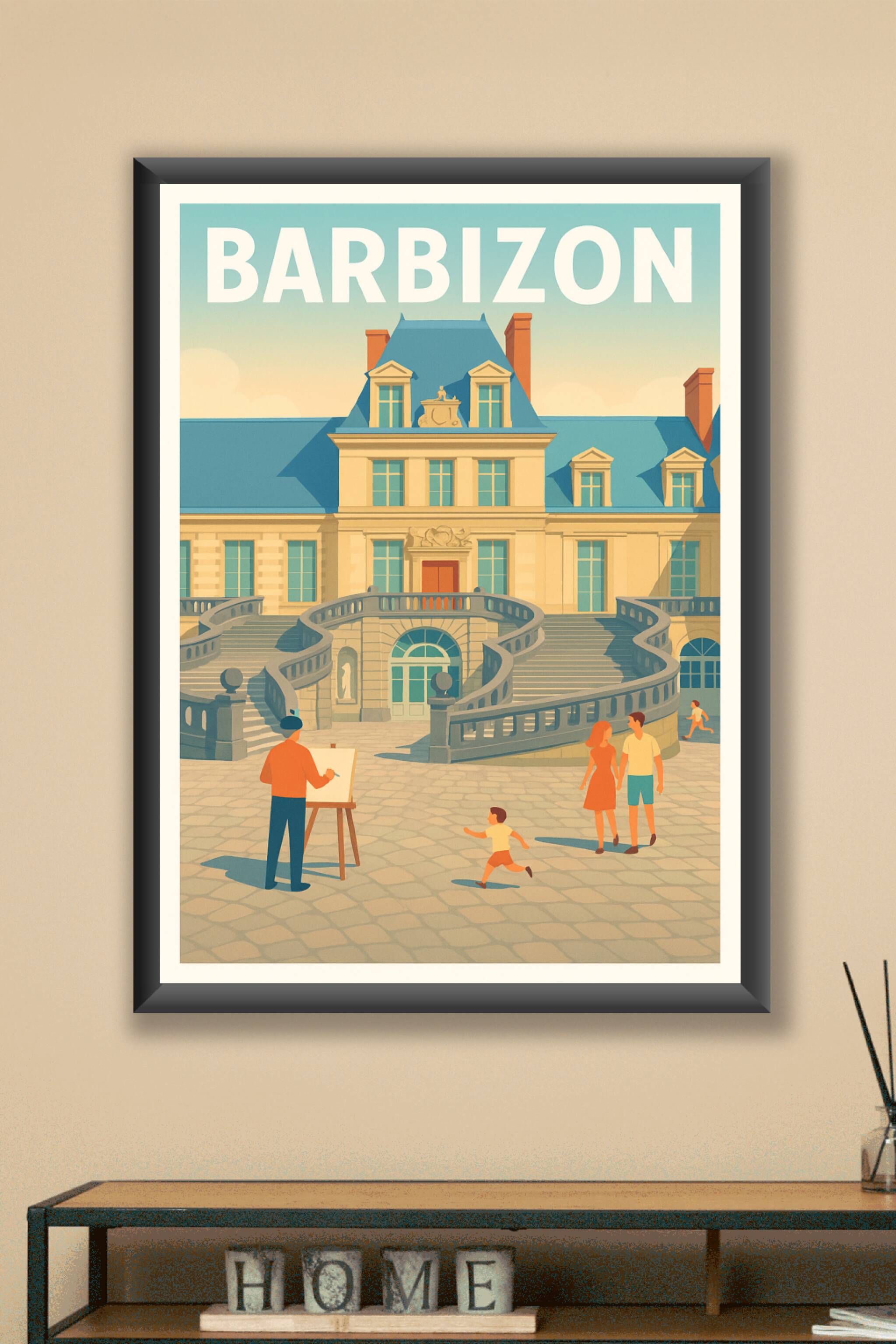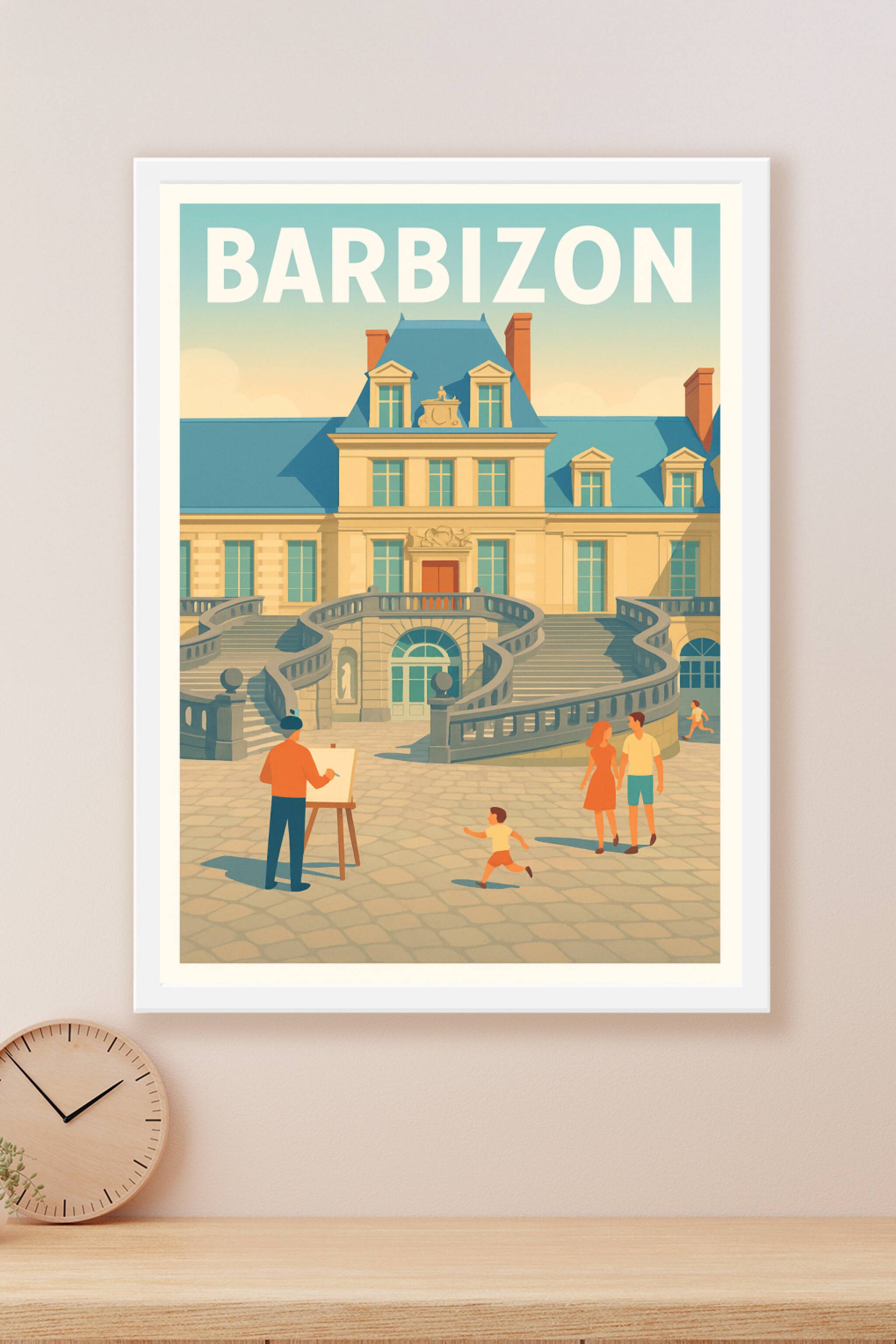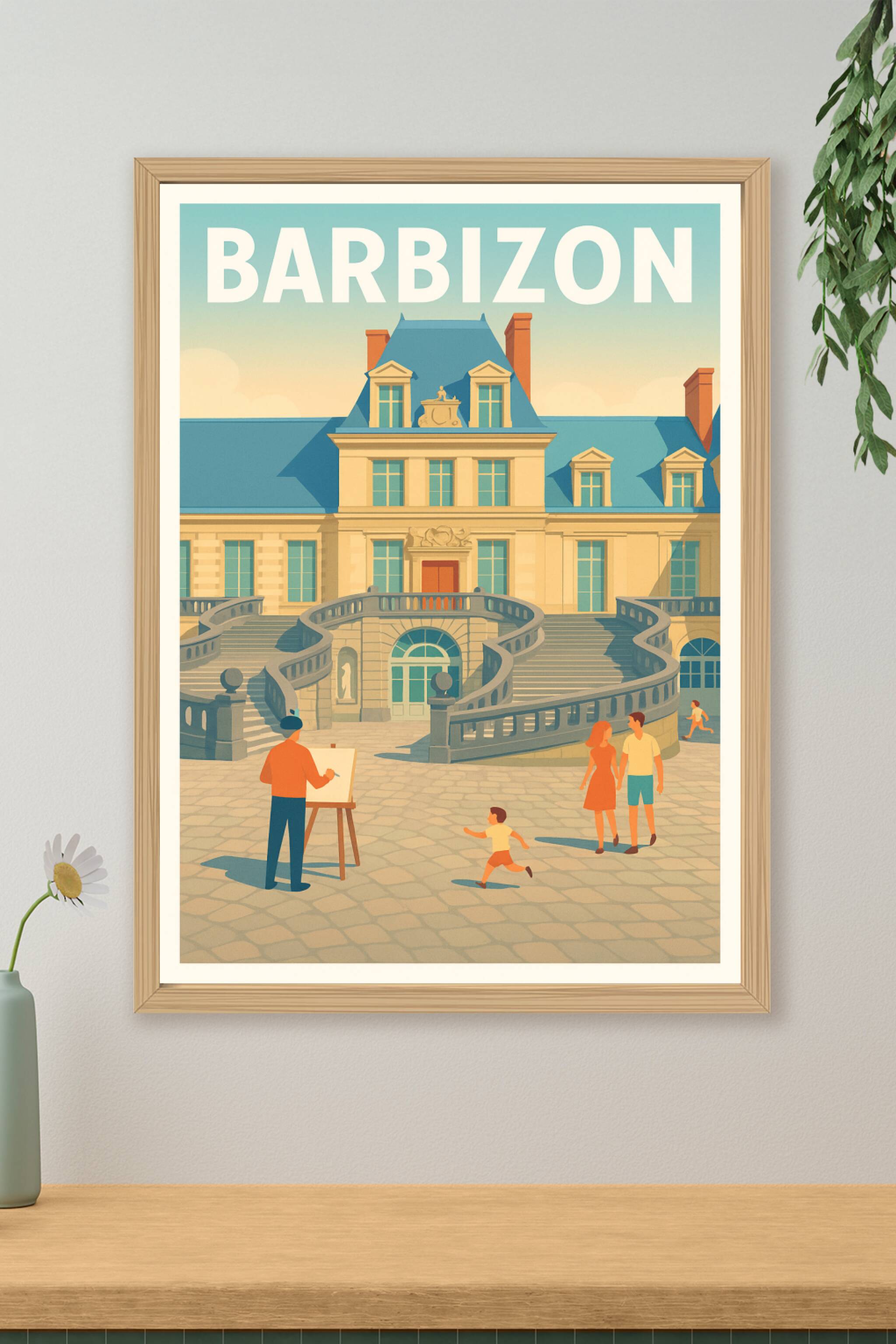 Découvrez Barbizon, ce charmant village artistique célébré pour son école de peinture en pleine nature, sublimé sur cette affiche au style vintage chaleureux. Le poster illustre une scène paisible devant un superbe bâtiment classique, mettant en avant la création artistique et la douceur de vivre locale. Imprimée en tirage "Fine Art" sur un papier 305g coton de qualité musée, cette affiche vous assure une fidélité des couleurs et une texture haut de gamme. Disponible en plusieurs formats de A1 à A4, avec ou sans cadre, c'est un choix parfait pour embellir votre intérieur ou offrir un souvenir raffiné à tous les amateurs d'art et de paysages authentiques.