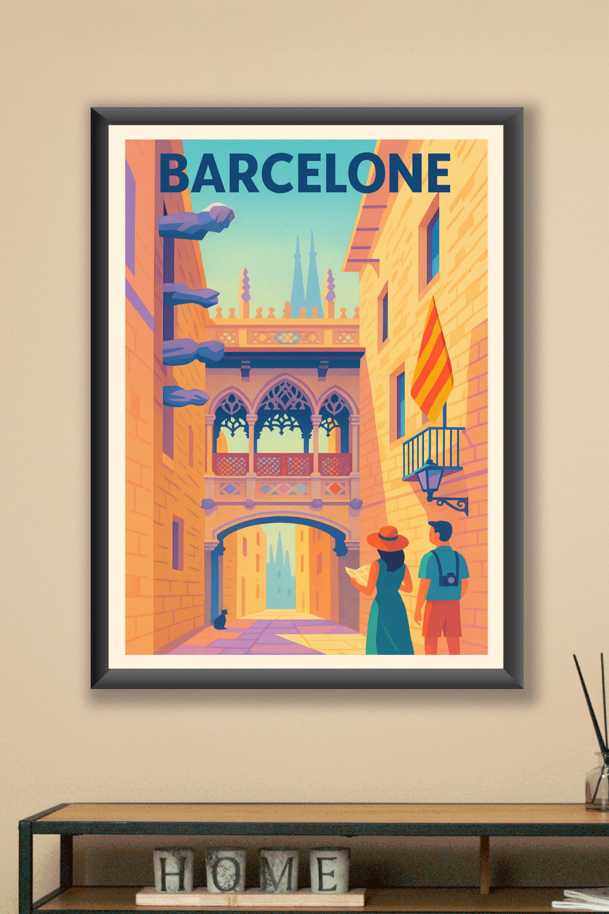 Découvrez l'ambiance unique du quartier gothique de Barcelone à travers cette affiche illustrée aux couleurs chaudes et lumineuses, mettant en scèn...