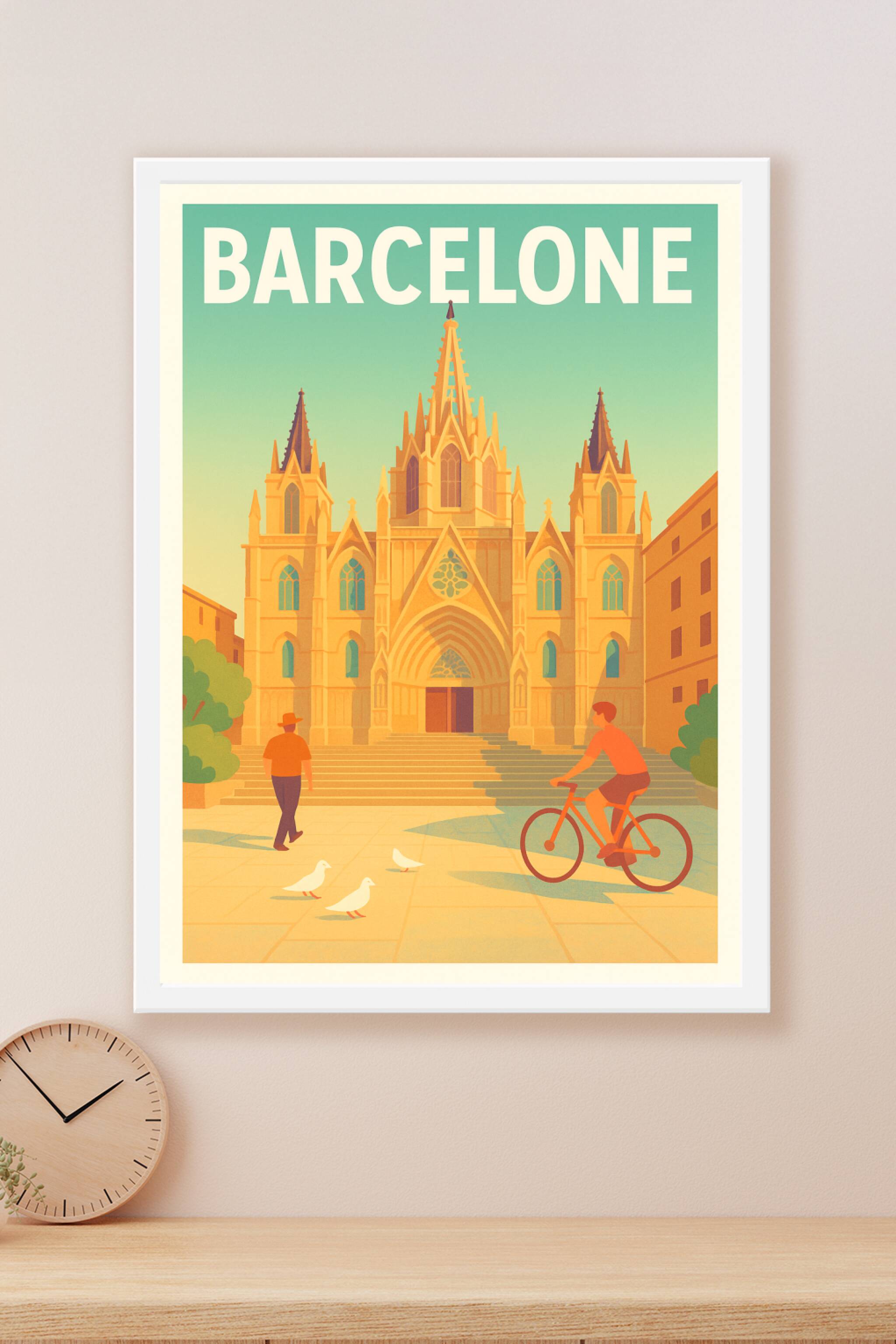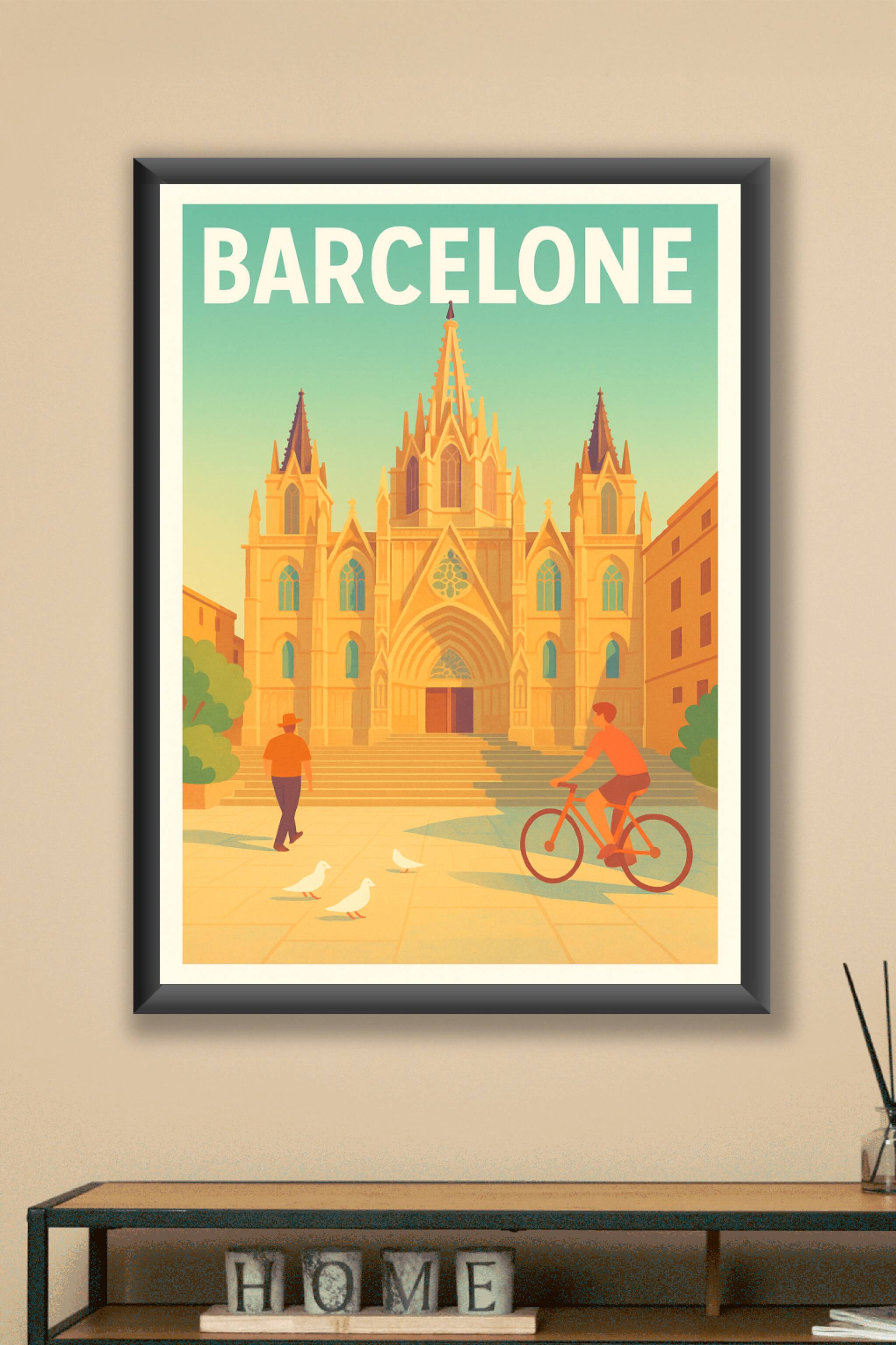 Découvrez l'ambiance lumineuse et sereine de Barcelone avec cette affiche qui met en scène la majestueuse cathédrale de la ville. Cette illustratio...