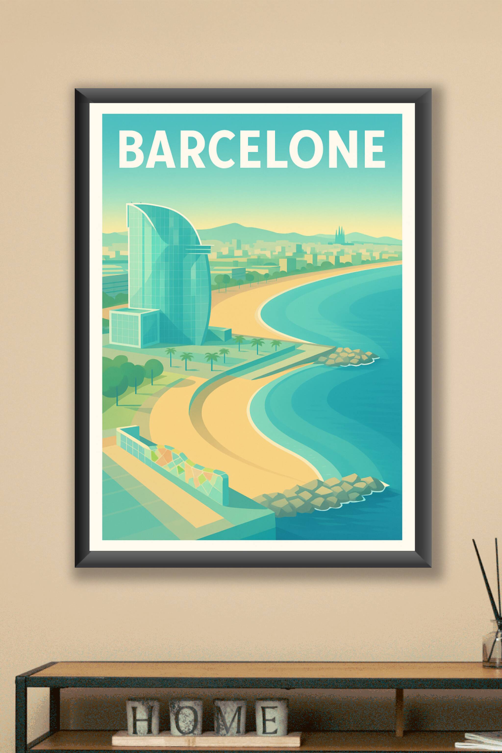 Succombez au charme ensoleillé de Barcelone avec cette affiche illustrée qui capture la douceur de la Méditerranée et l'architecture emblématique d...
