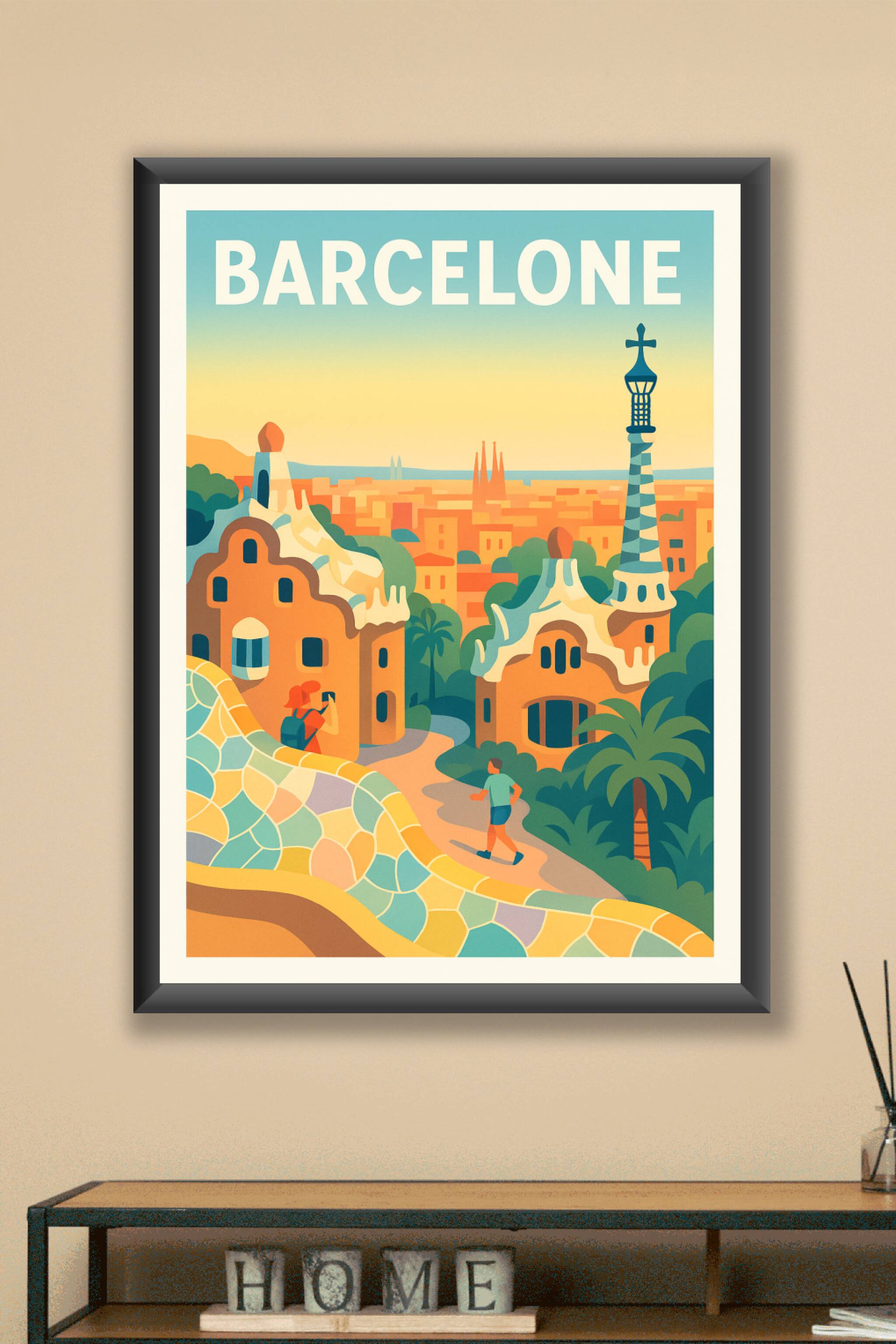 Découvrez l'atmosphère ensoleillée et colorée de Barcelone avec cette affiche illustrée qui met en avant l'iconique Parc Güell et ses formes organi...
