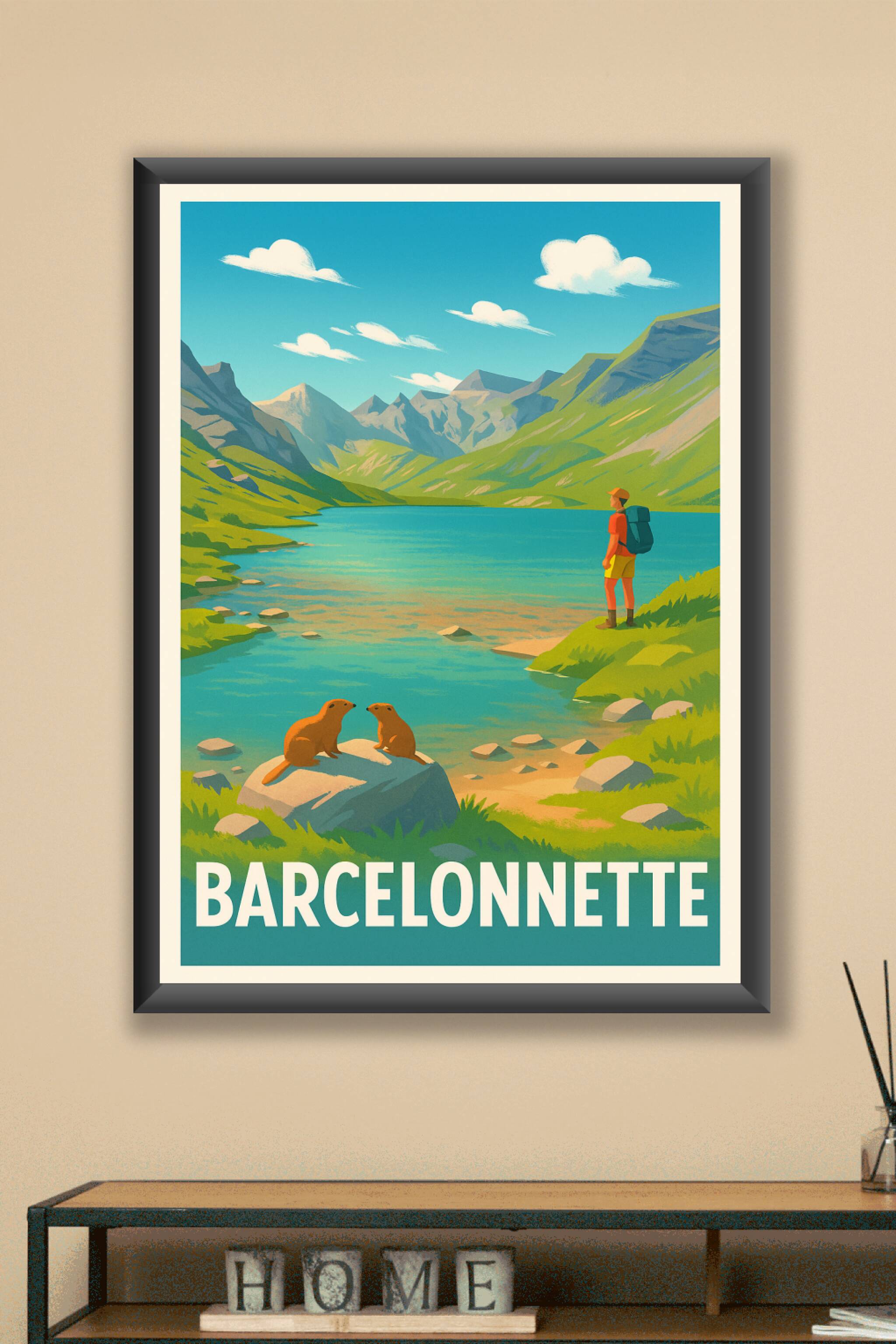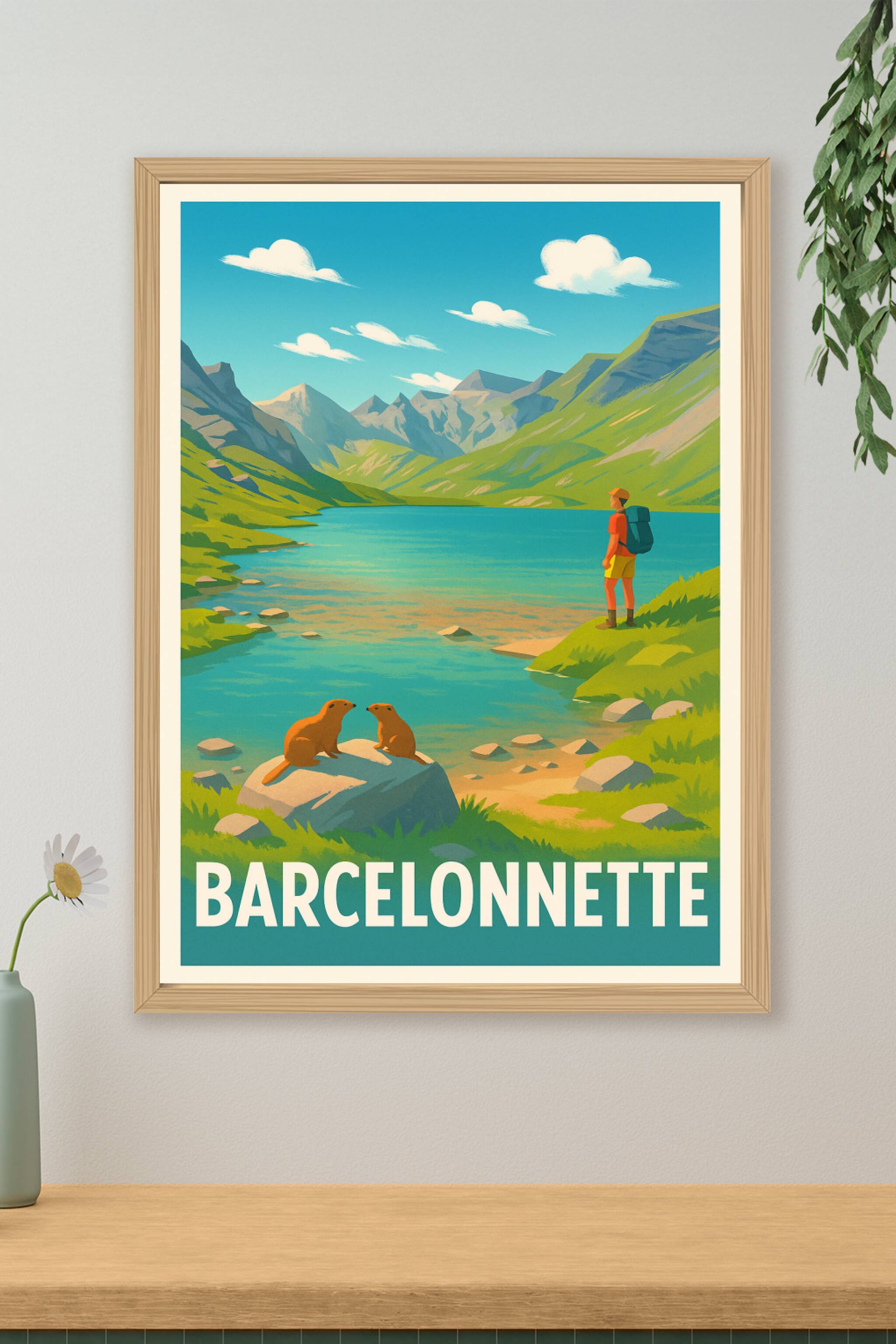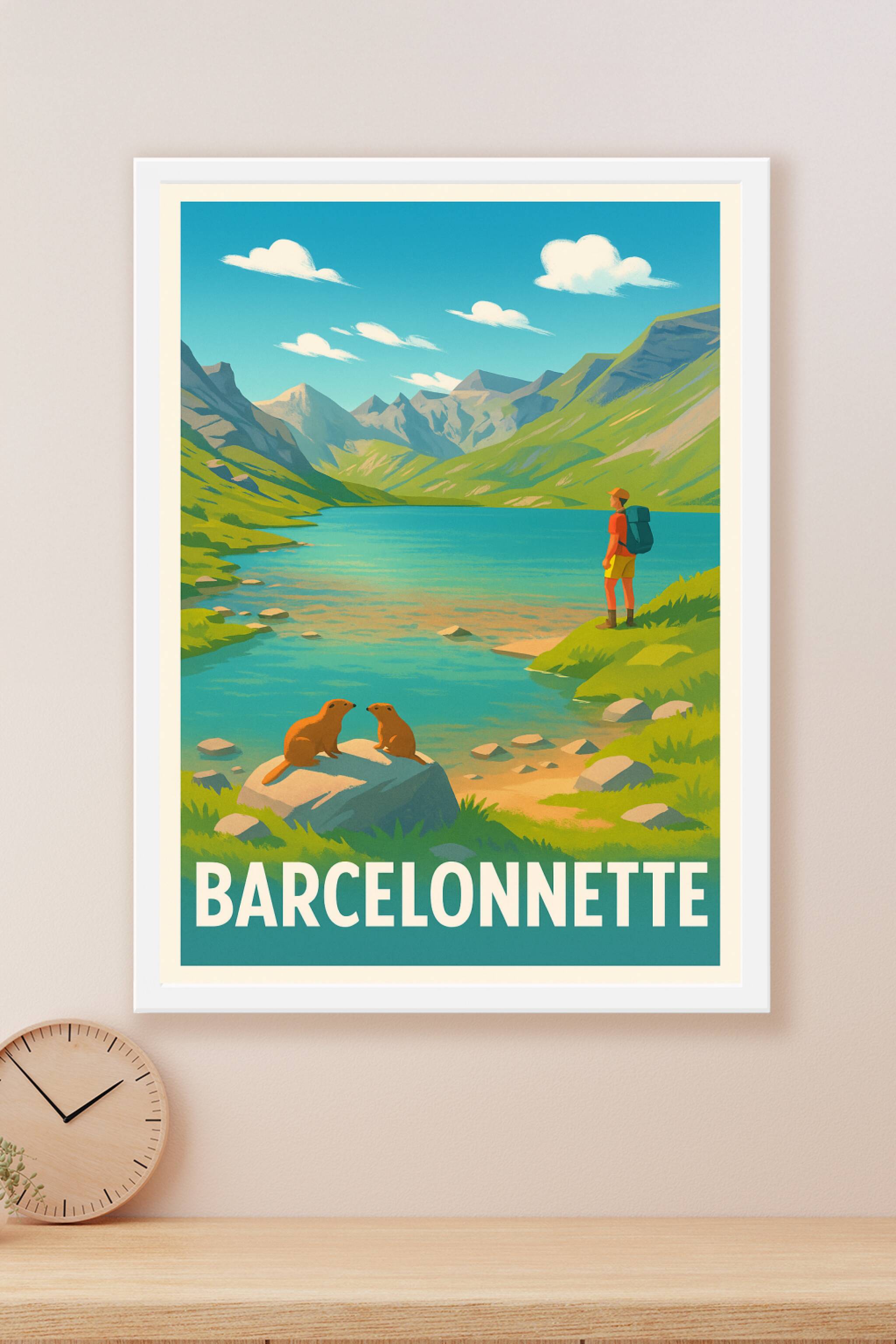 Découvrez la beauté naturelle des Alpes avec cette affiche inspirante de Barcelonnette, capturant un moment paisible au bord d'un lac entouré de mo...