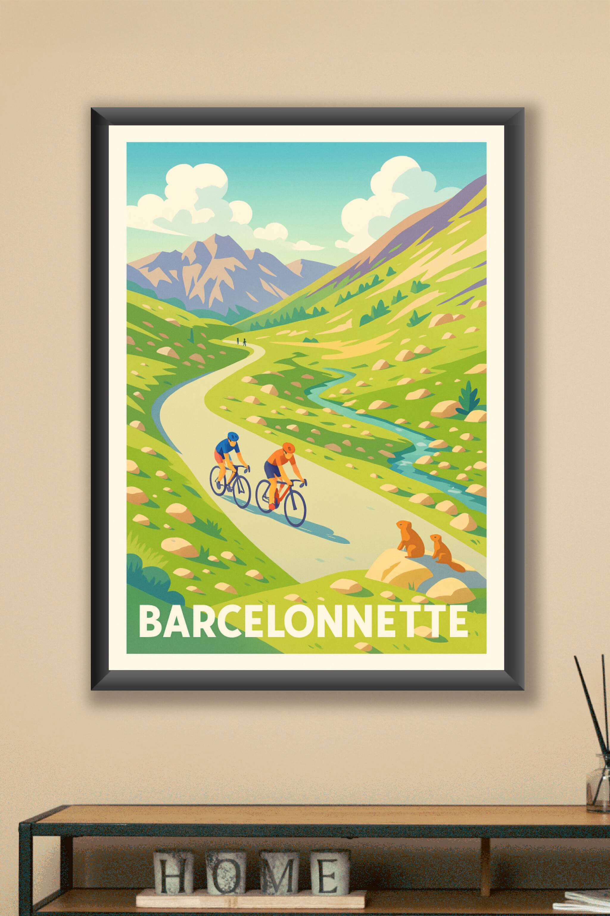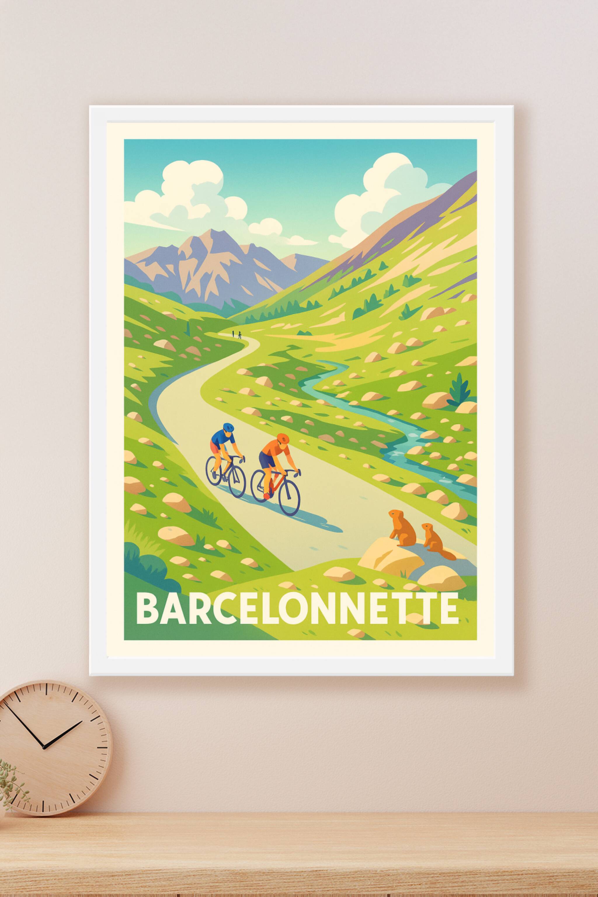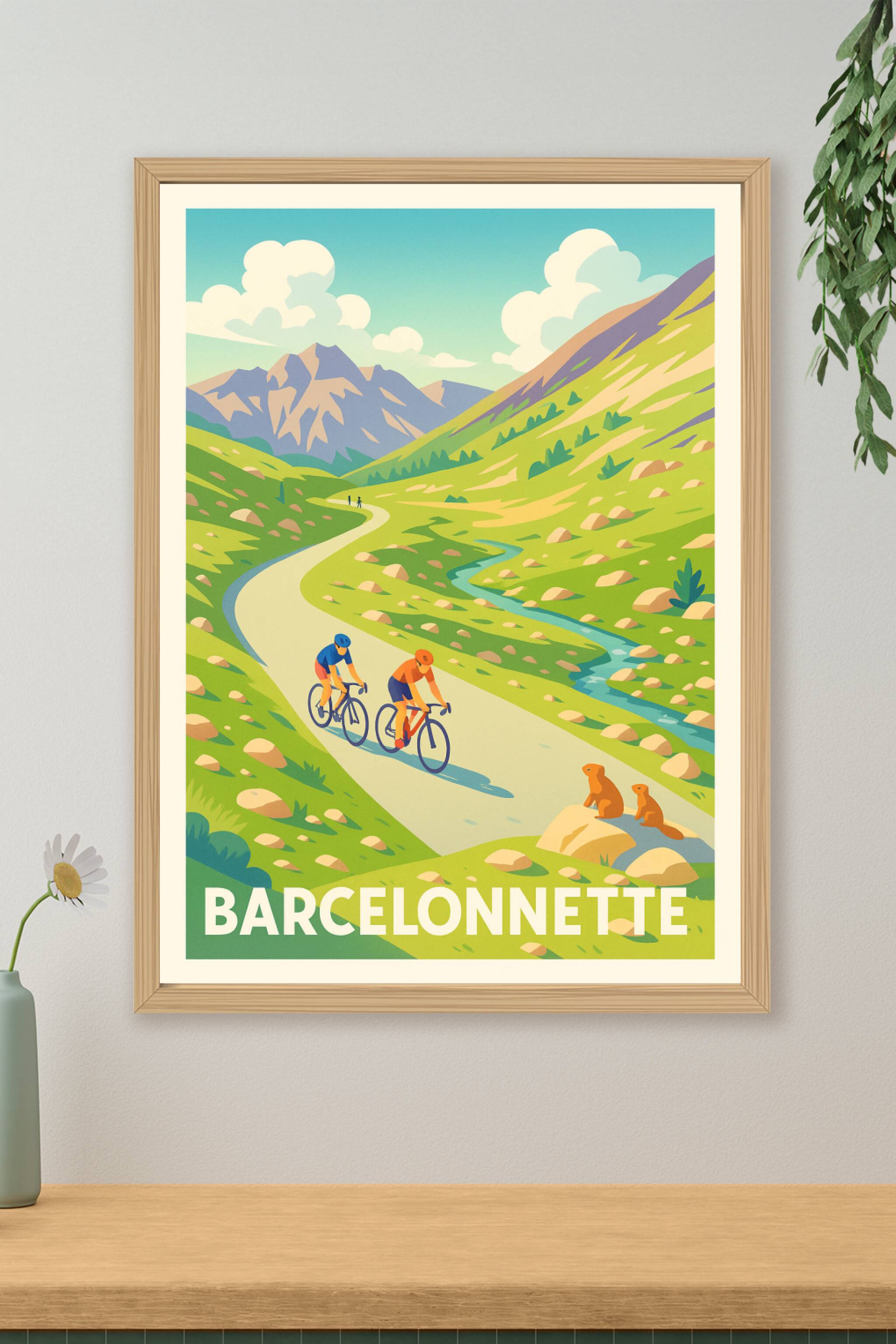 Découvrez la beauté sauvage et paisible de Barcelonnette à travers ce poster illustré qui capture l'essence des Alpes du Sud. Deux cyclistes sillon...