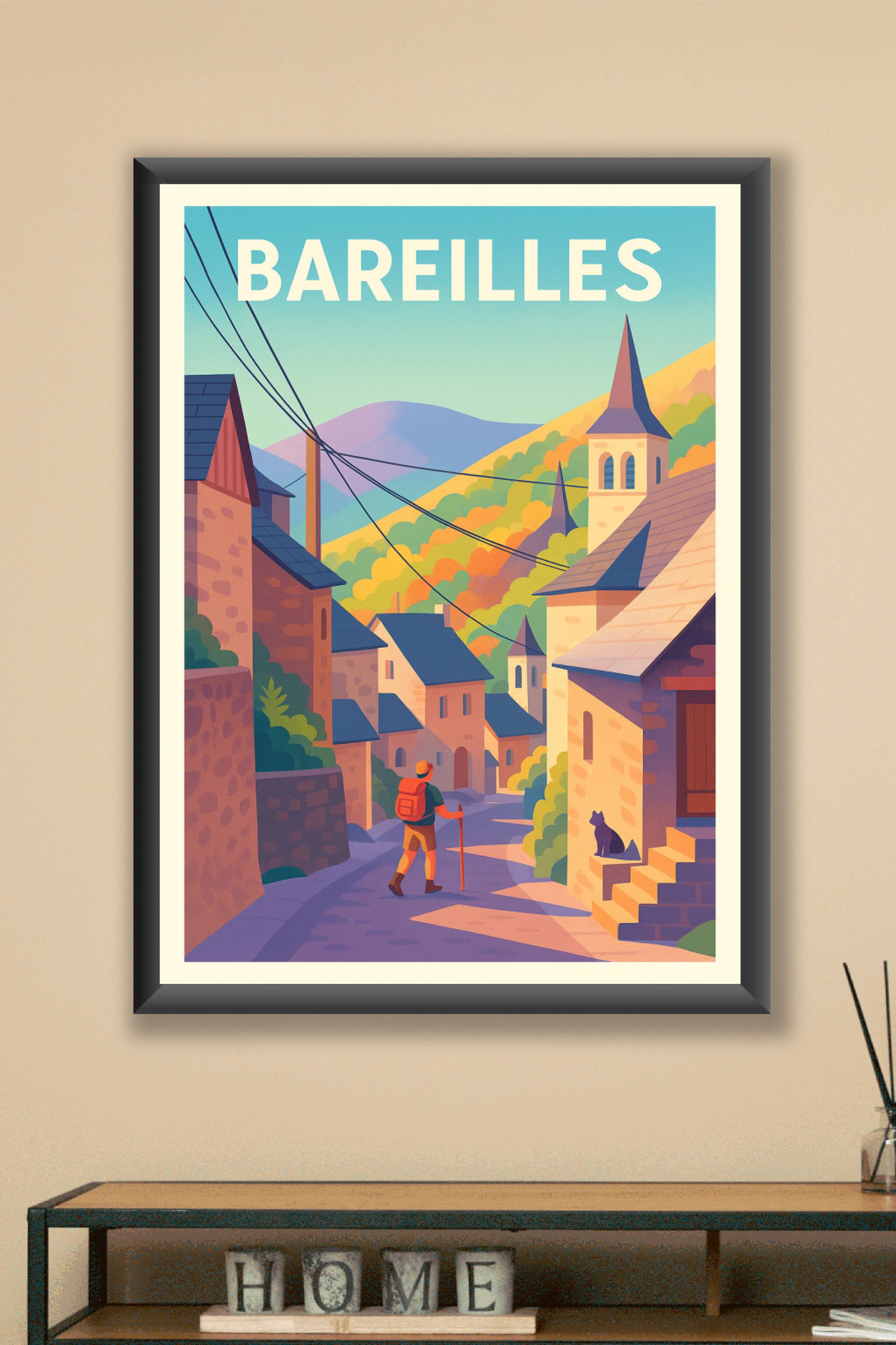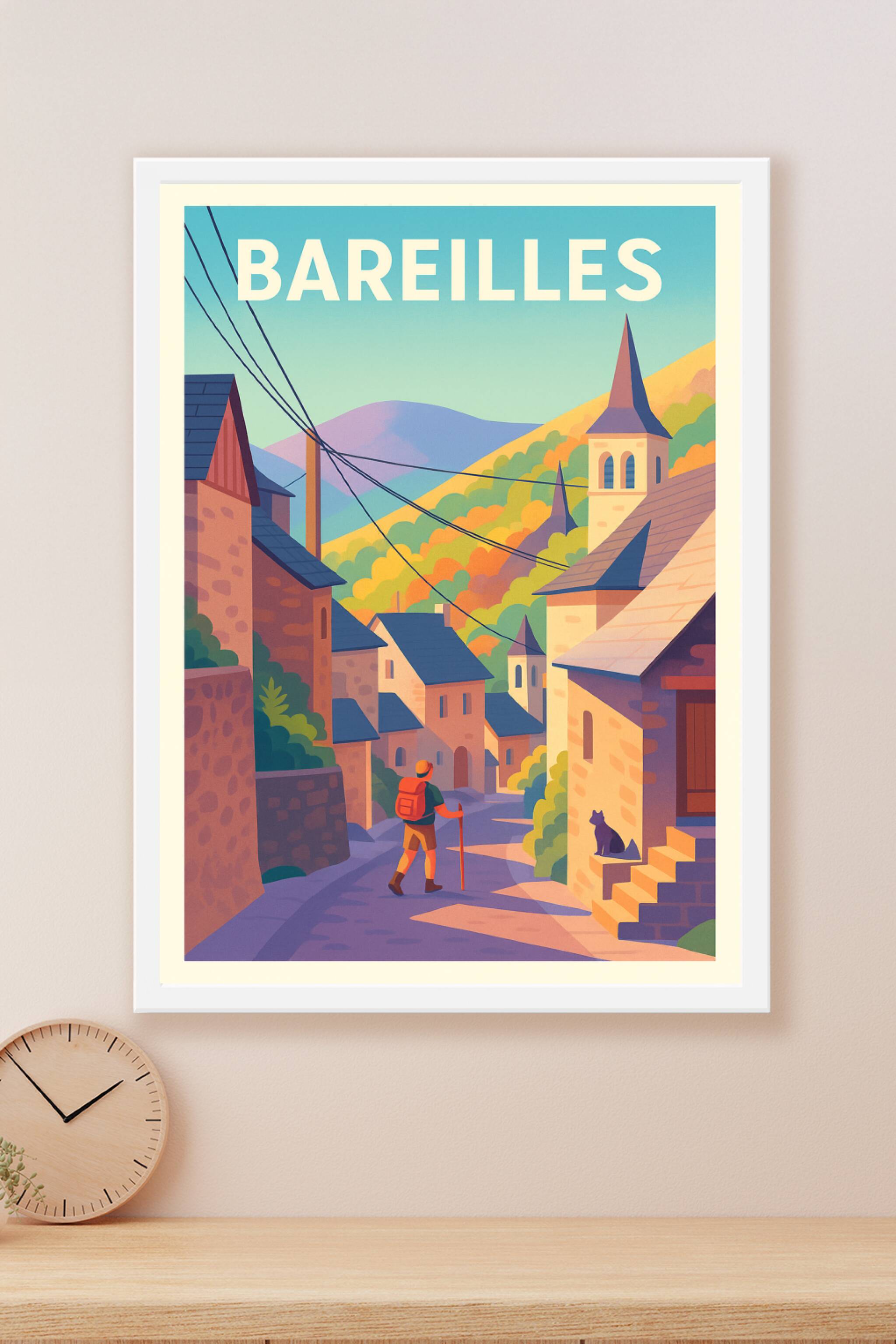 Laissez-vous transporter dans le charme authentique de Bareilles avec cette affiche illustrée aux tons doux et chaleureux, représentant un randonne...