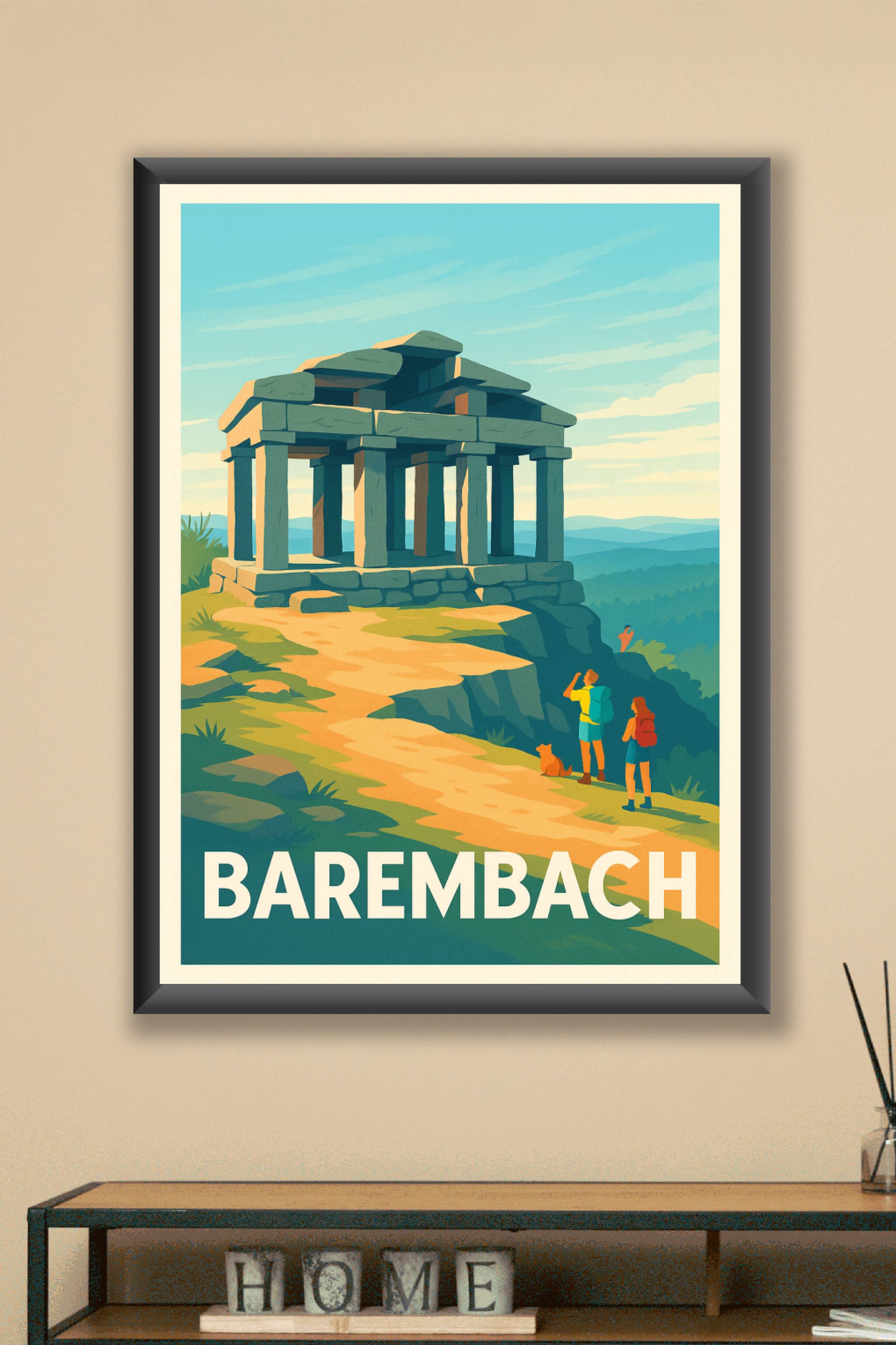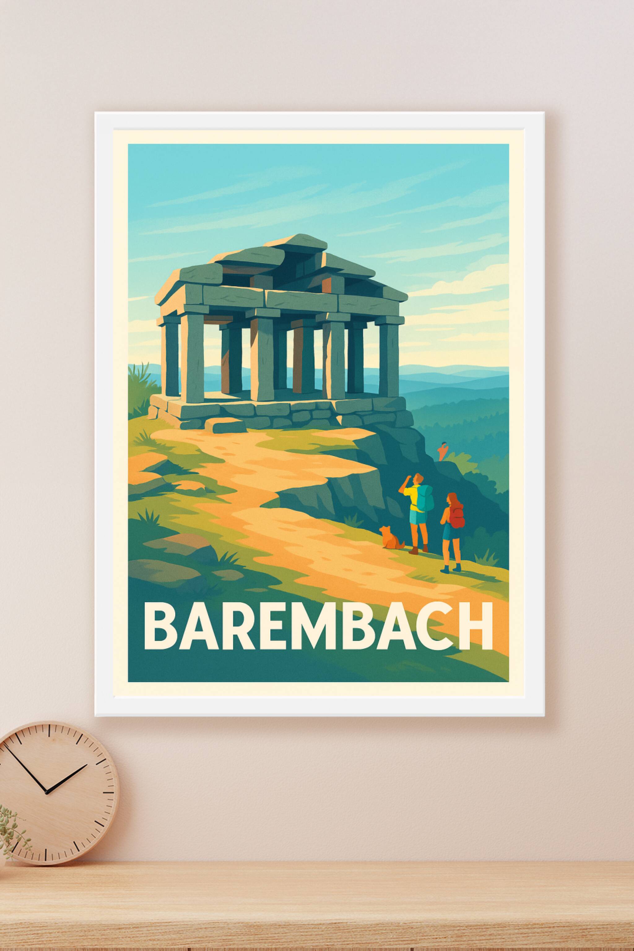 Découvrez la beauté sauvage et l'histoire fascinante de Barembach avec cette affiche vintage illustrant un temple antique surplombant un paysage mo...