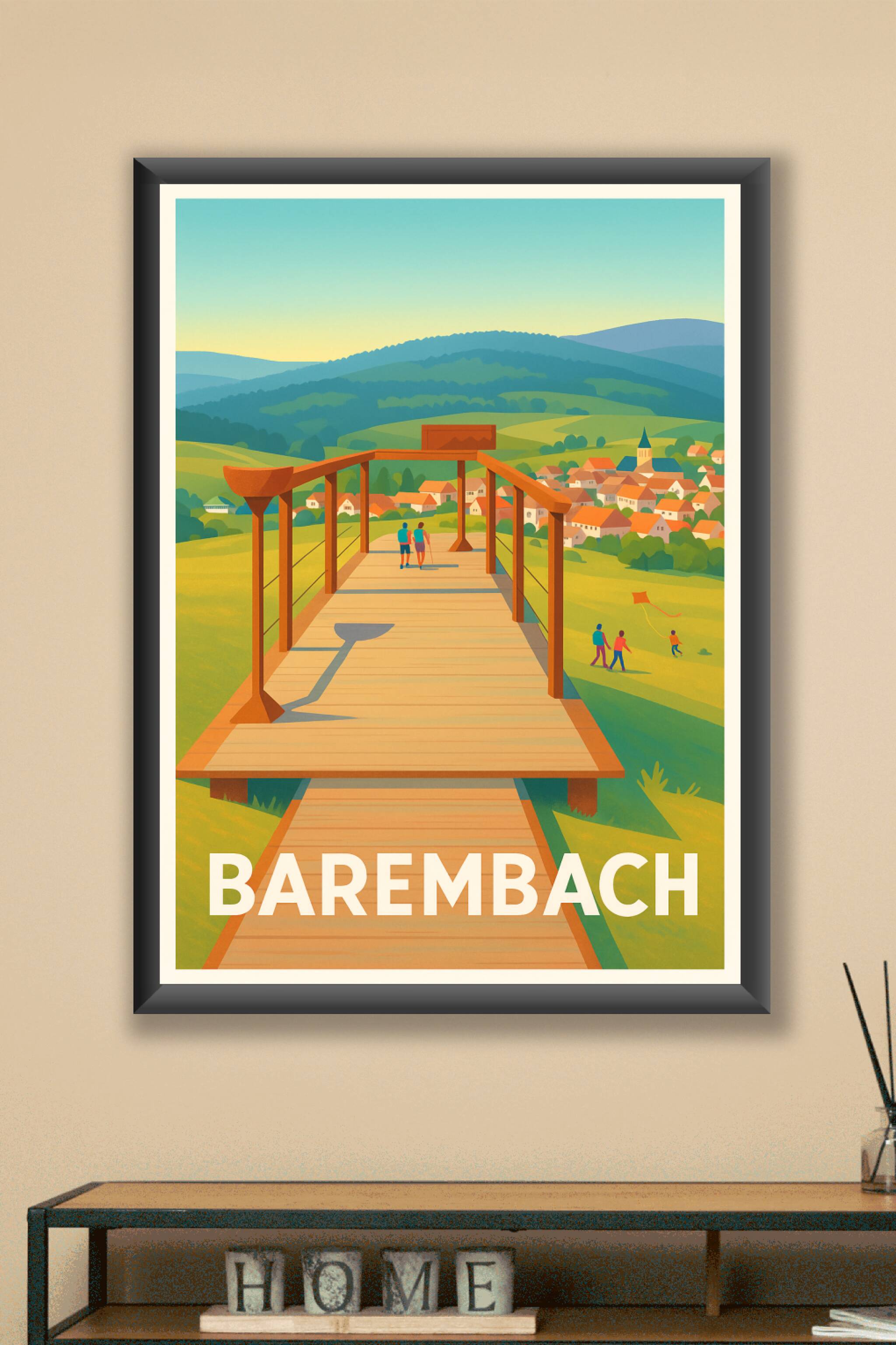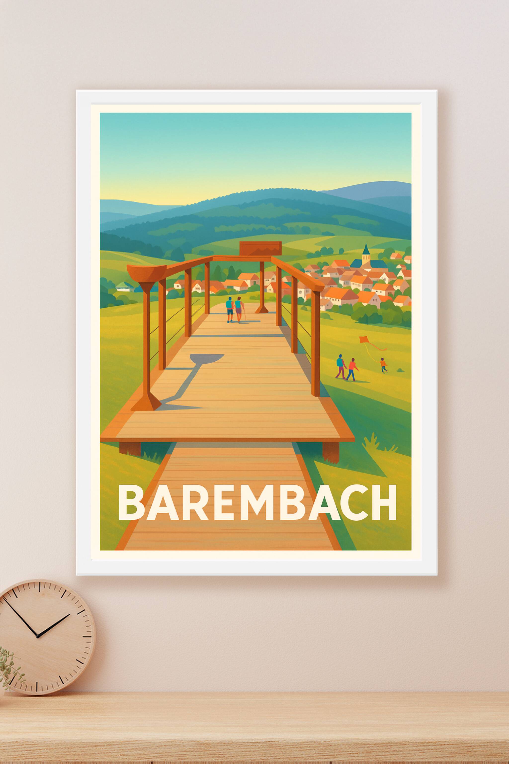 Découvrez la sérénité de Barembach avec ce poster au style lumineux et chaleureux, mettant en avant un belvédère en bois surplombant un paysage val...