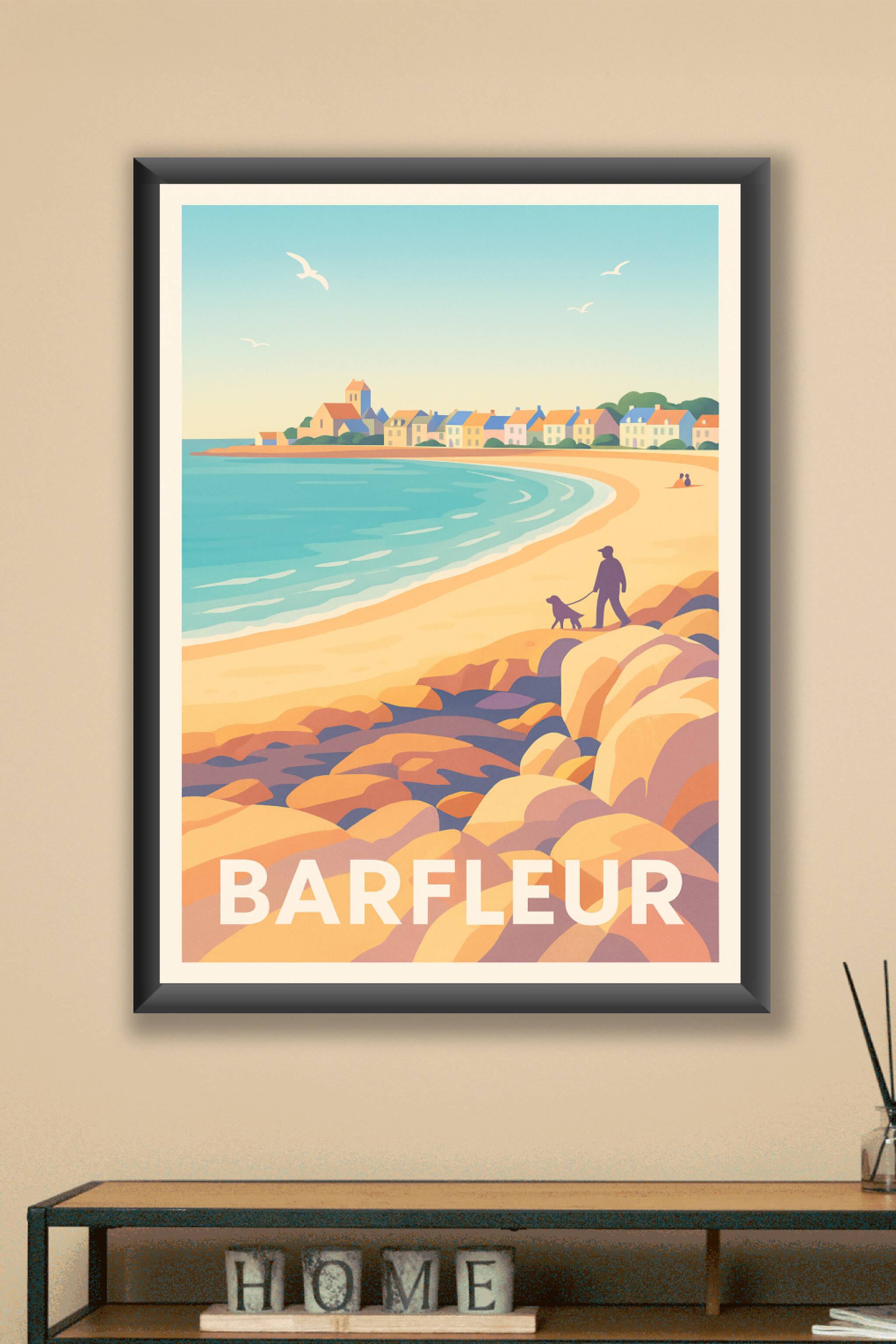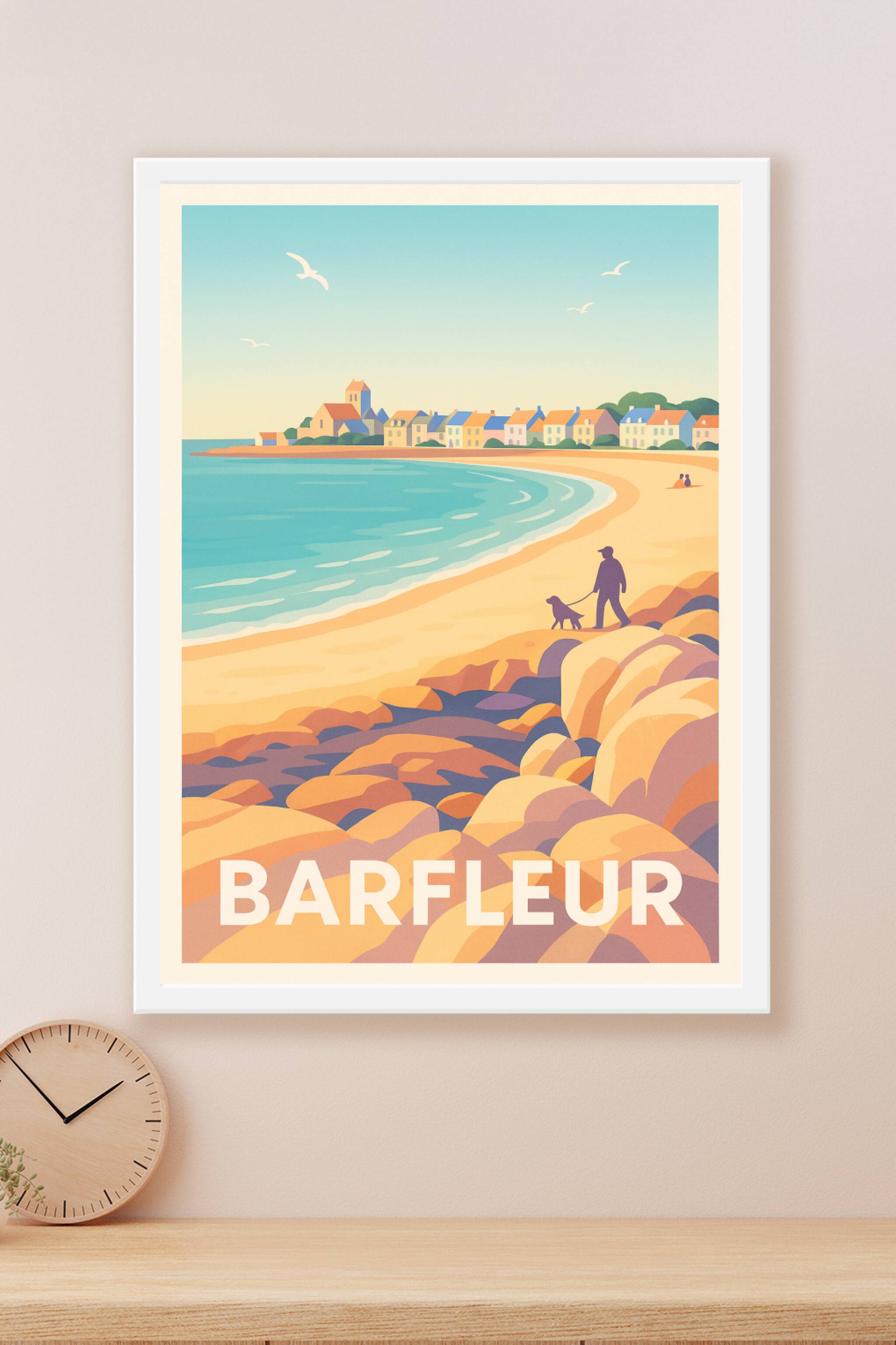 Découvrez l'élégance paisible de Barfleur à travers cette affiche vintage au style doux et coloré. Cette scène idyllique montre la plage et les maisons traditionnelles de ce charmant port normand, invitant à la sérénité et aux balades au bord de la mer.Ce poster est imprimé en tirage "Fine Art" sur un papier 305g coton, garantissant une qualité d'impression remarquable et une excellente tenue dans le temps. Disponible du format A1 à A4, avec ou sans cadre, cette affiche s'intègre parfaitement à toutes les décorations d'intérieur.Sublimez votre espace avec ce tirage premium 100% fabriqué en France, parfait pour les amoureux de la mer et de Barfleur, ou pour offrir un souvenir raffiné et authentique.