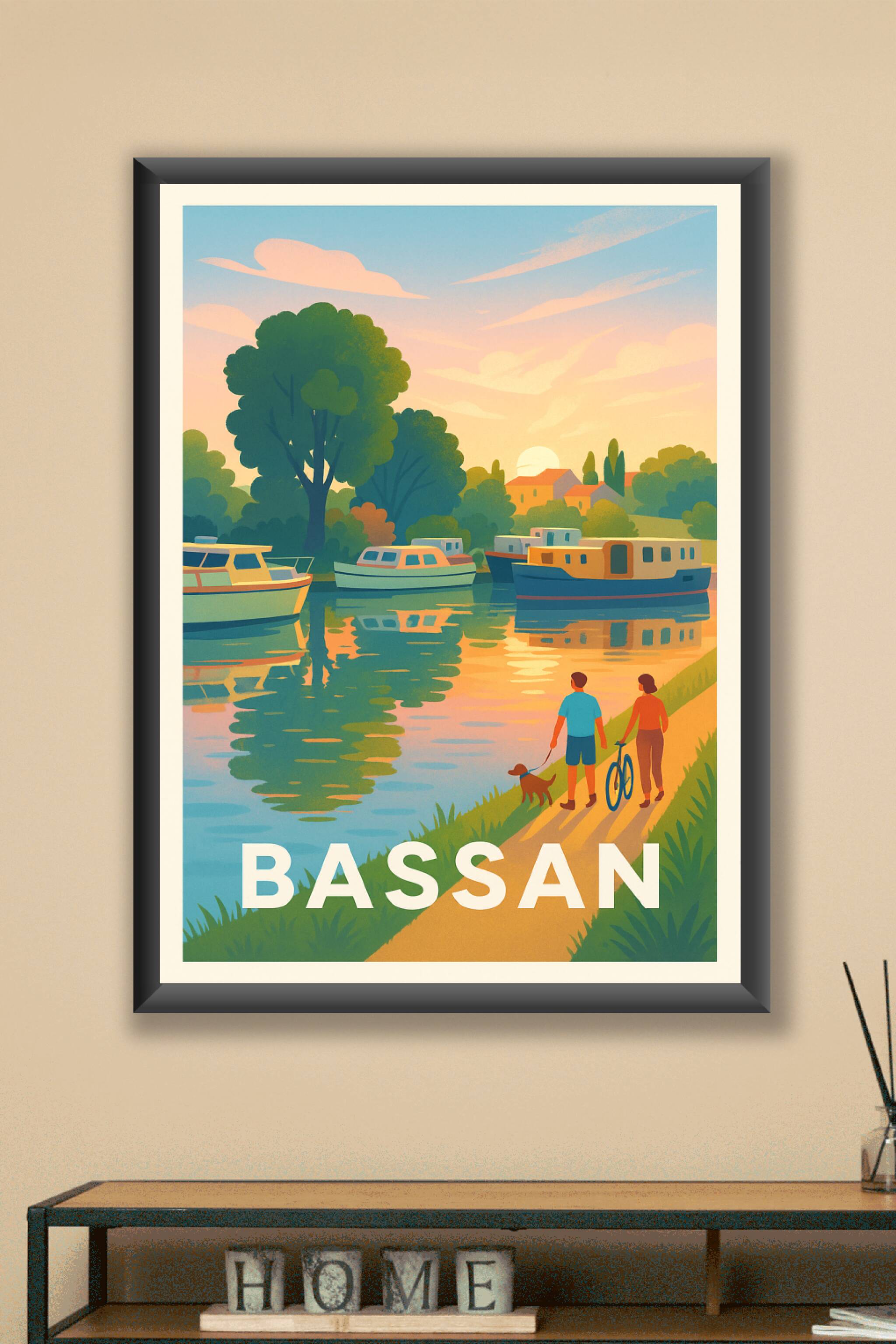 Découvrez la douceur et la sérénité de Bassan avec cette affiche illustrée mettant en scène un couple se promenant en fin de journée le long d'un c...