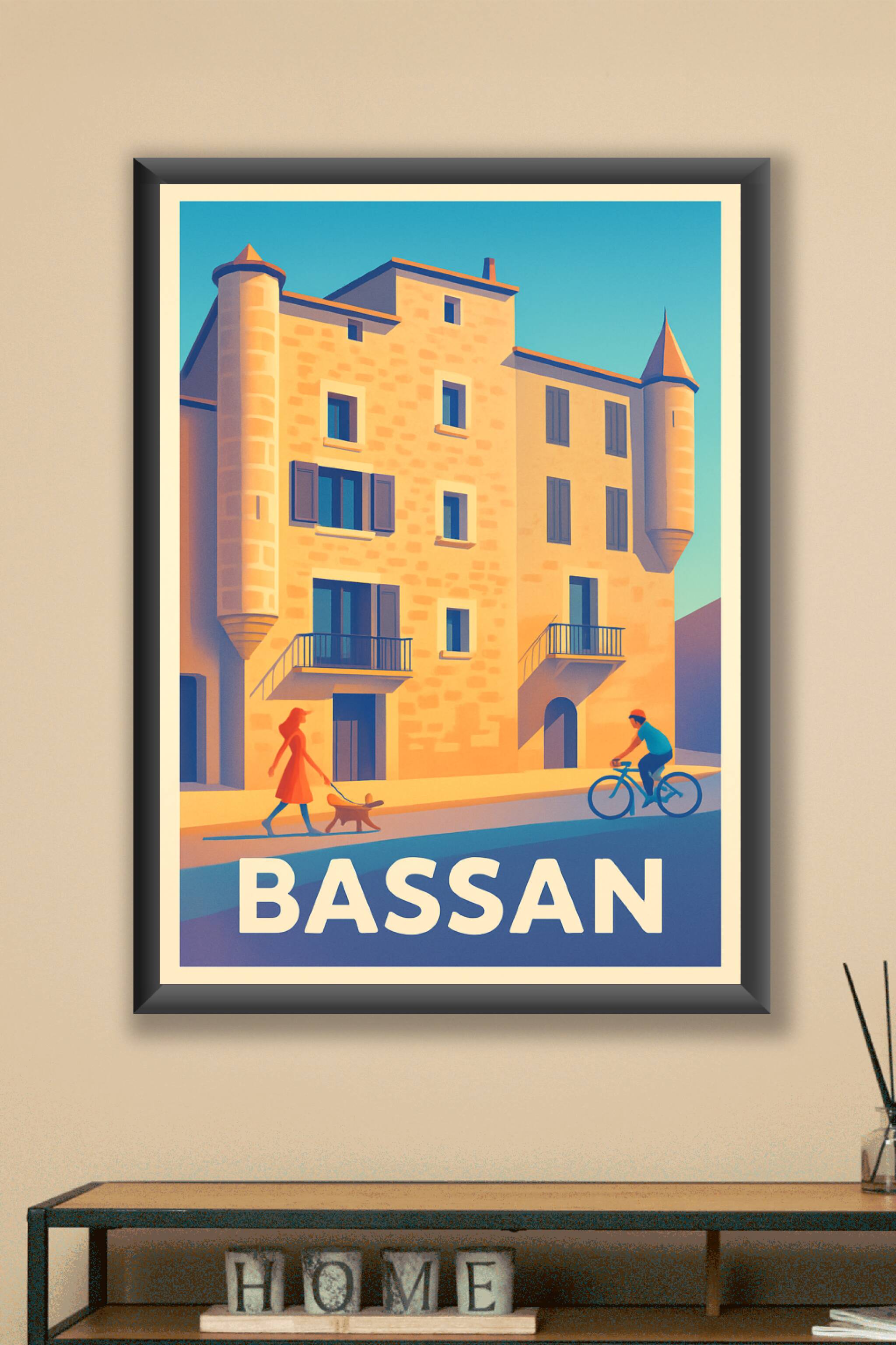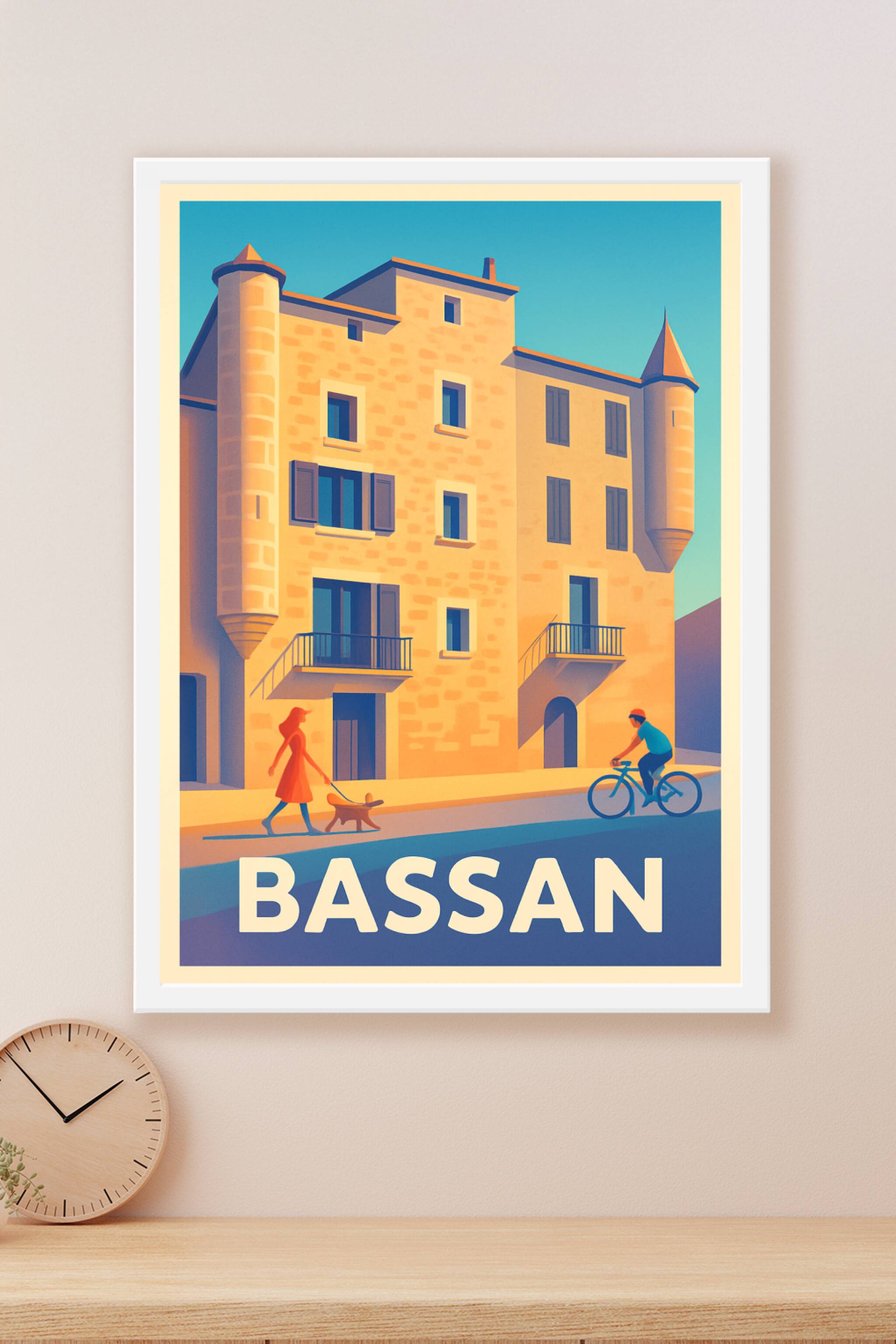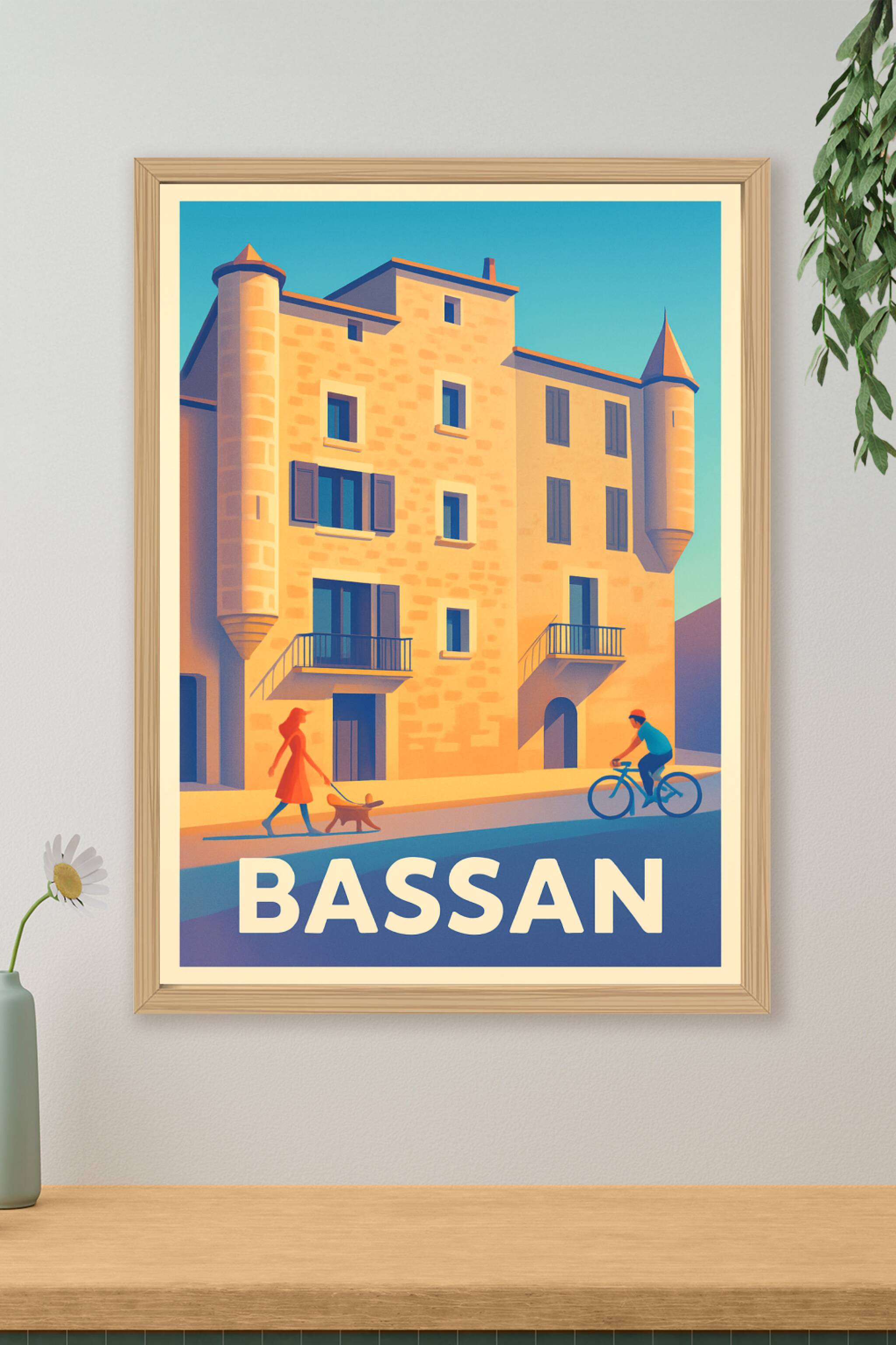 Découvrez le charme typique du village de Bassan avec cette affiche au style vintage et lumineux. Le poster illustre une scène de vie paisible où p...