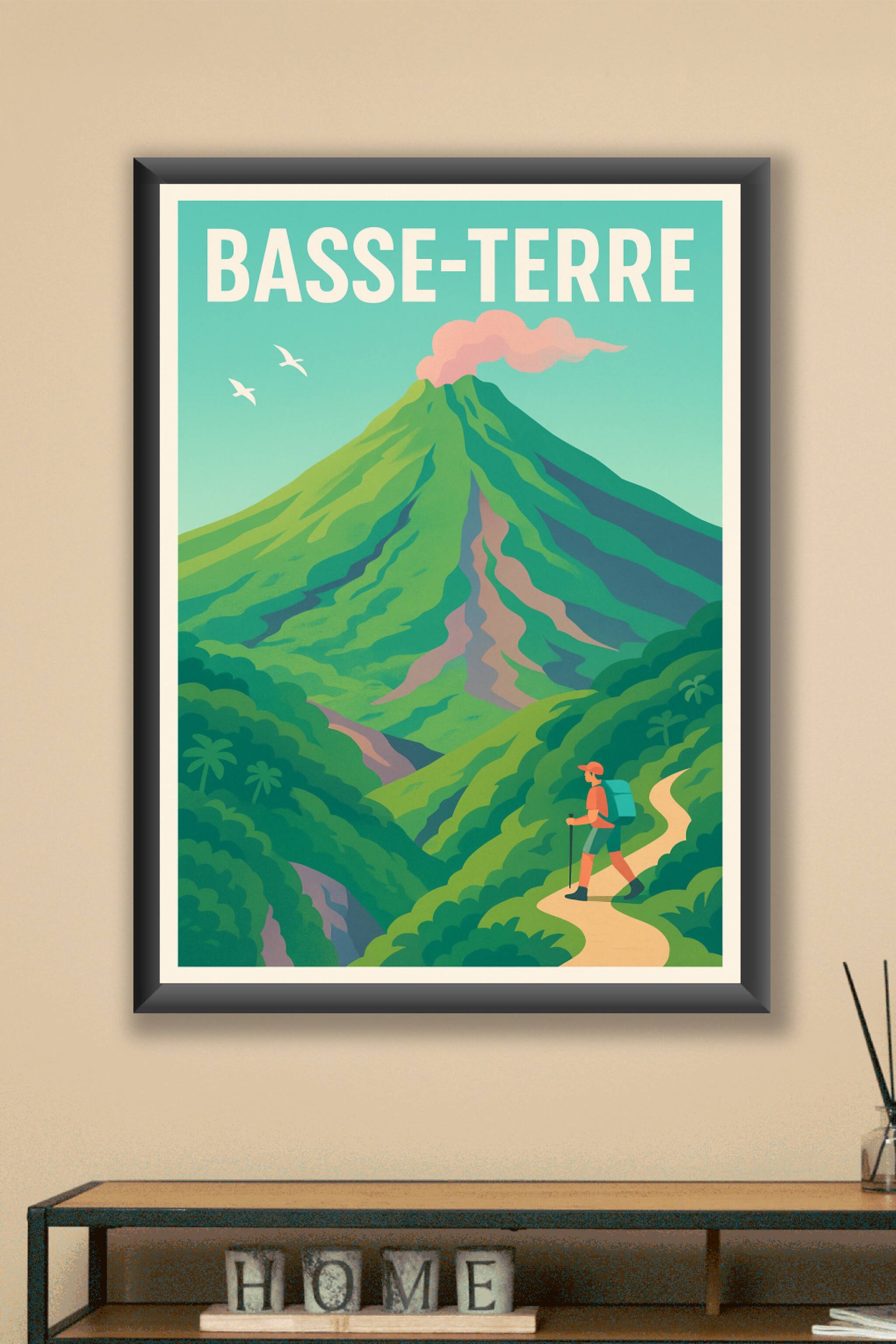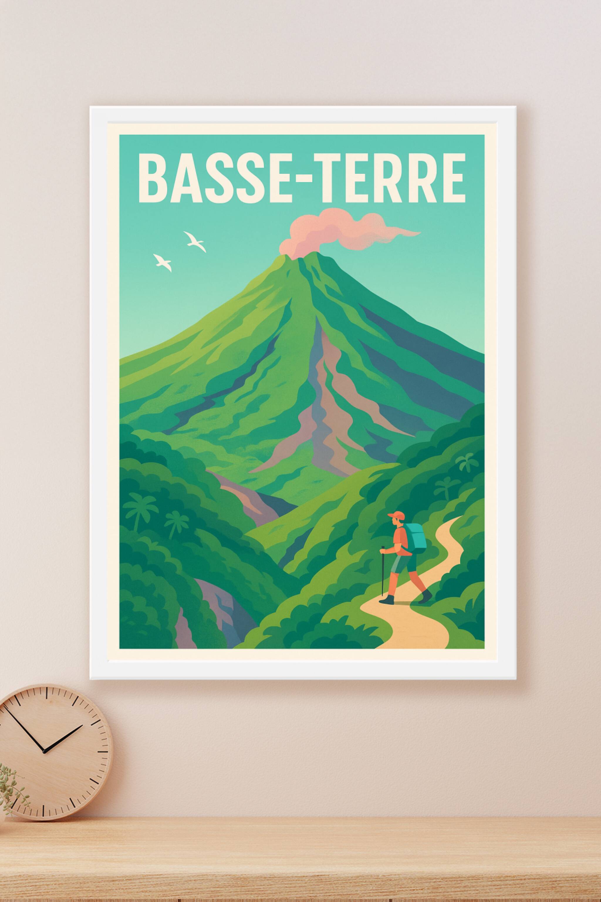 Explorez la majesté naturelle de Basse-Terre avec cette affiche illustrée représentant son célèbre volcan en pleine activité, entouré d'une végétat...