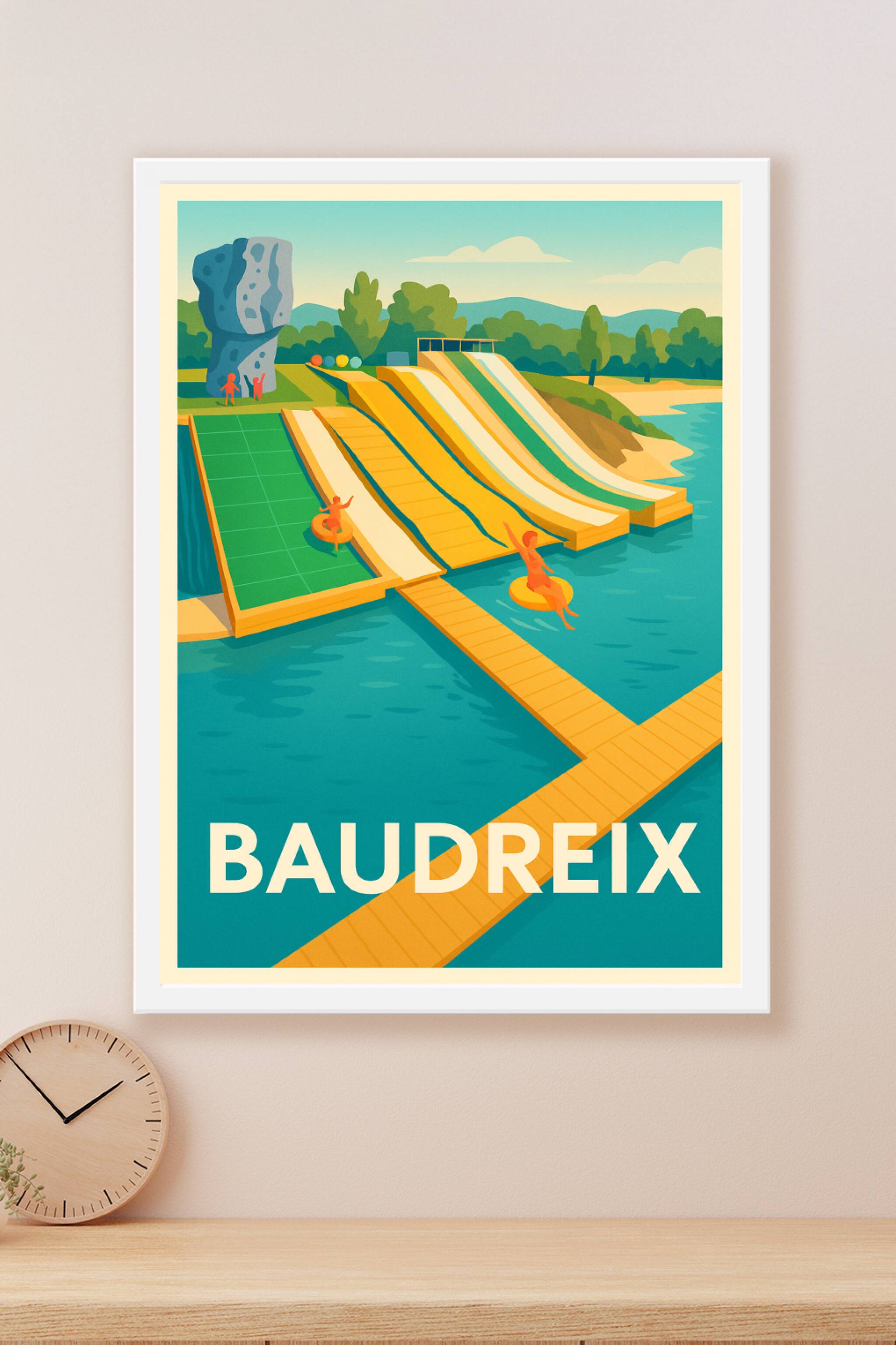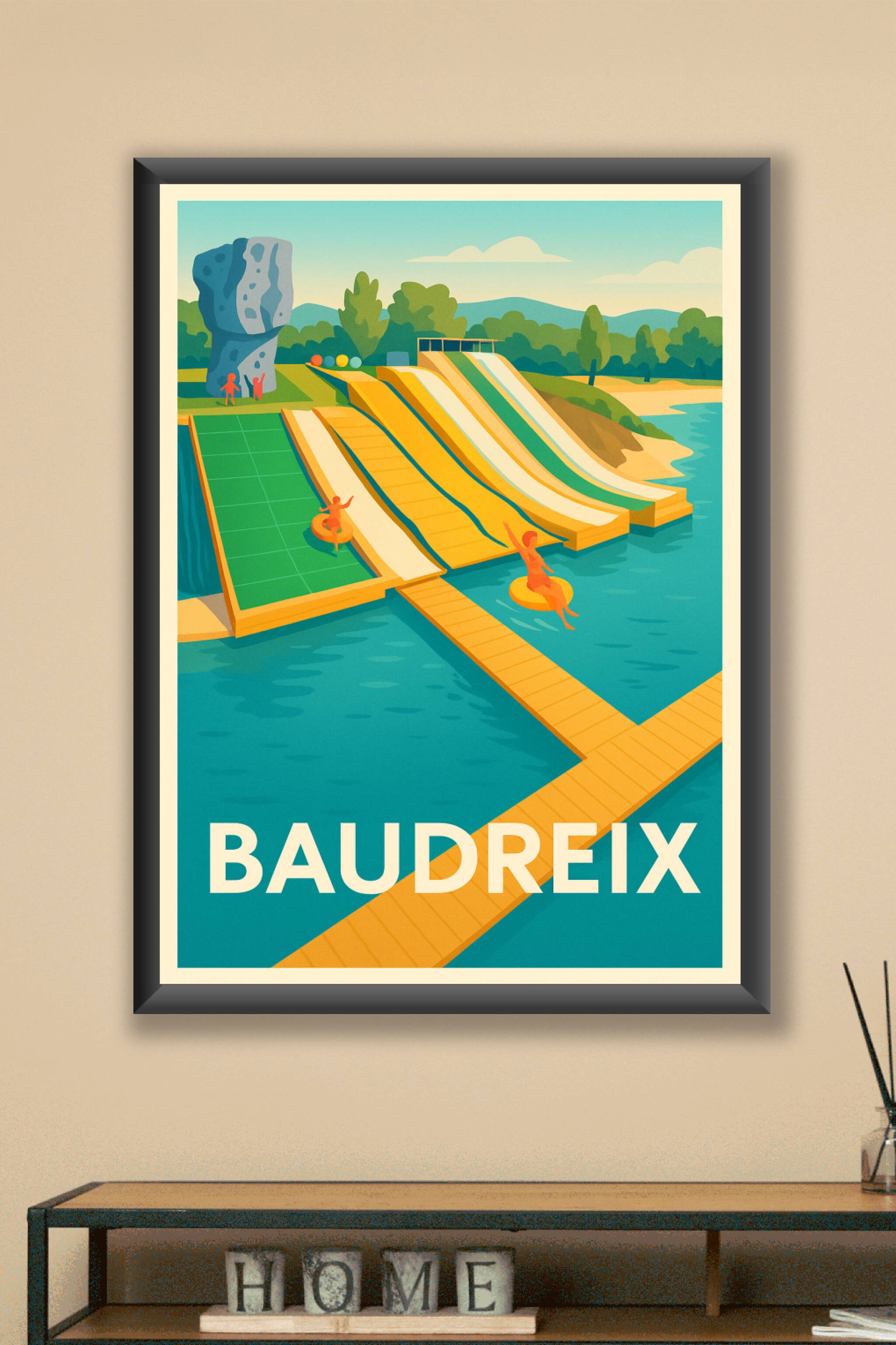 Découvrez l'esprit estival et ludique de Baudreix avec cette affiche illustrée mettant en scène des toboggans aquatiques colorés au bord d'un lac. ...