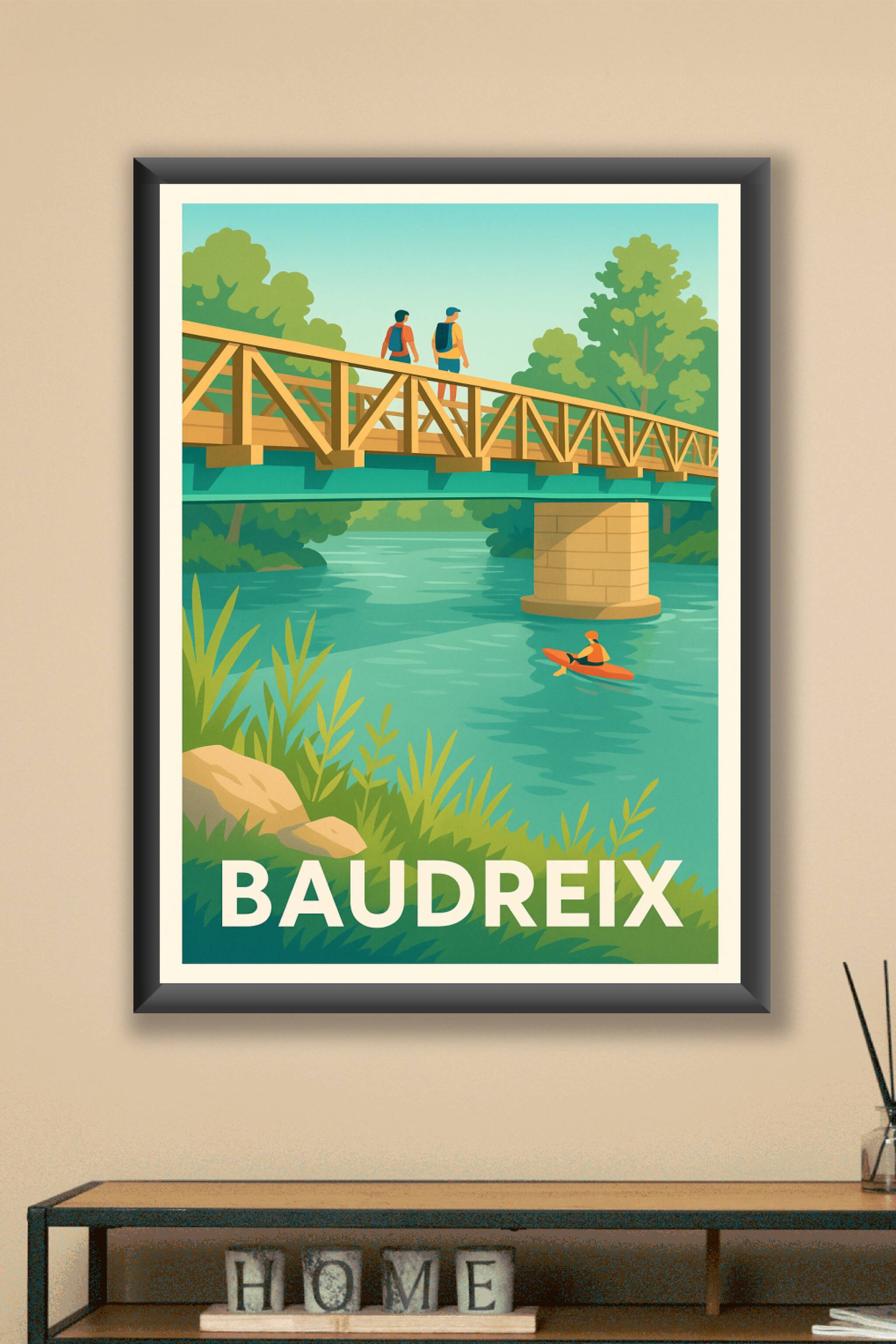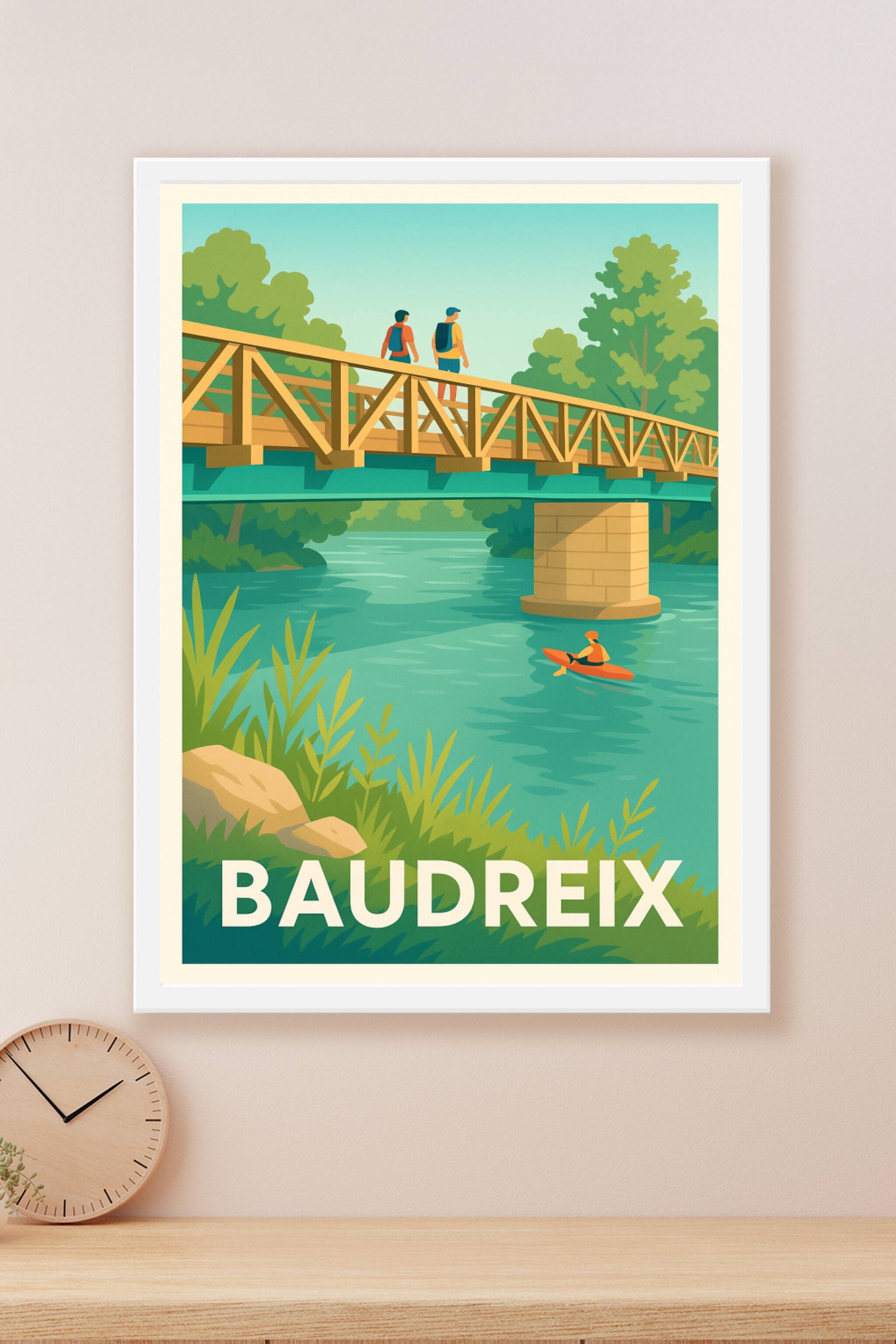 Découvrez la sérénité de Baudreix avec cette affiche au style illustratif doux et coloré, mettant en scène un pont en bois traversant une rivière p...