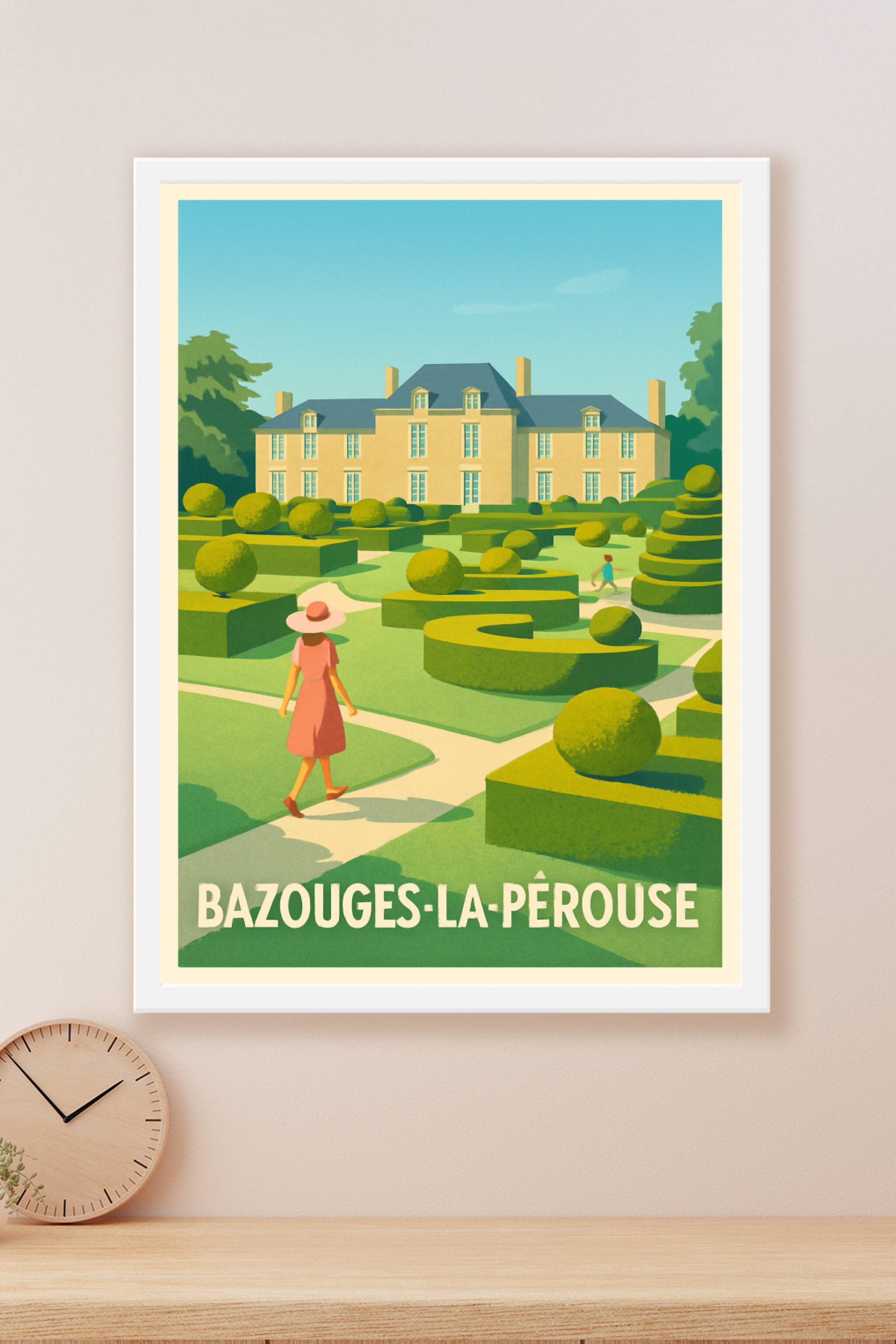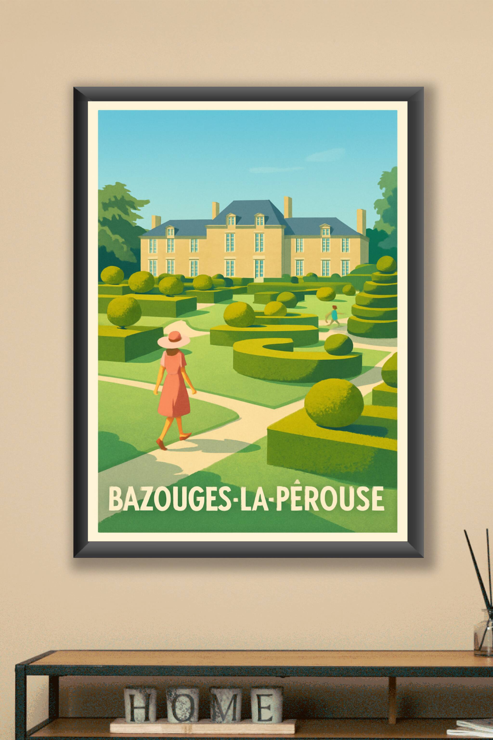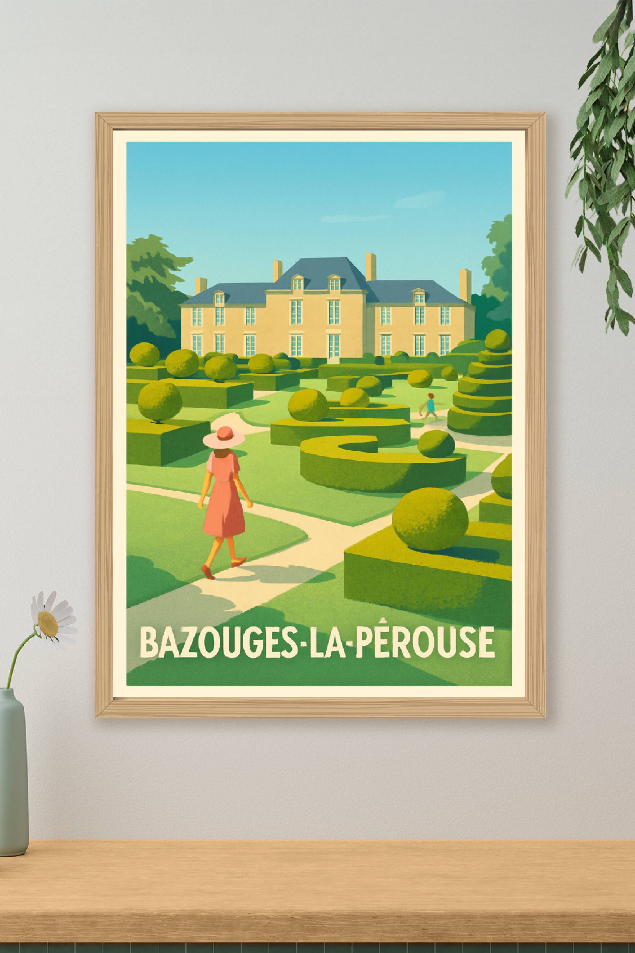 Découvrez la sérénité et l'élégance des jardins à la française de Bazouges-la-Pérouse à travers cette affiche vintage illustrée. Un magnifique post...