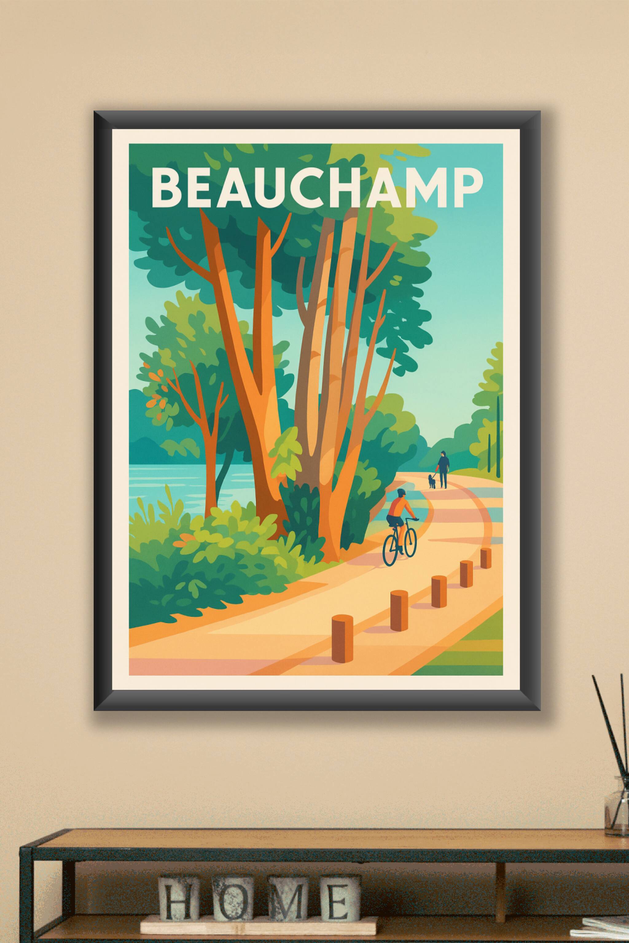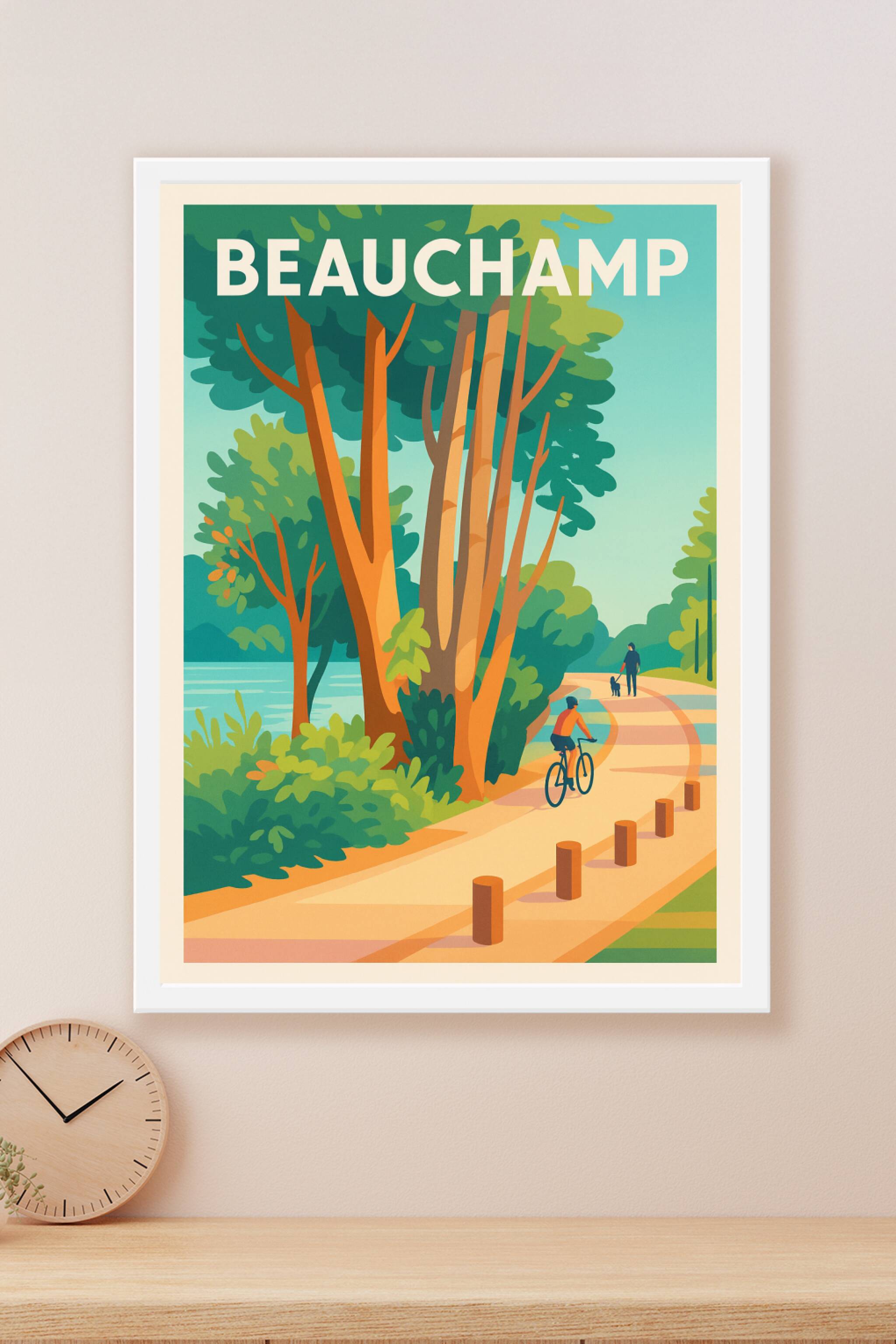 Découvrez la beauté paisible de Beauchamp avec cette affiche illustrée qui capture une balade tranquille au bord de l'eau, entourée de verdure luxu...