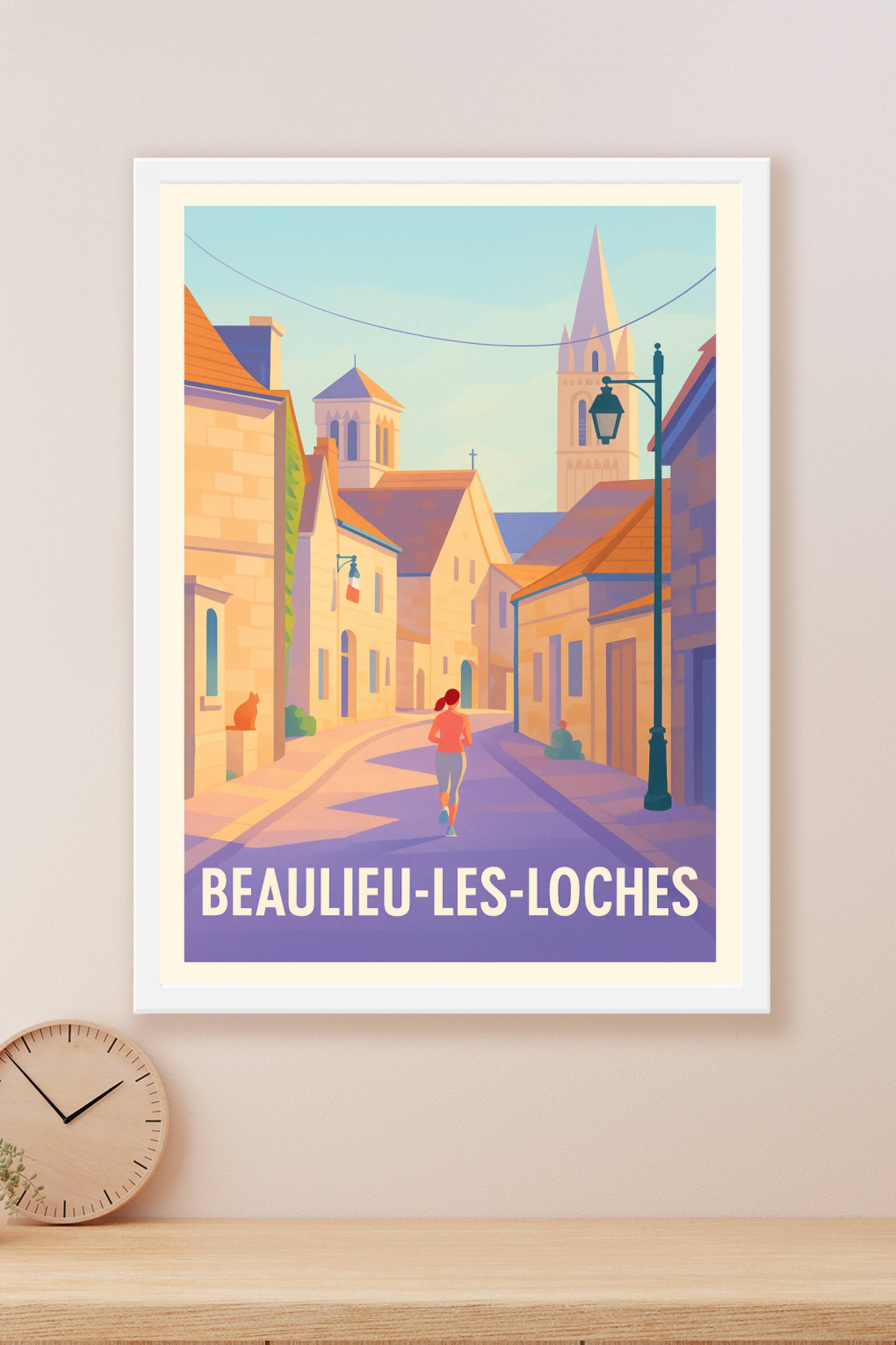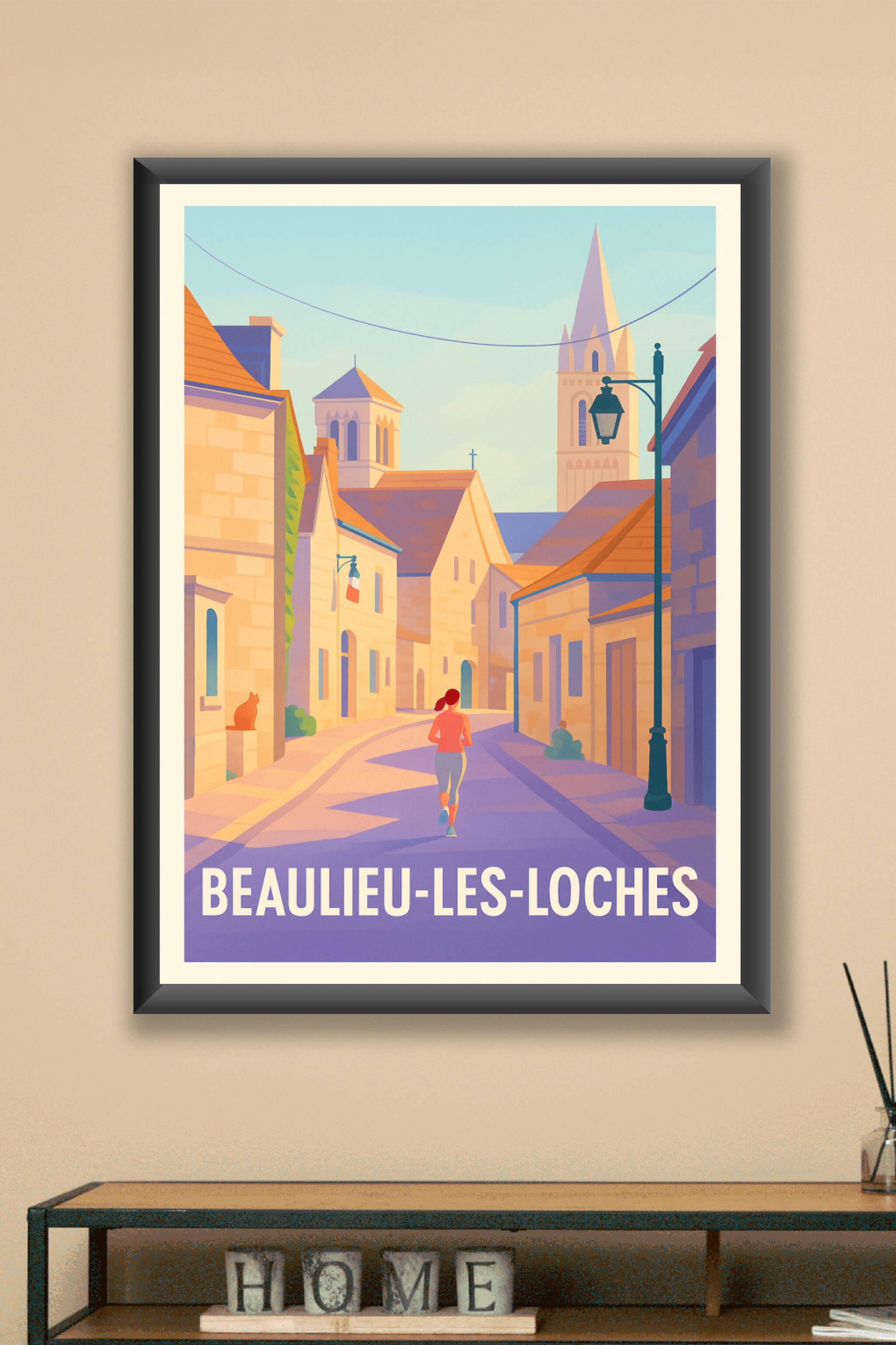 Découvrez l'atmosphère paisible et ensoleillée de Beaulieu-les-Loches à travers cette affiche au style vintage et doux. Le poster illustre une rue ...
