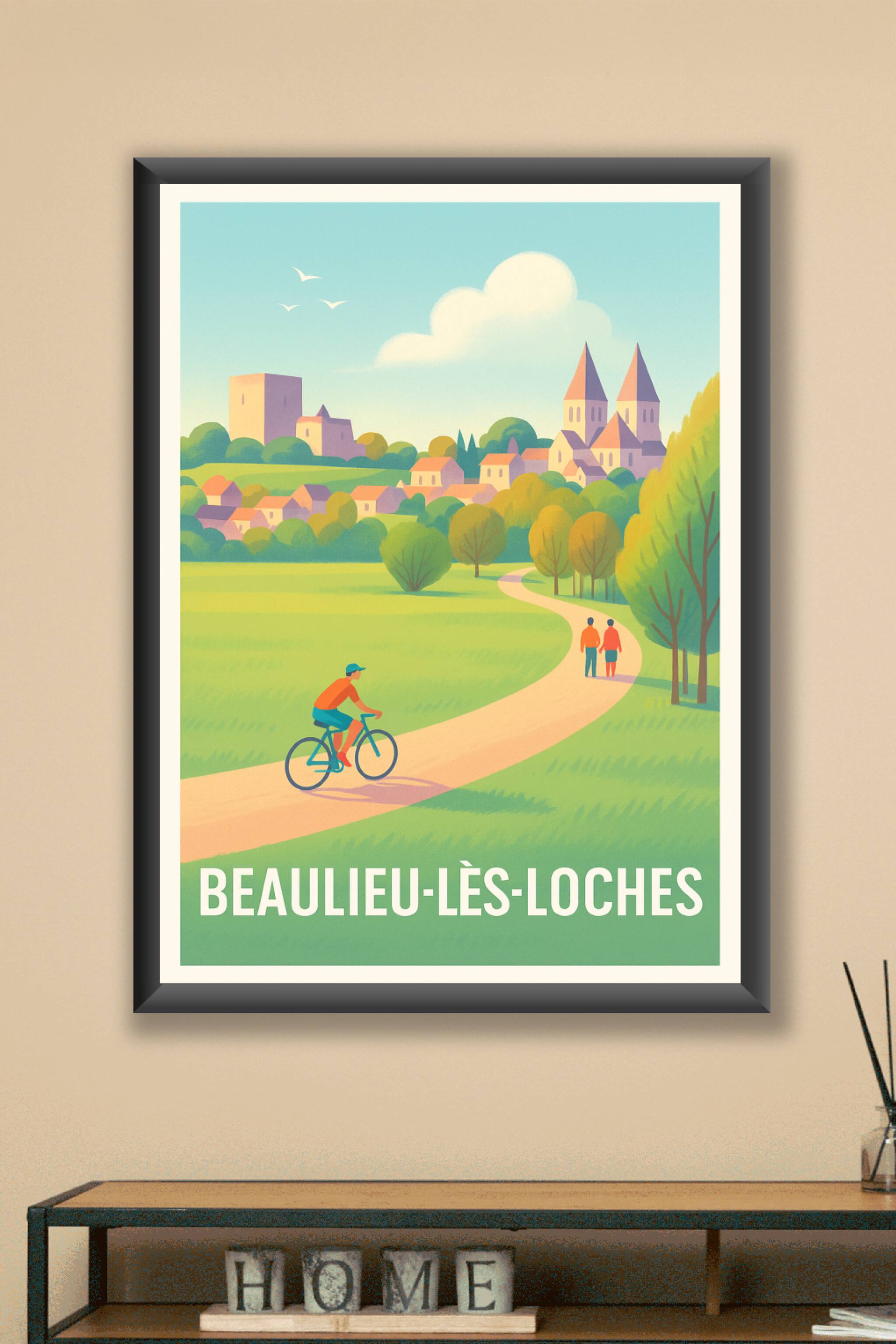 Découvrez la douceur de vivre de Beaulieu-lès-Loches avec cette affiche illustrée qui invite à la promenade sur les sentiers verdoyants bordés d’arbres et de maisons pittoresques. Cette scène paisible met en valeur le charme naturel de la campagne et les silhouettes emblématiques des édifices anciens en arrière-plan. Ce poster, imprimé en tirage "Fine Art" sur papier 305g coton de haute qualité, garantit des couleurs éclatantes et une finition matte élégante. Disponible en plusieurs formats de A1 à A4, avec ou sans cadre, il s’adapte parfaitement à votre intérieur pour apporter une touche de sérénité et d’authenticité. Offrez-vous ou offrez à un proche une décoration raffinée et pleine de poésie, 100% fabriquée en France.