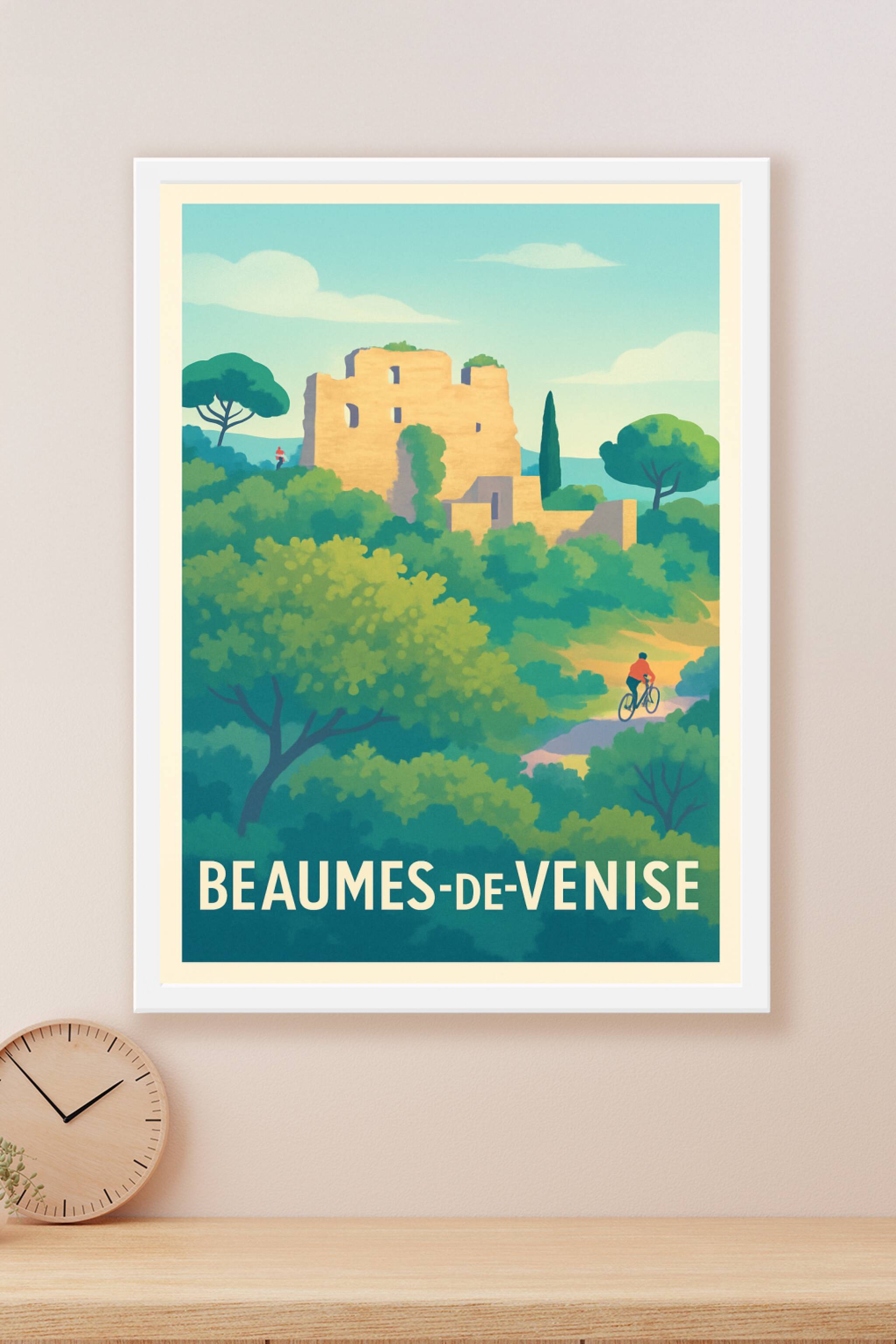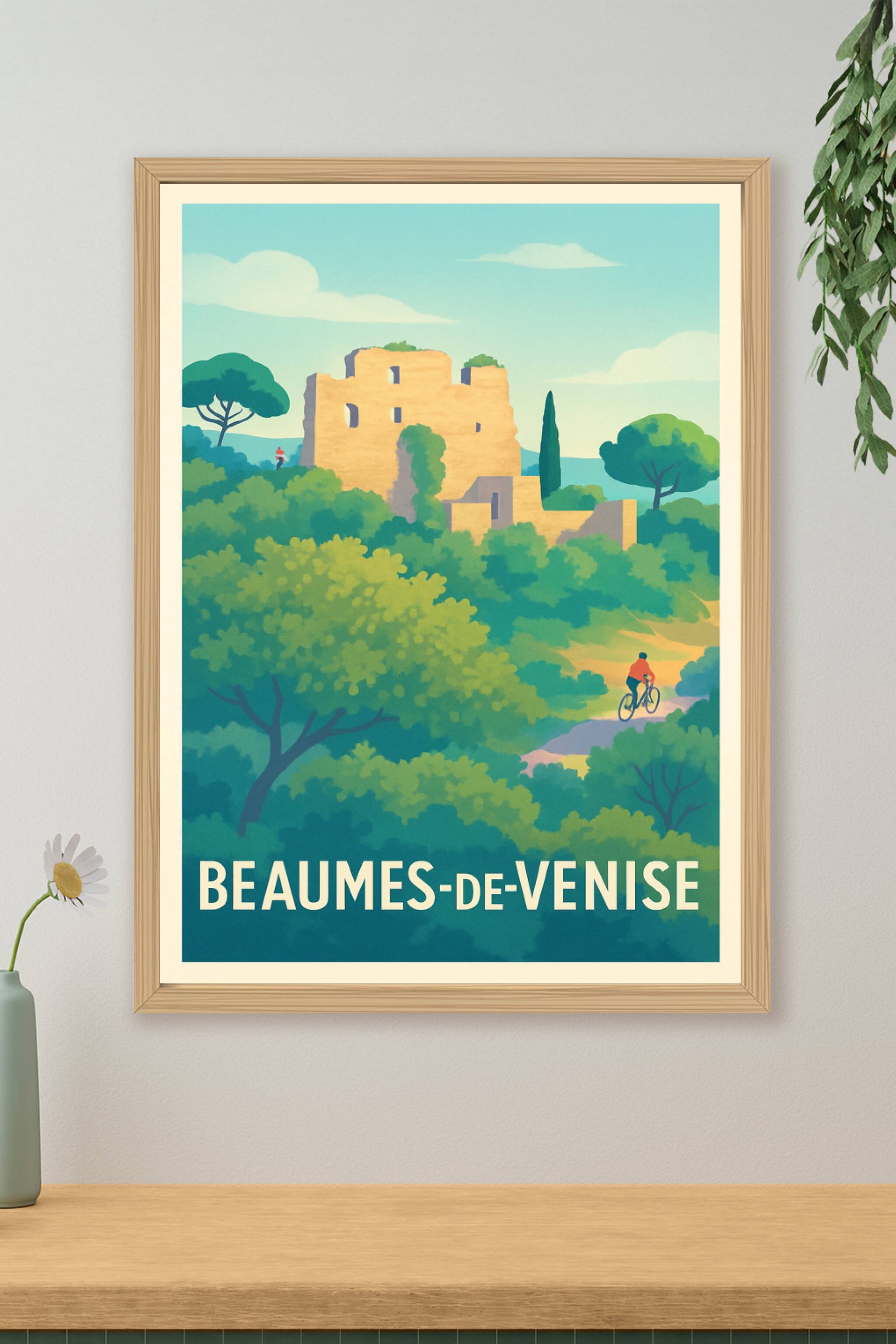 Découvrez Beaumes-de-Venise à travers cette affiche inspirante qui capture la beauté authentique de ses paysages ruraux et de ses vestiges anciens. Ce poster illustré met en scène une promenade à vélo au milieu des collines verdoyantes, sous un ciel bleu apaisant, idéale pour les amoureux de la Provence et de ses trésors cachés. Imprimée en tirage "Fine Art" sur papier 305g coton, cette affiche offre une définition et une qualité d'impression exceptionnelles pour sublimer votre décoration intérieure. Disponible en plusieurs formats allant de A1 à A4, avec ou sans cadre, elle s'adapte parfaitement à vos envies et à votre espace. Offrez-vous ou à vos proches un morceau d'authenticité provençale grâce à ce poster de qualité premium, 100% fabriqué en France.