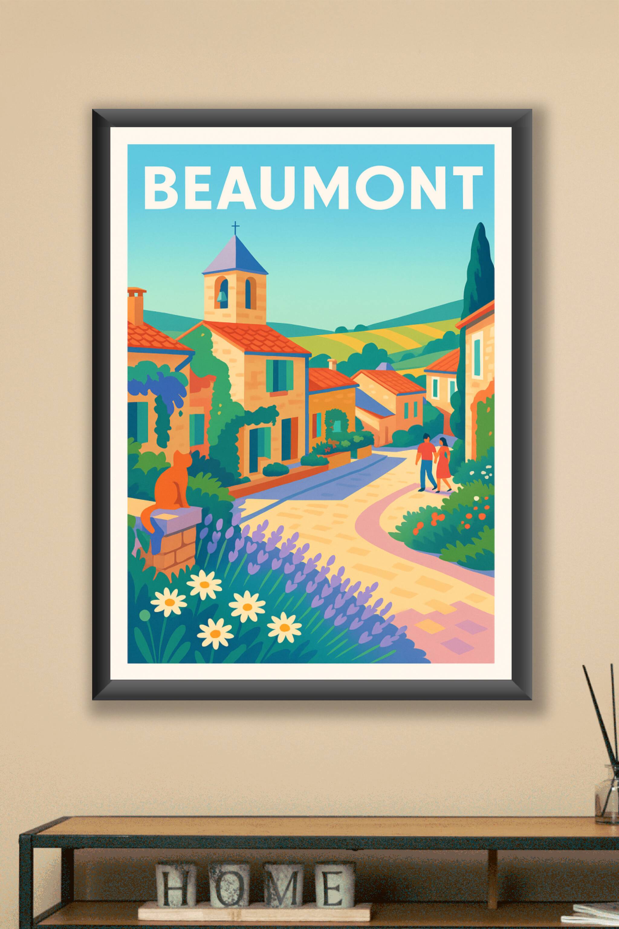 Découvrez l'ambiance paisible et colorée de Beaumont avec cette affiche illustrée aux teintes douces et lumineuses. Ce poster met en scène une ruel...