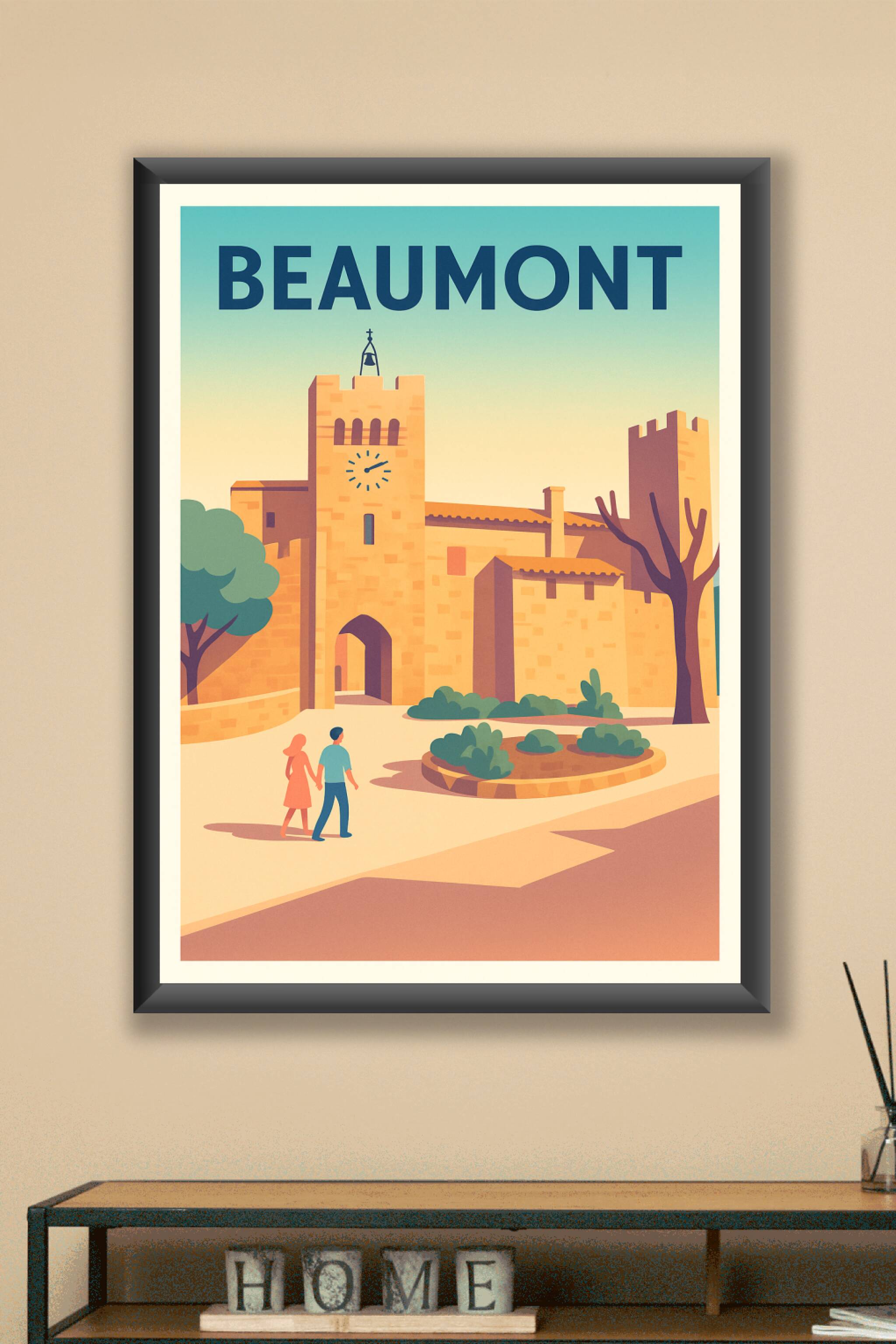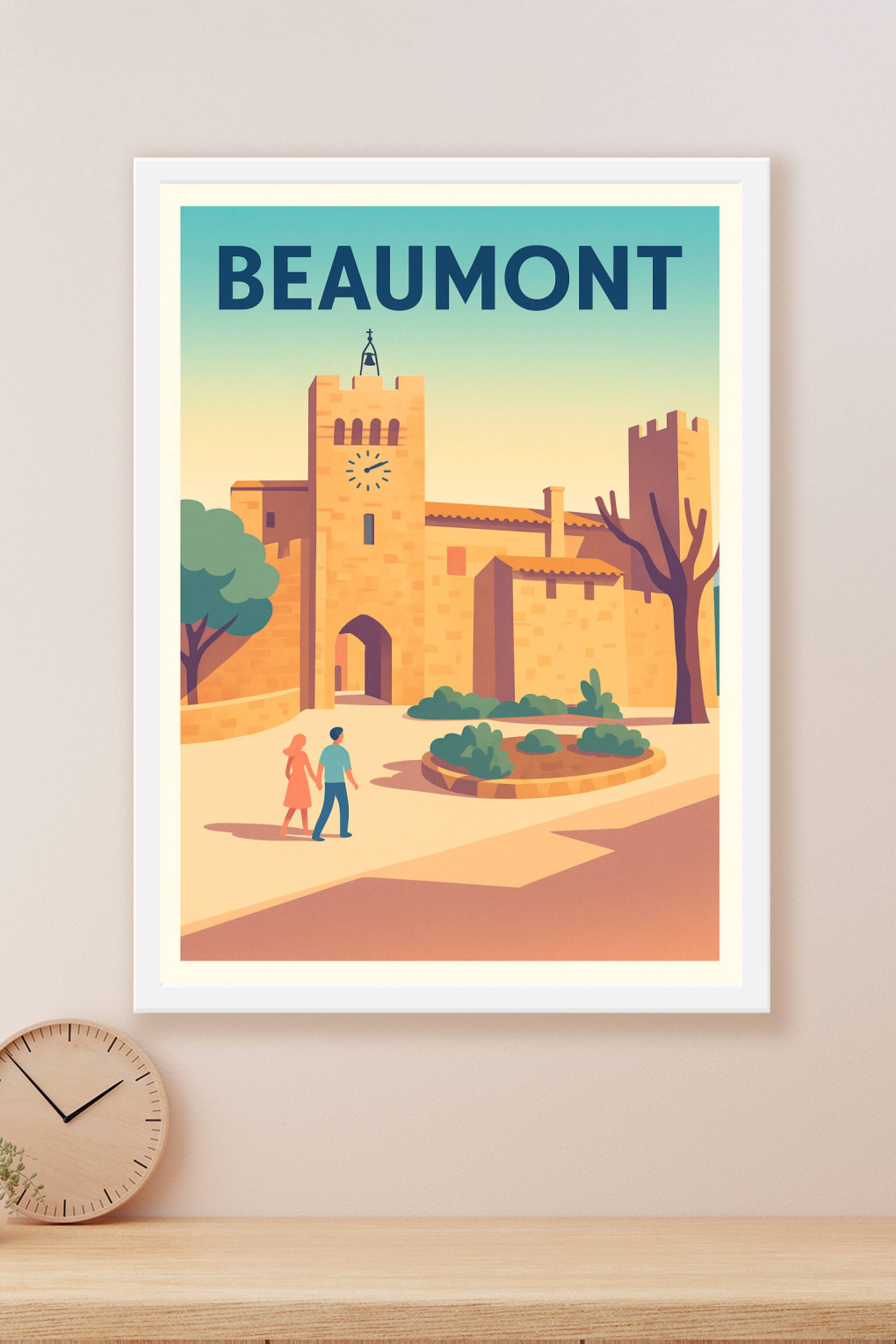 Découvrez l'élégance intemporelle de Beaumont avec cette affiche illustrée mettant en scène ses remparts et son horloge iconique dans une ambiance ...