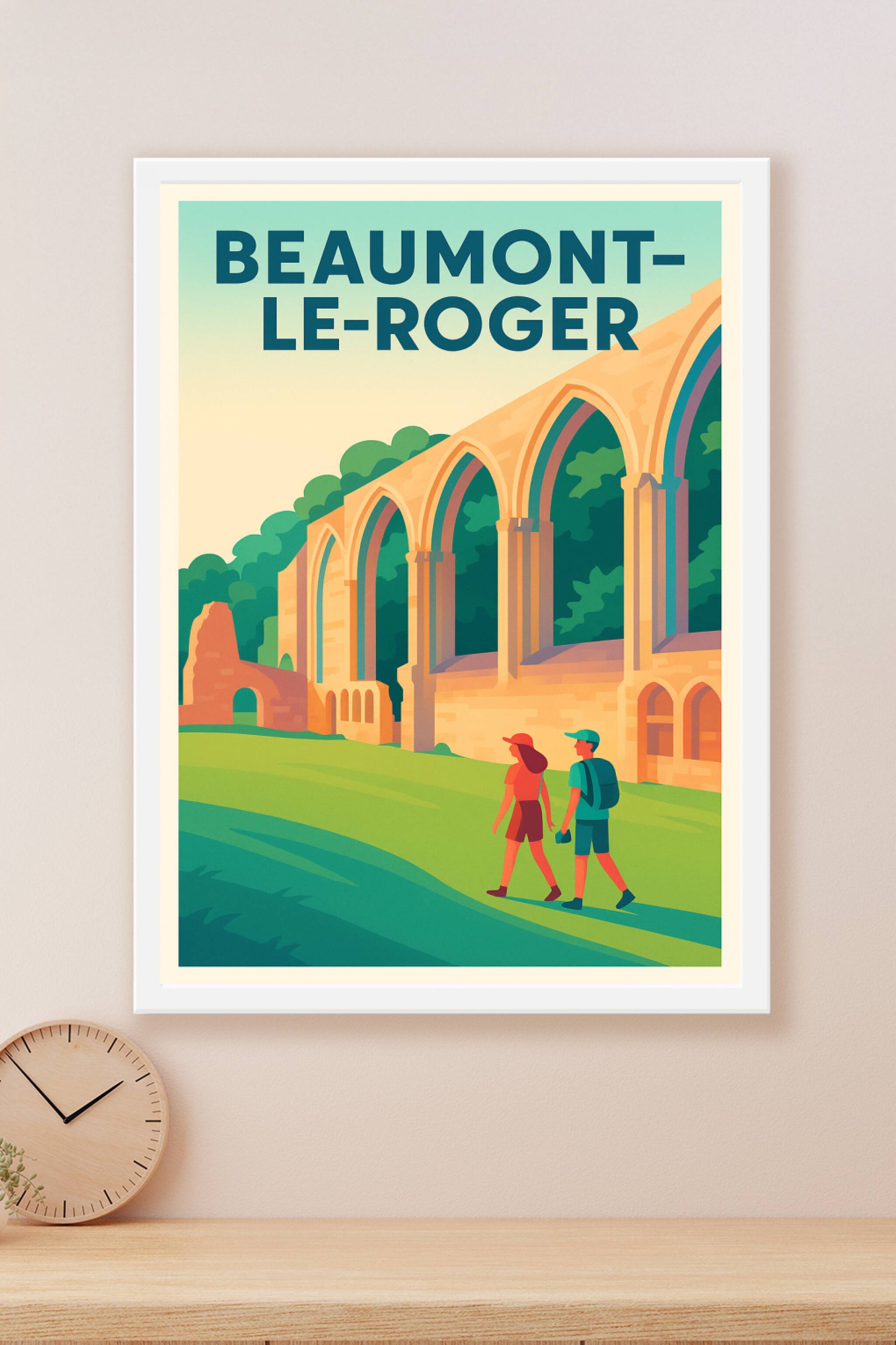 Découvrez la beauté architecturale de Beaumont-le-Roger avec cette affiche illustrée mettant en avant ses ruines emblématiques baignées d'une lumiè...