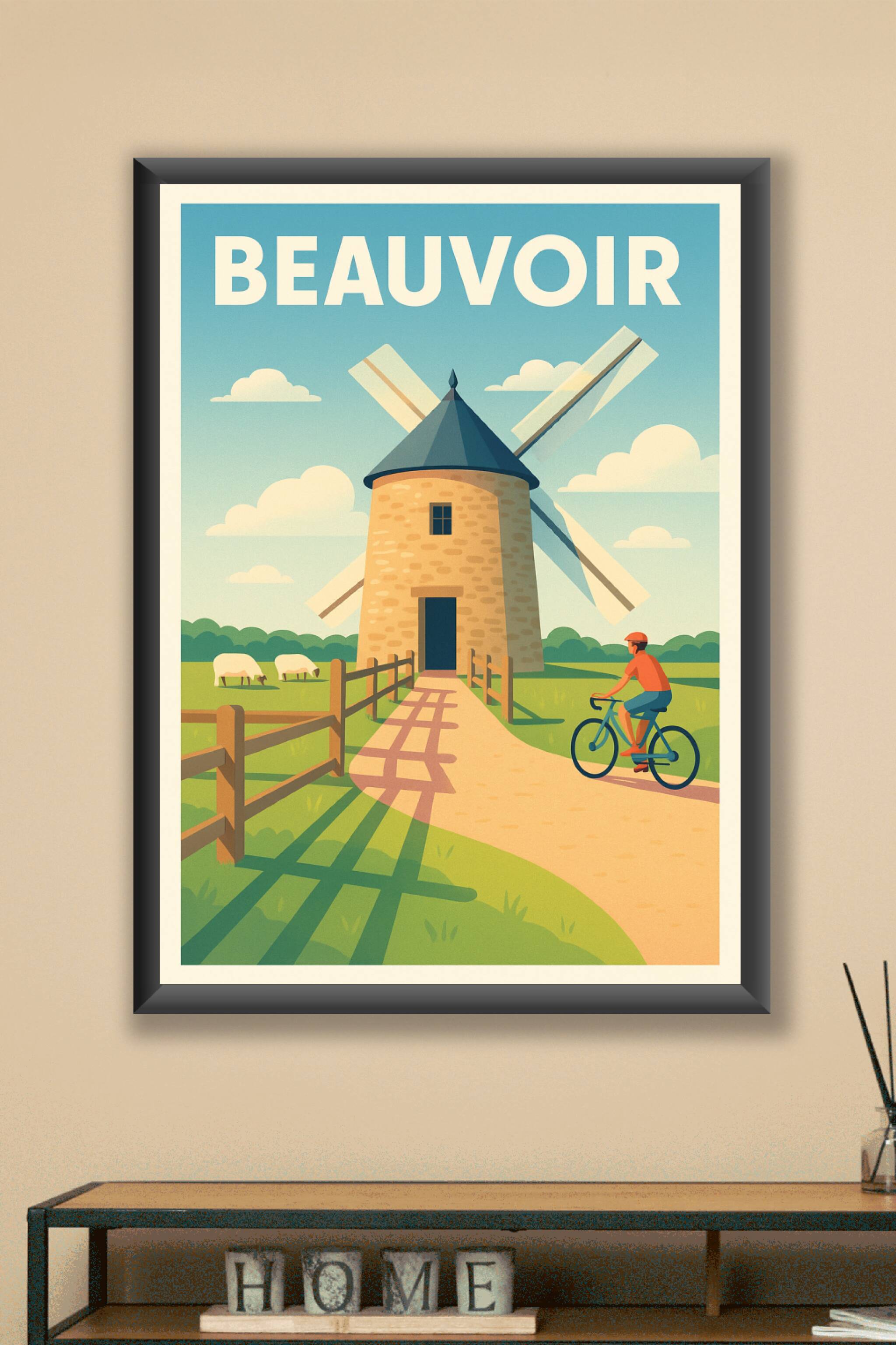 Découvrez la sérénité de Beauvoir avec cette affiche illustrée mettant en scène un moulin traditionnel baigné par la lumière d'une journée ensoleillée. Ce poster évoque la simplicité et la paix de la campagne avec des moutons paissant tranquillement et un cycliste profitant du paysage.Bénéficiez d'un tirage "Fine Art" d'exception imprimé sur un papier 305g coton qui garantit des couleurs éclatantes et une durabilité optimale. Cette affiche est disponible en plusieurs formats, de A1 à A4, pour s'adapter à tous vos espaces. Choisissez-la avec ou sans cadre selon votre style et offrez-vous une décoration authentique au charme bucolique.Fabriqué en France avec une qualité premium, ce poster est parfait pour enrichir votre intérieur ou pour offrir un cadeau élégant aux amoureux des paysages ruraux.