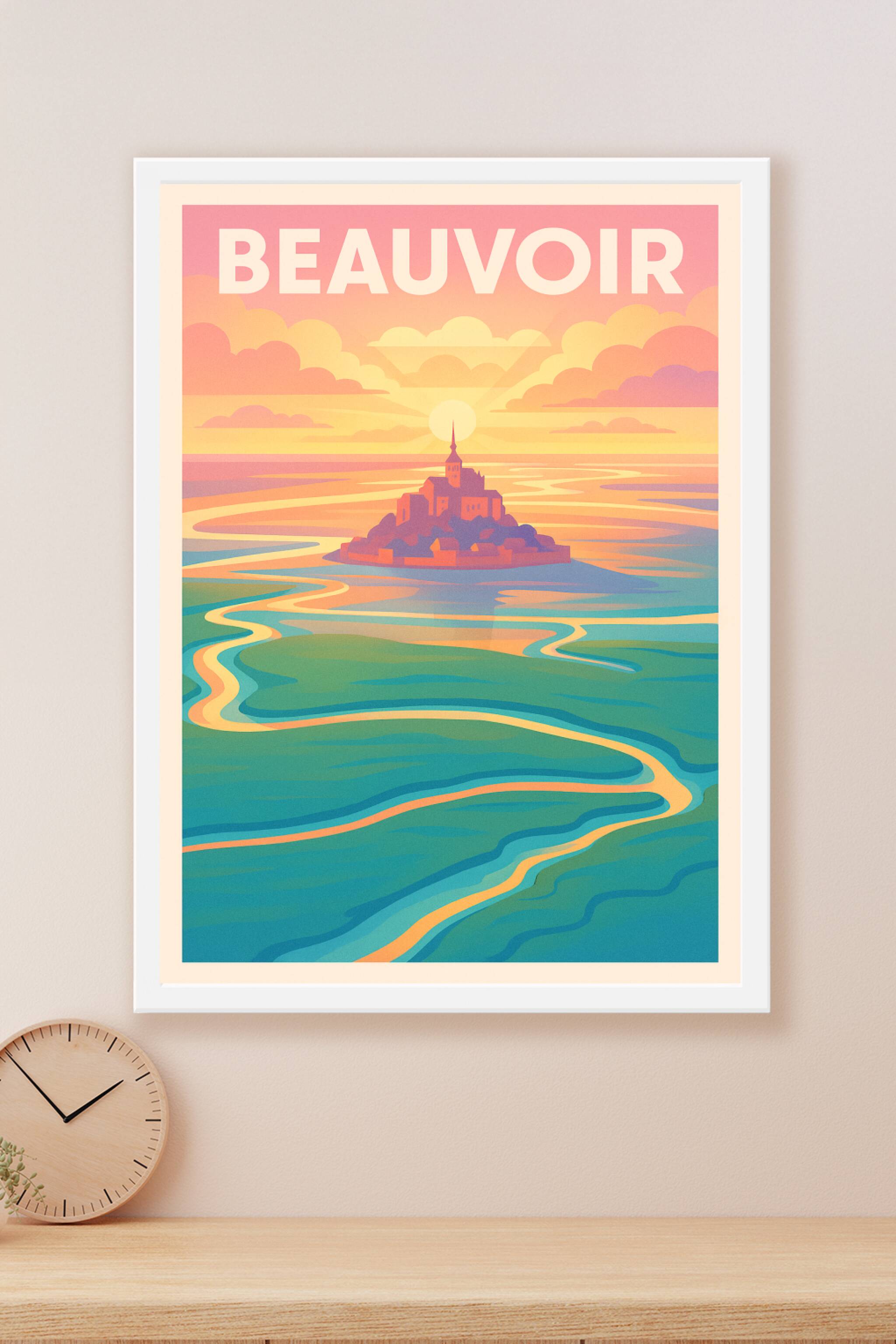 Découvrez la magie de Beauvoir avec cette affiche au style poétique et aux couleurs douces d'un coucher de soleil. Ce poster illustre avec délicatesse le célèbre Mont Saint-Michel baigné dans une lumière chaleureuse, où les méandres de l'eau se mêlent aux terres environnantes.Ce poster est imprimé en tirage "Fine Art" sur papier 305g coton, garantissant une qualité exceptionnelle et une longévité remarquable des couleurs. Disponible en formats A1 à A4, avec ou sans cadre, cette affiche apportera une touche d'élégance et de sérénité à votre décoration intérieure.Profitez d'une impression premium 100% fabriquée en France pour embellir votre salon, bureau ou offrir un cadeau unique aux amoureux des paysages naturels et historiques.