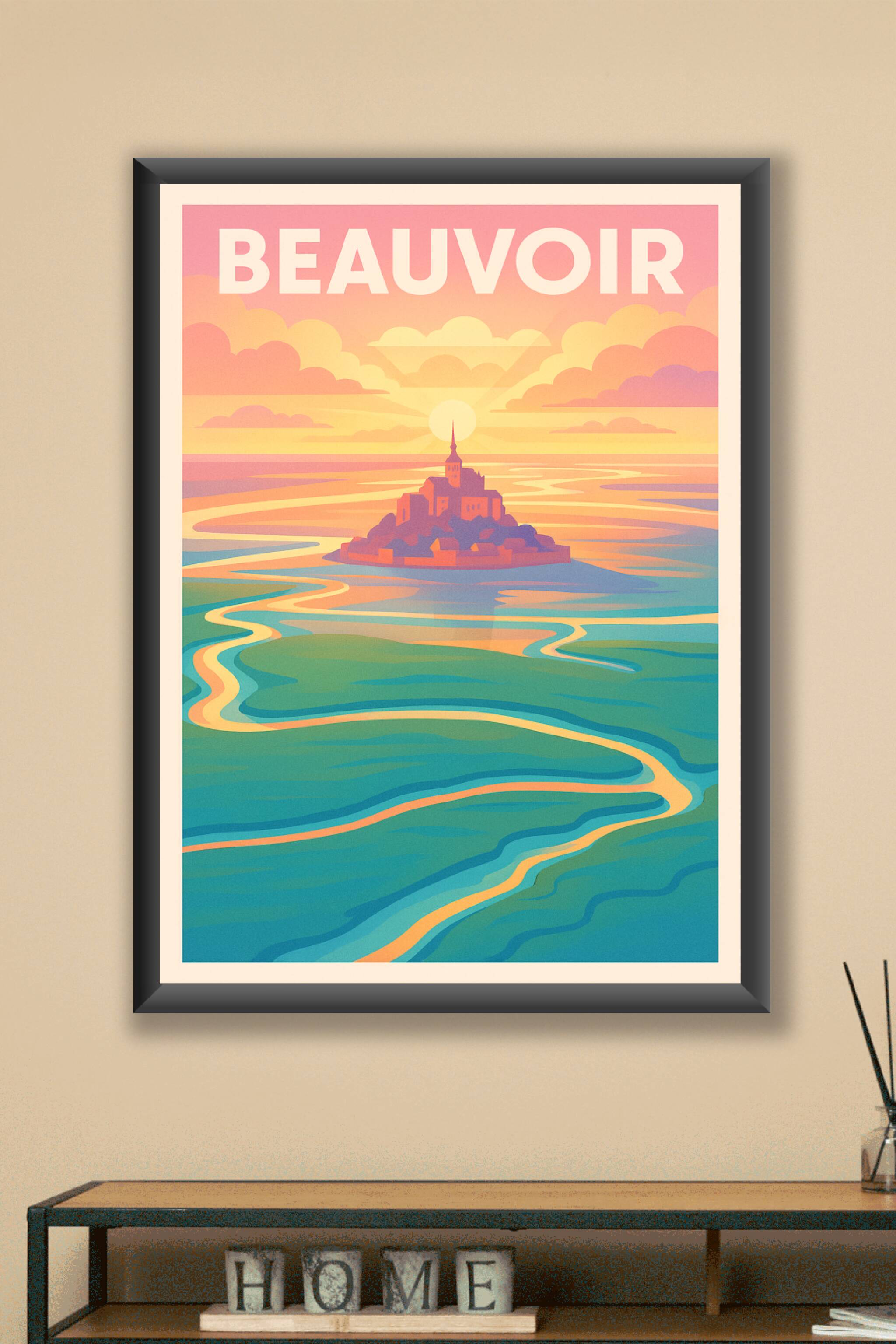 Découvrez la magie de Beauvoir avec cette affiche au style poétique et aux couleurs douces d'un coucher de soleil. Ce poster illustre avec délicate...