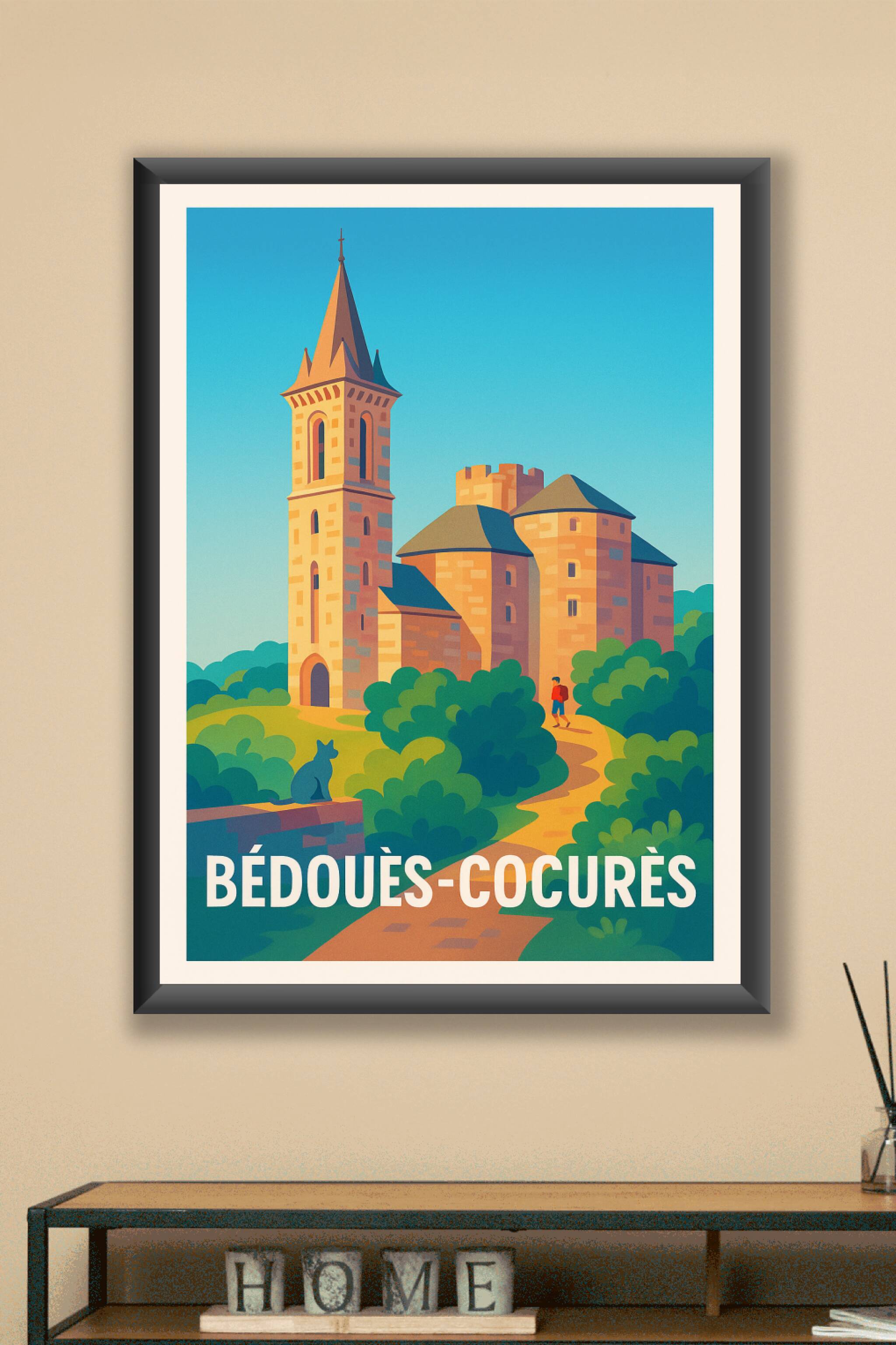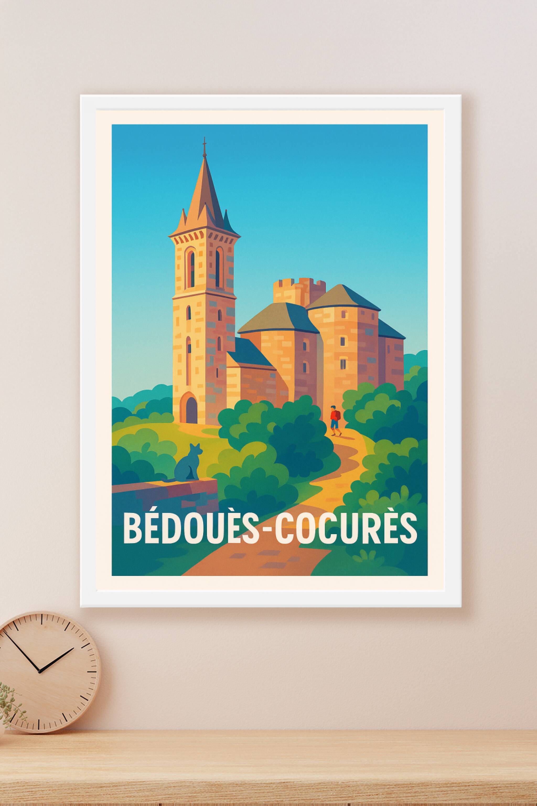 Découvrez l'atmosphère unique de Bédouès-Cocurès avec cette affiche au style vintage mettant en scène son patrimoine médiéval et ses paysages verdo...