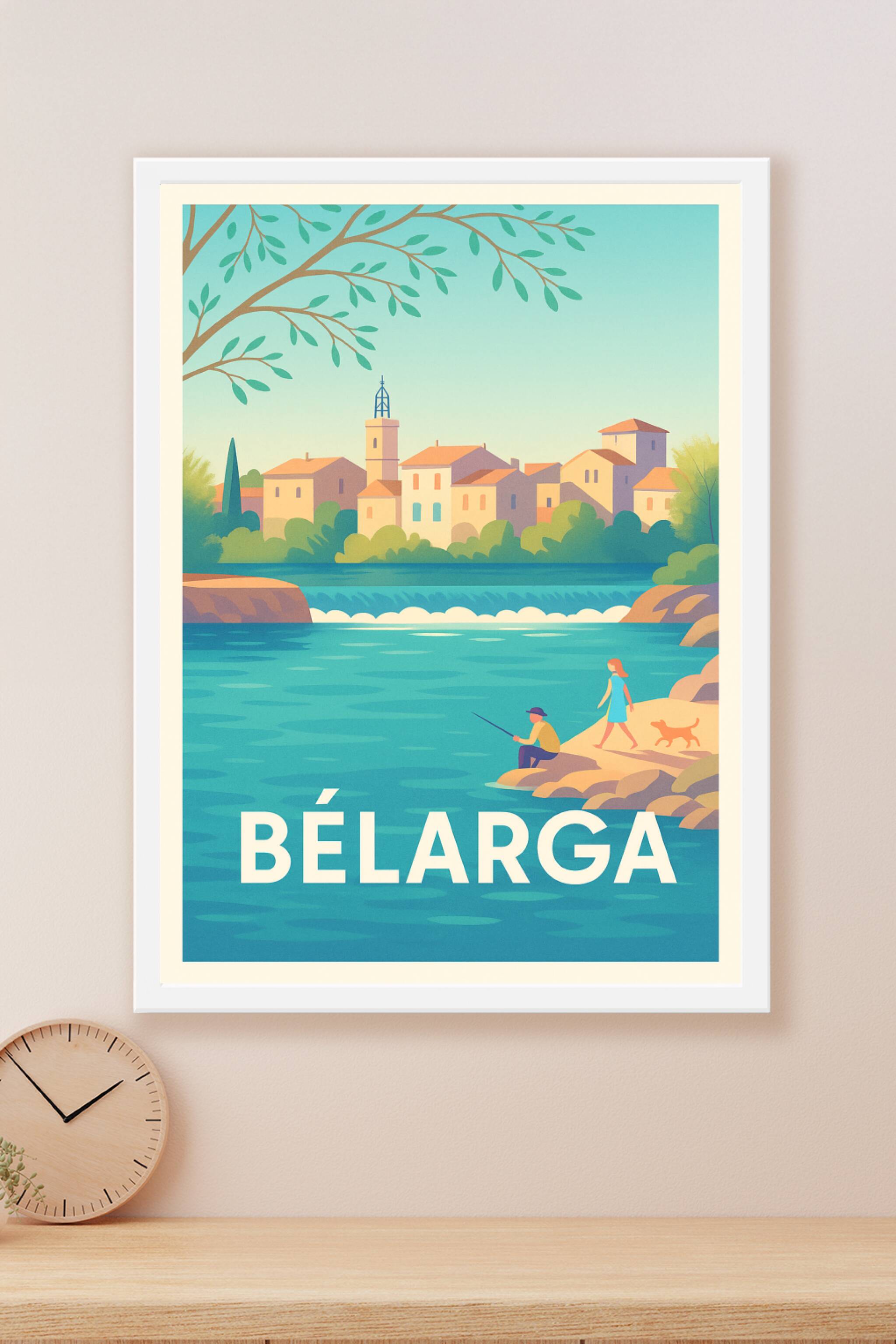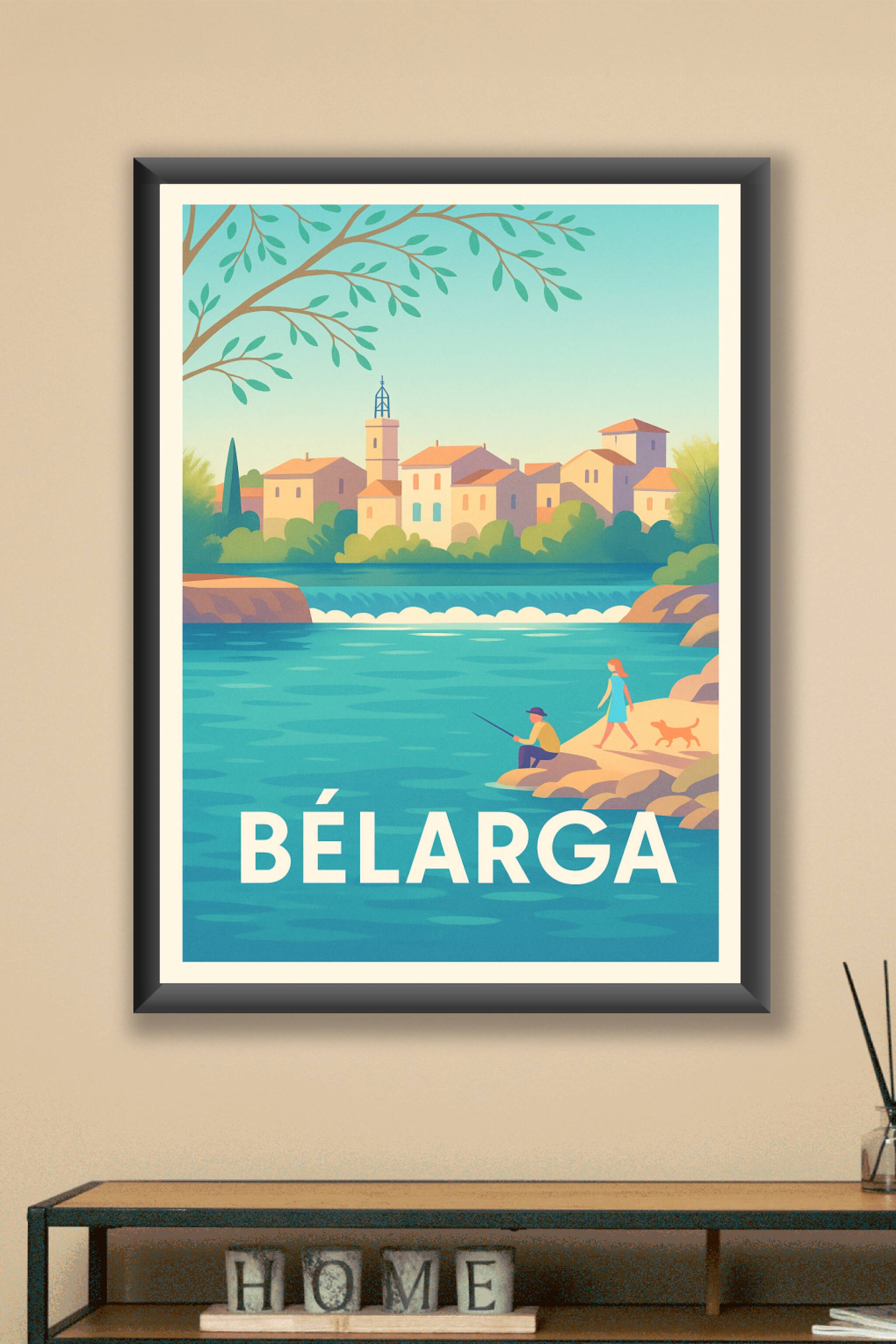 Découvrez la douceur de vivre à Bélarga à travers cette affiche illustrée au style vintage et coloré. Cette scène paisible met en avant un pêcheur,...