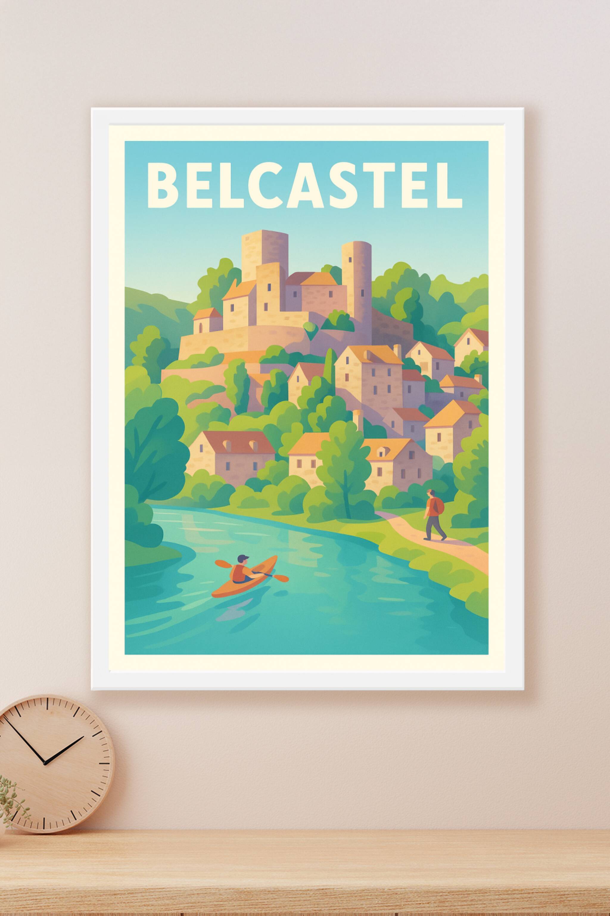 Découvrez la charmante cité médiévale de Belcastel illustrée dans ce poster au style doux et chaleureux, où se mêlent nature et patrimoine historique. Cette affiche met en scène le village pittoresque surplombant une rivière paisible, avec un kayakiste et un promeneur qui invitent à l'évasion. Imprimée en tirage "Fine Art" sur papier 305g coton, elle garantit une qualité d'impression remarquable et des couleurs éclatantes pour sublimer votre décoration intérieure. Disponible en formats A1 à A4, avec ou sans cadre, cette affiche allie authenticité et élégance, parfaite pour orner votre espace ou offrir un souvenir raffiné de Belcastel.