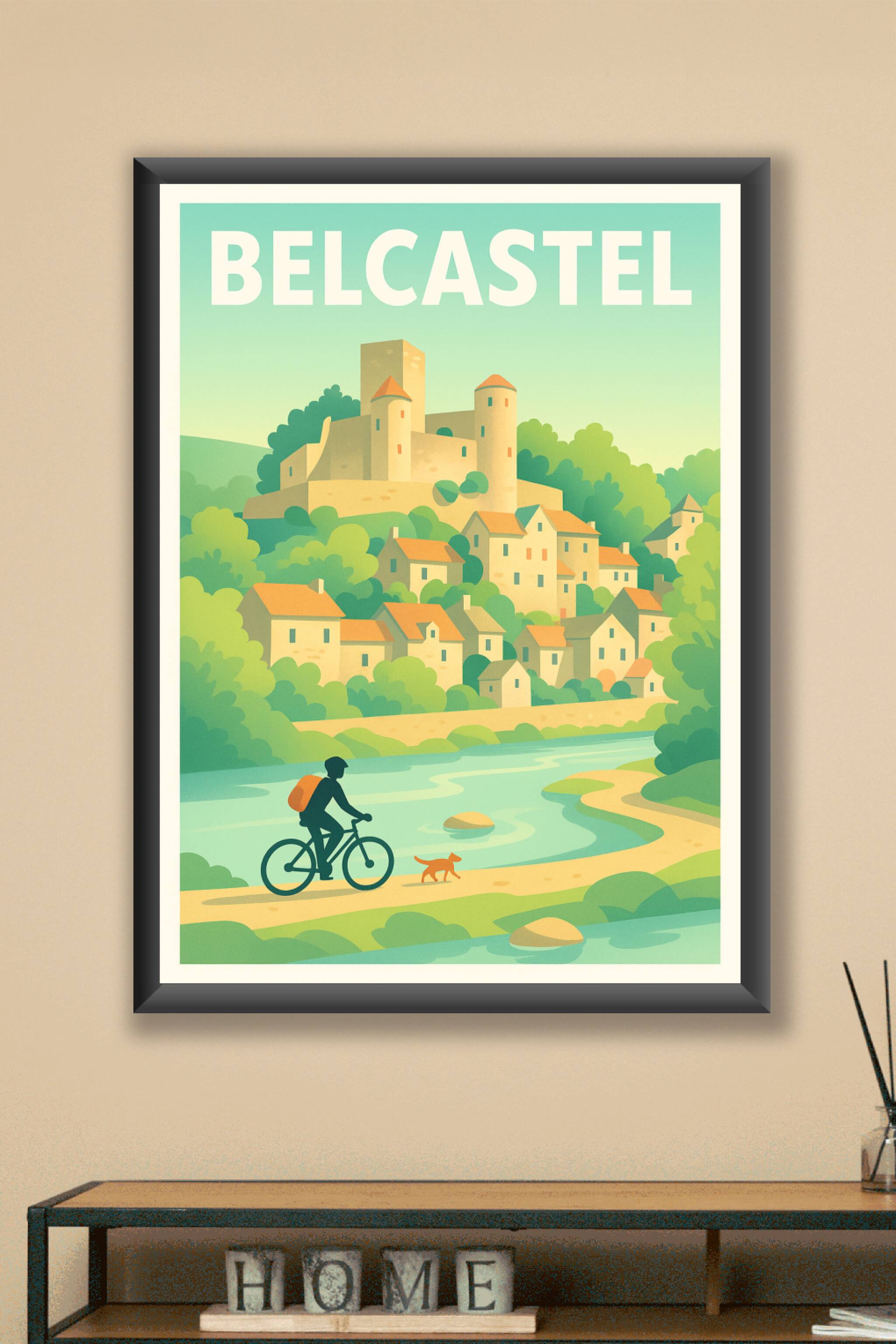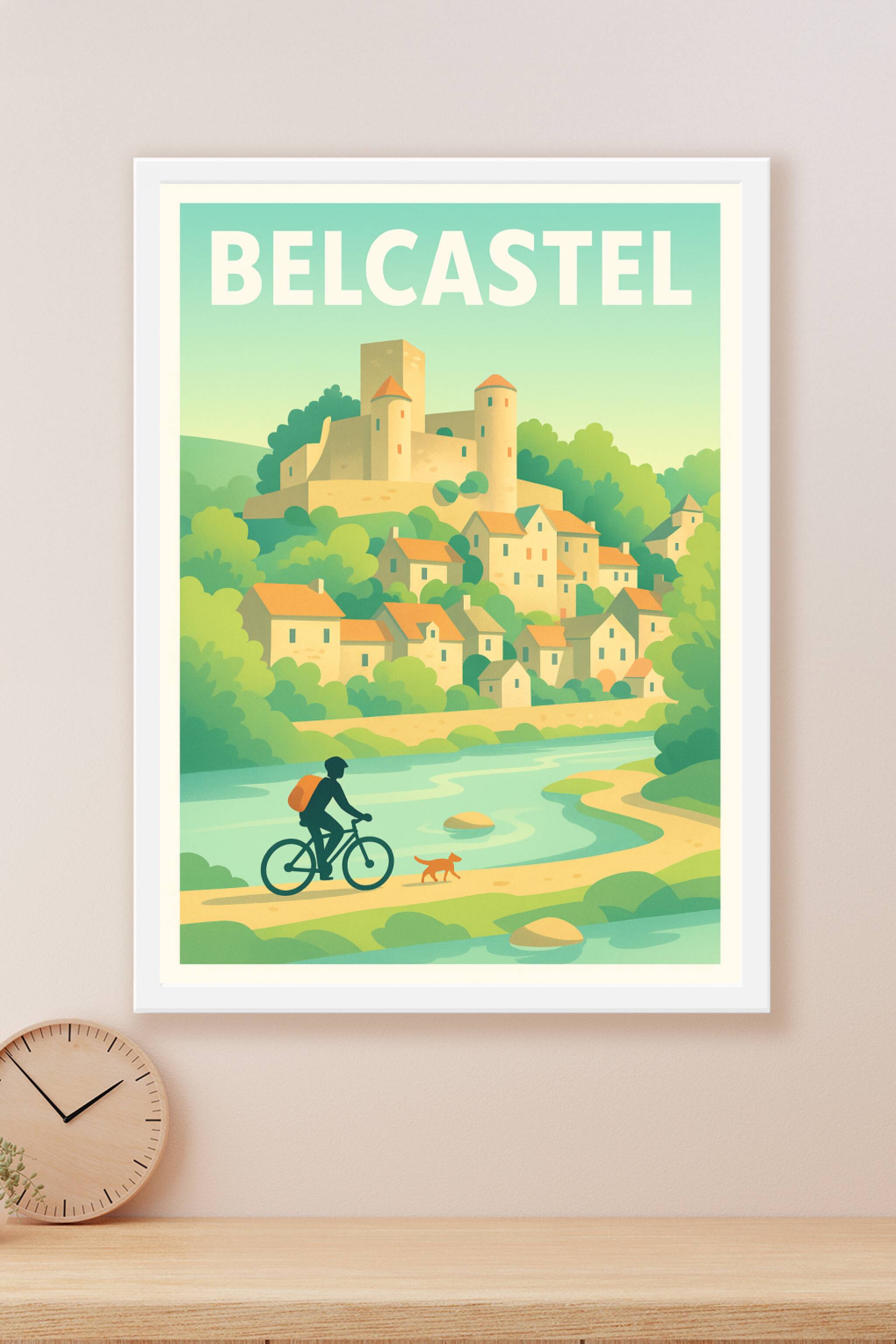 Découvrez le charme intemporel de Belcastel à travers cette affiche illustrée aux tons doux et apaisants. Mettant en scène un cycliste et son compa...