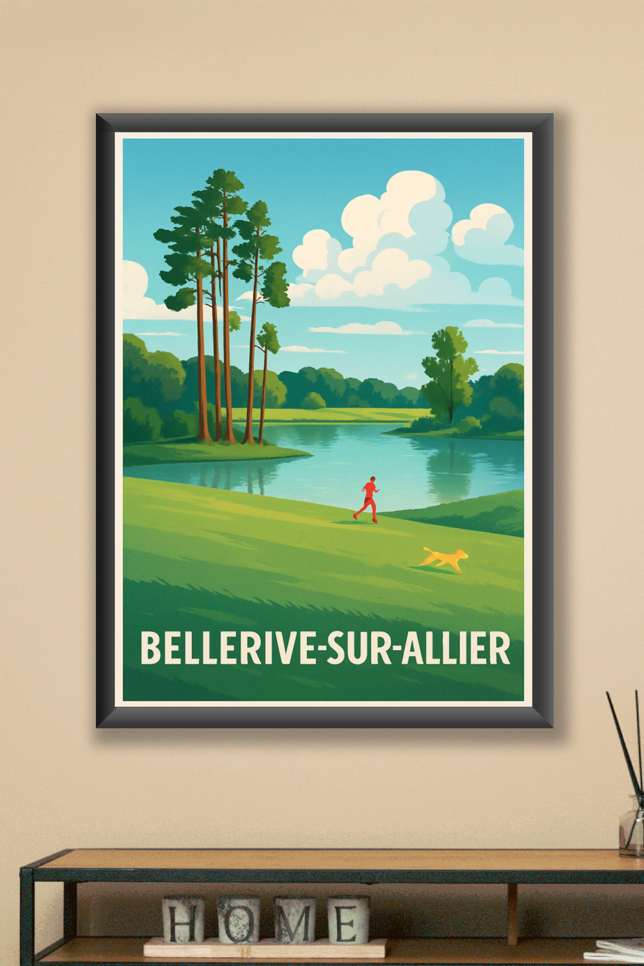 Découvrez la sérénité de Bellerive-sur-Allier avec cette affiche illustrée mettant en scène un paysage paisible au bord de la rivière, où la nature luxuriante et la lumière douce s'entrelacent. Un joggeur et son chien apportent une touche de vie à cette scène champêtre pleine de fraîcheur et de calme.Idéale pour votre décoration intérieure, ce poster est disponible en tirages Fine Art imprimés sur papier 305g coton, garantissant une qualité de reproduction exceptionnelle et une grande durabilité. Choisissez parmi les formats A1 à A4, avec ou sans cadre, pour s'adapter parfaitement à votre espace.Sublimez votre intérieur avec cette affiche premium 100% fabriquée en France, parfaite pour les amoureux des paysages naturels et des ambiances apaisantes.