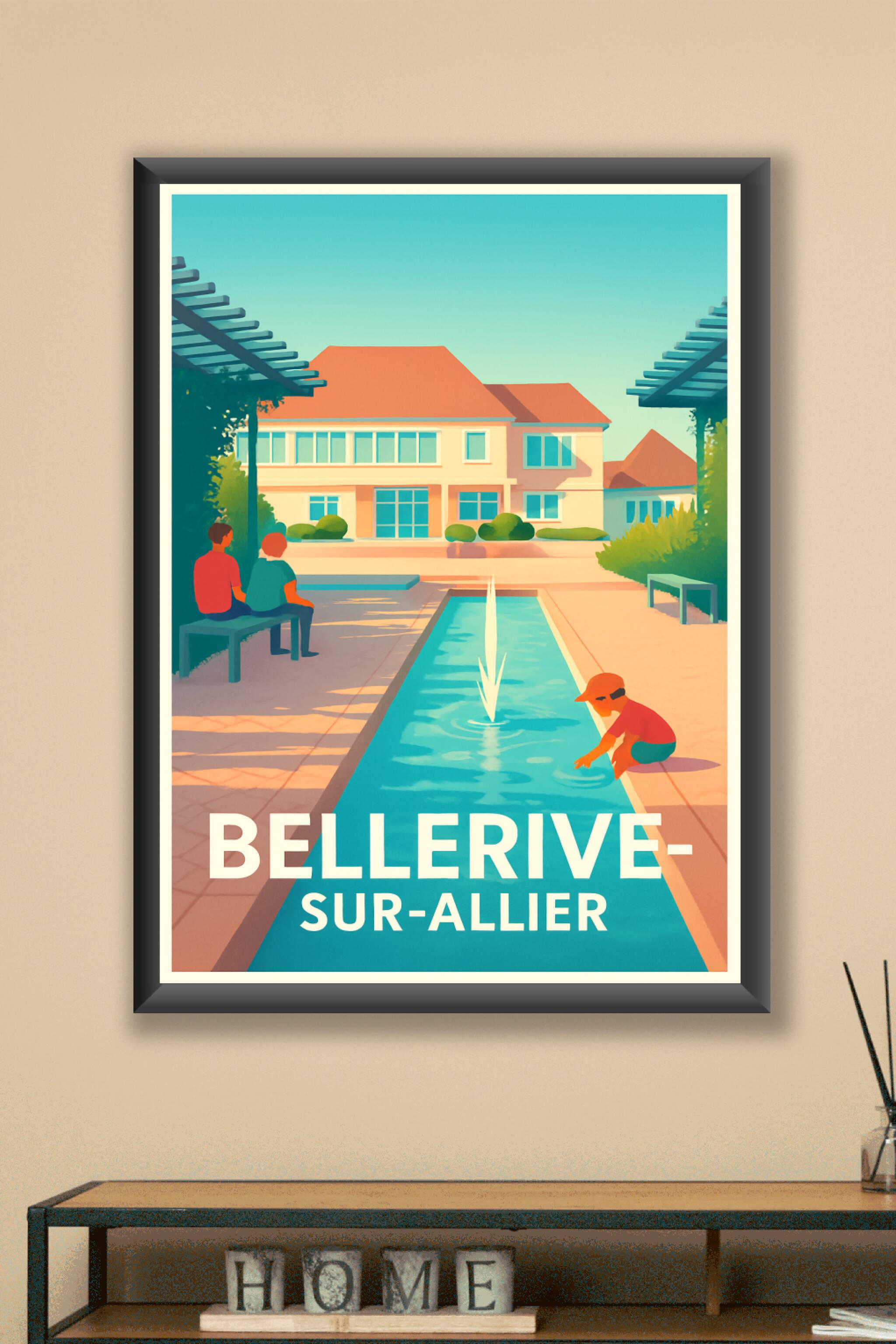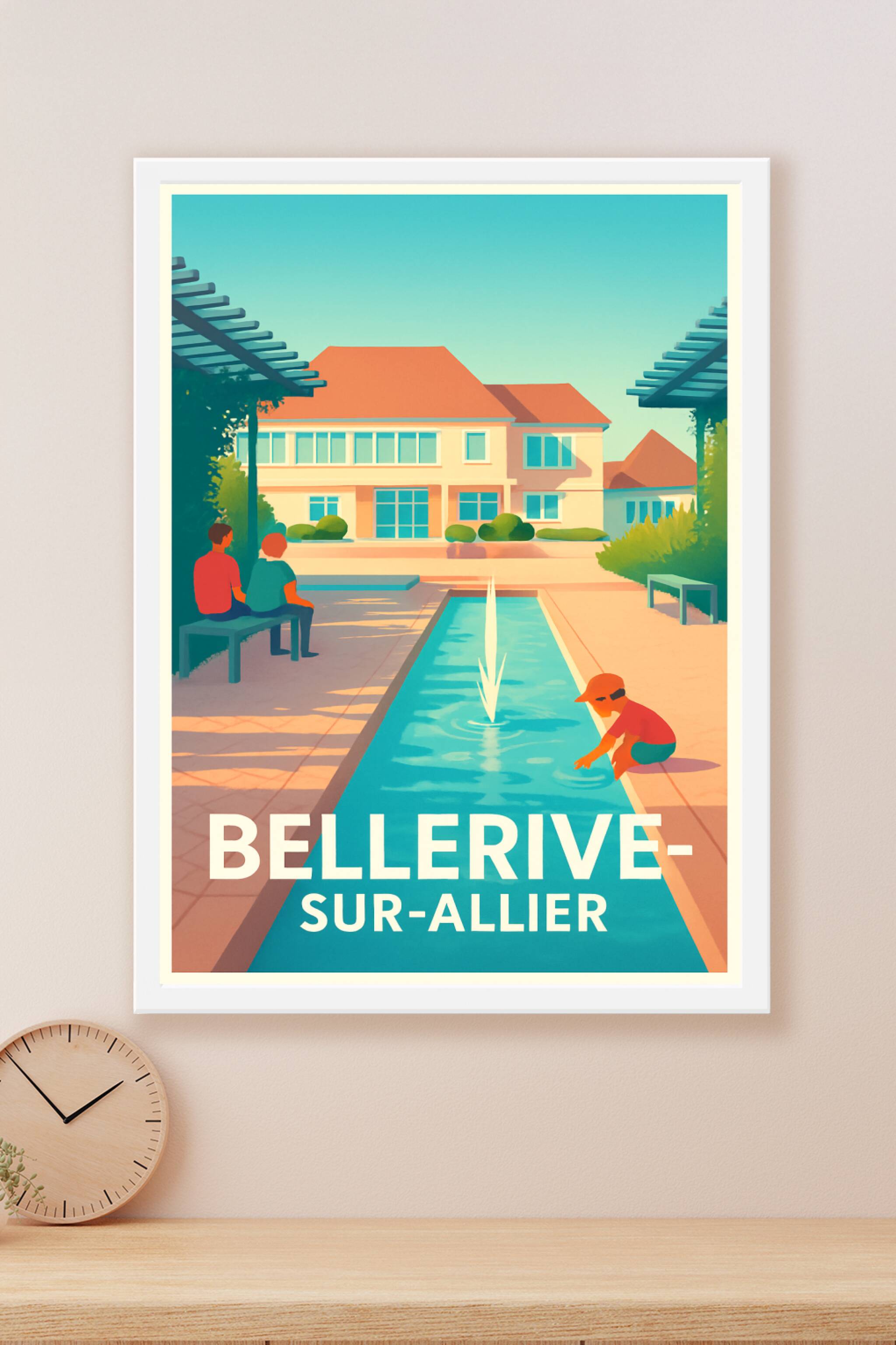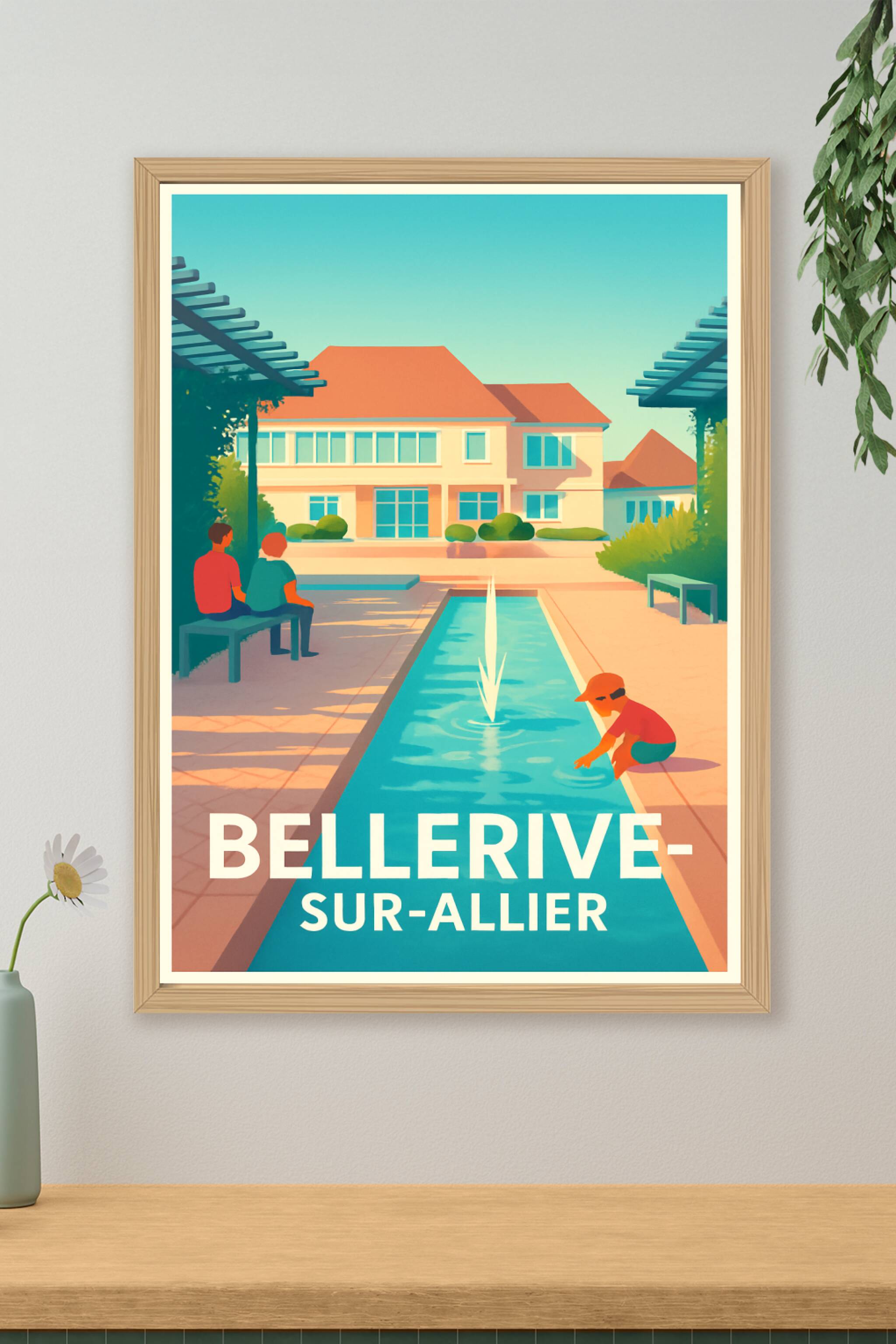 Découvrez la douceur de vivre à Bellerive-sur-Allier avec cette affiche illustrée mettant en scène une scène paisible autour d'un bassin ensoleillé...