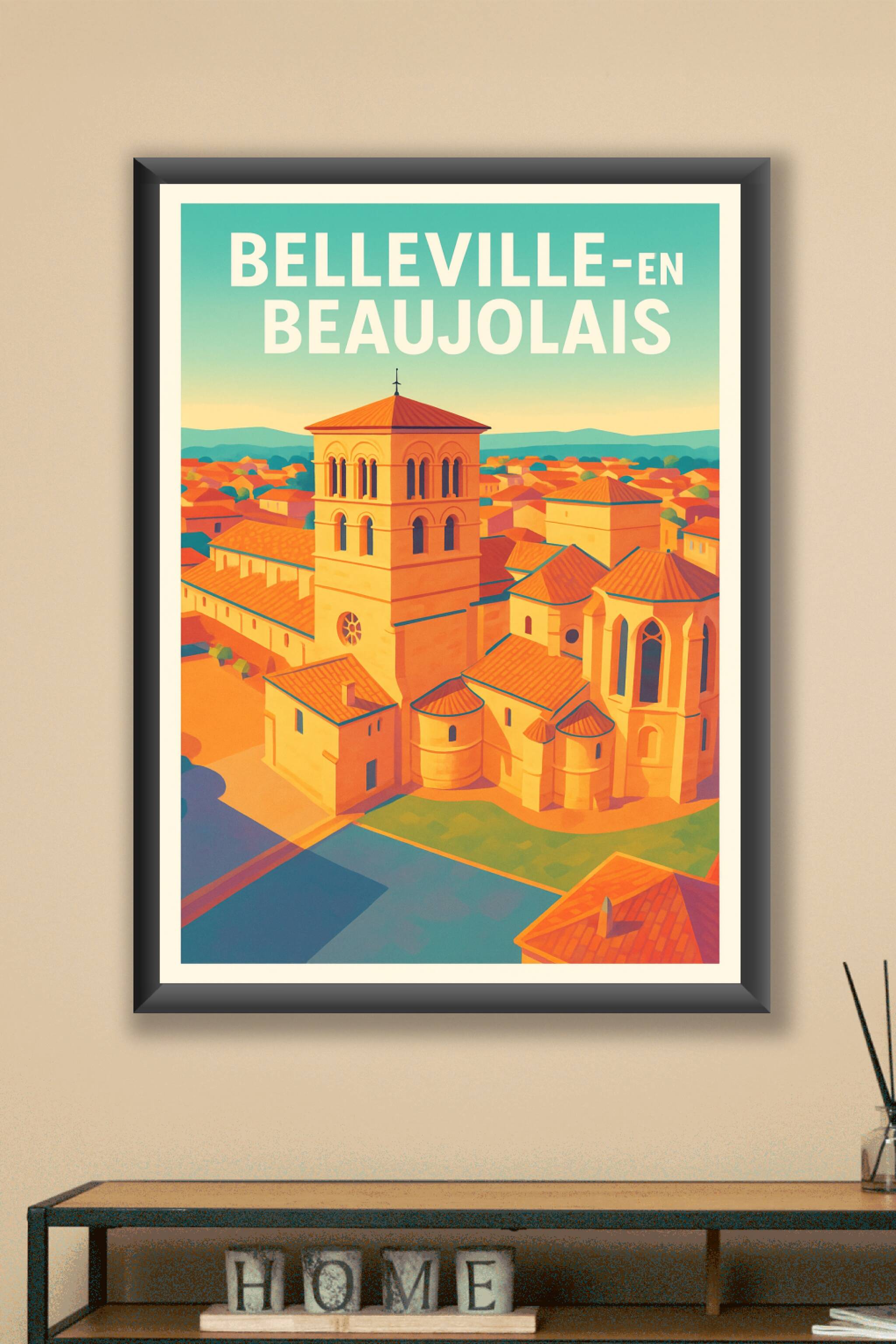 Découvrez la beauté authentique de Belleville-en-Beaujolais avec cette affiche illustrée aux couleurs chaudes, mettant en lumière l'architecture mé...