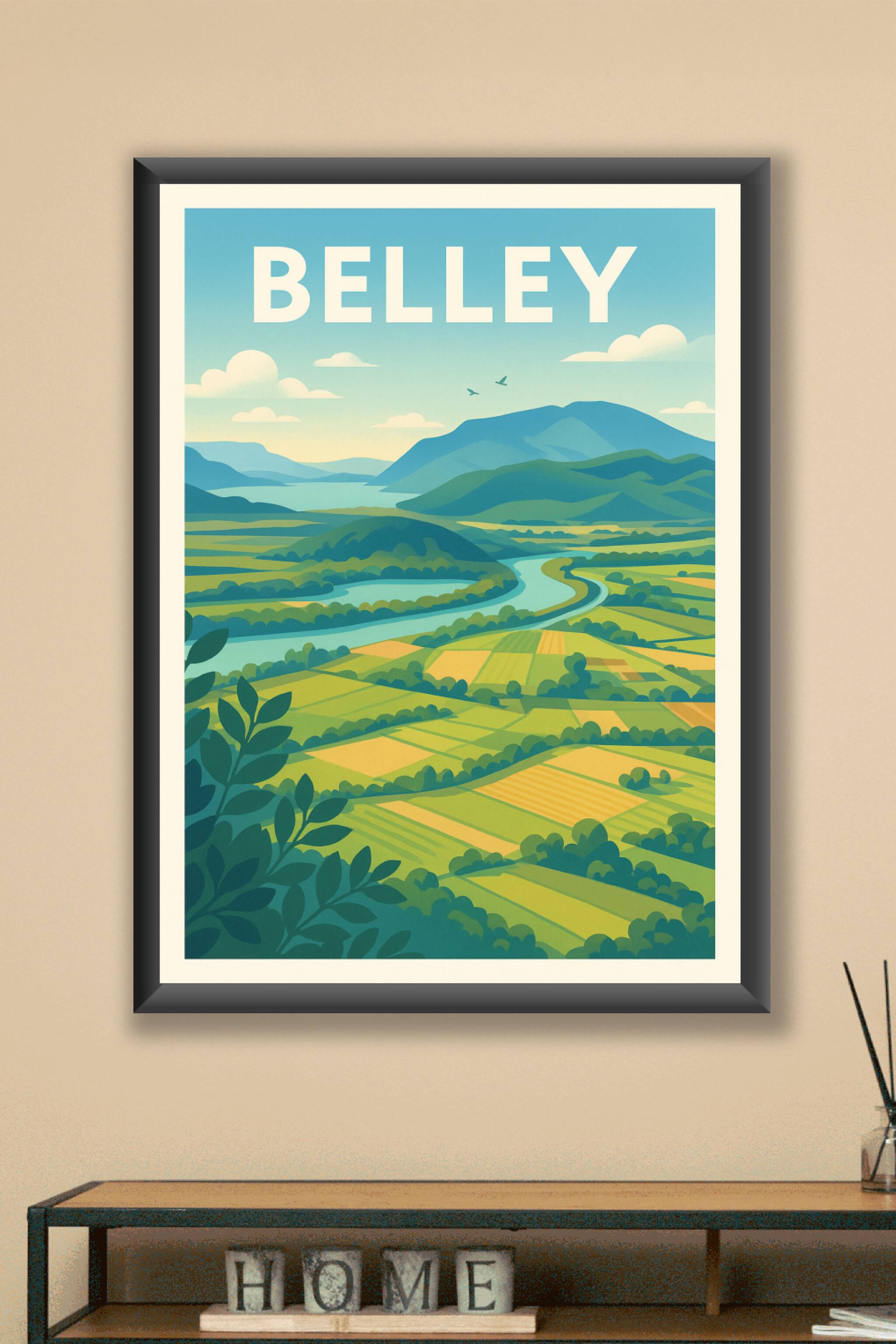 Découvrez la beauté sereine de Belley avec cette affiche fine art illustrant un paysage vallonné, une rivière sinueuse et des champs verdoyants sou...