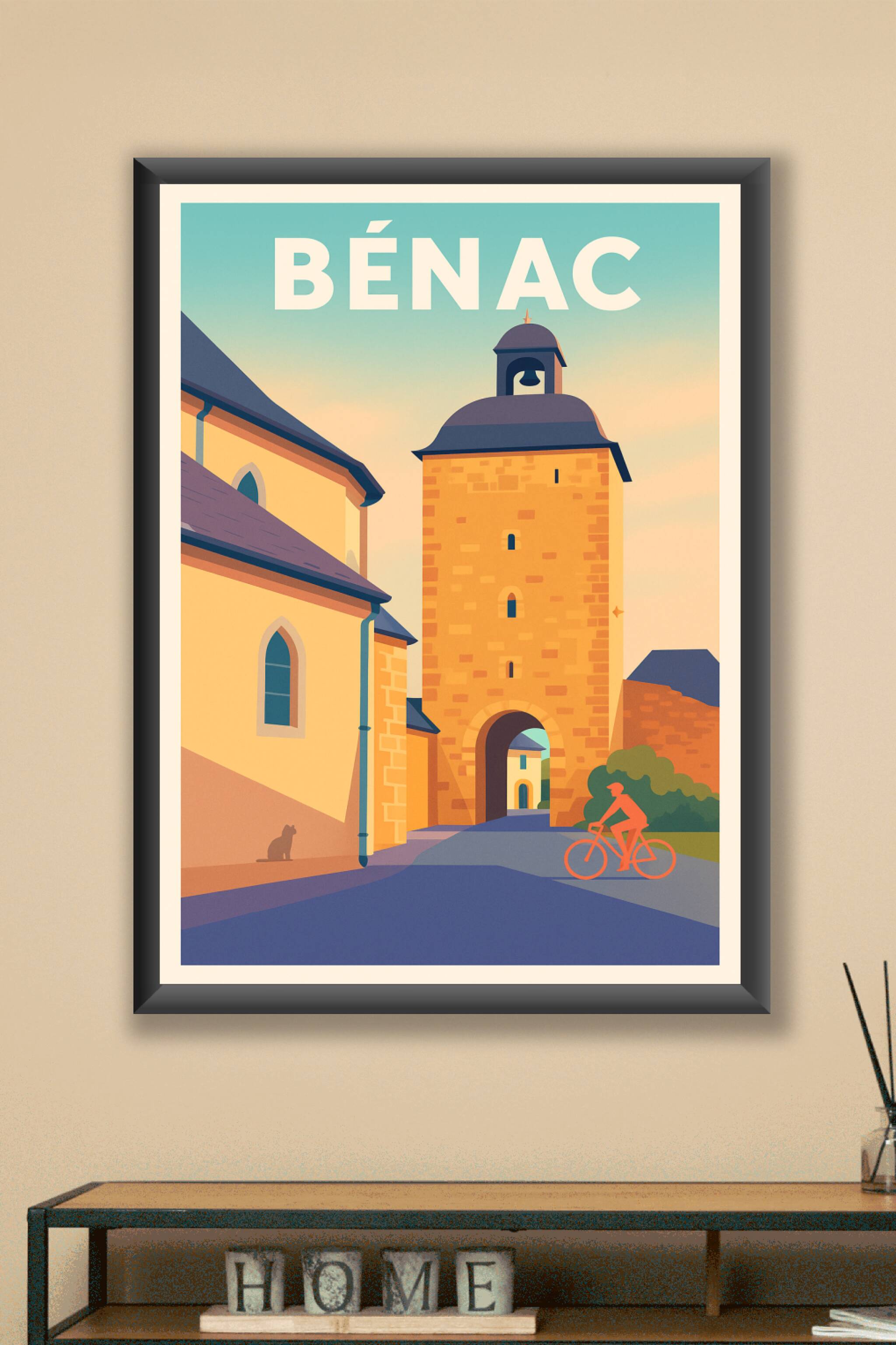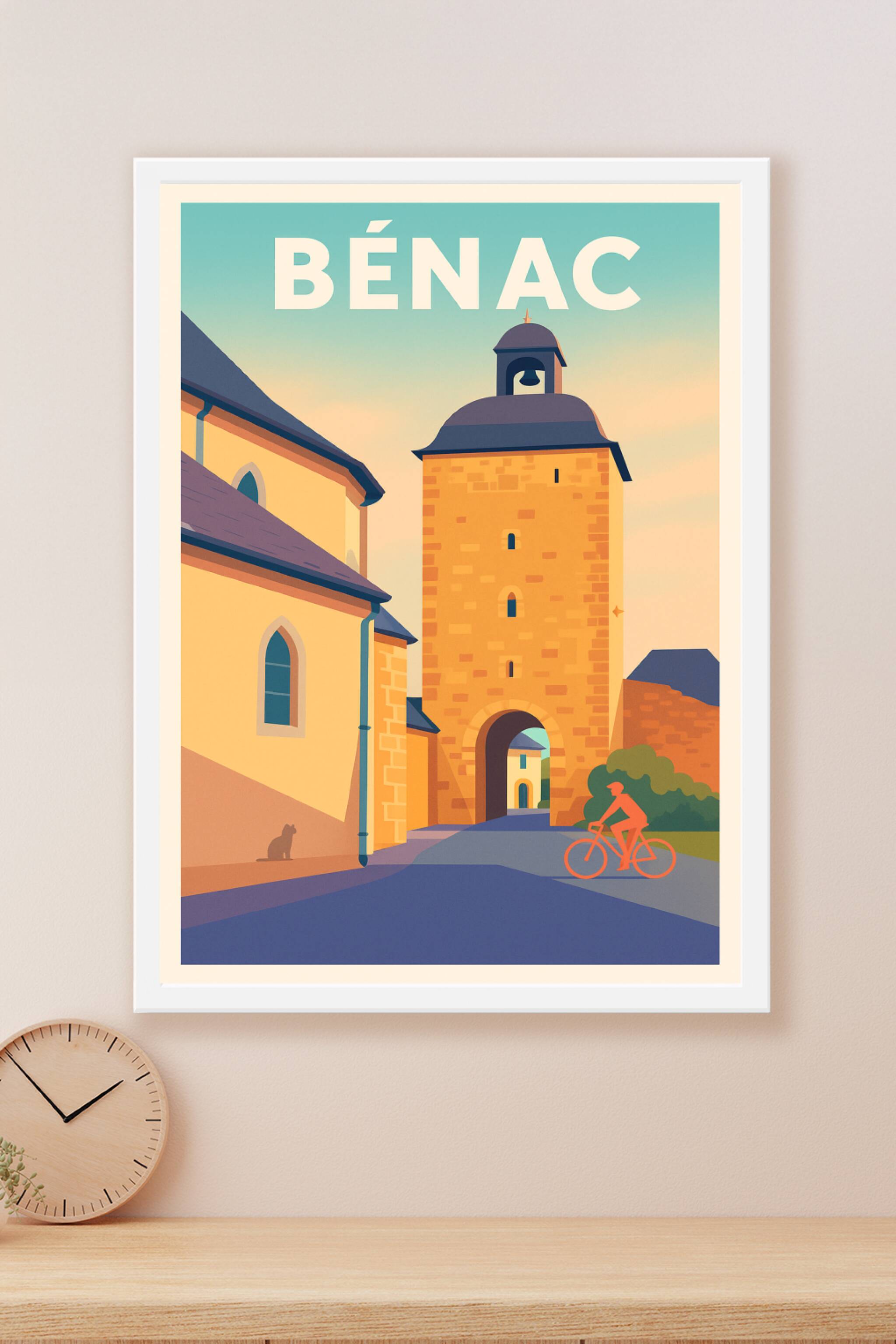 Découvrez le charme authentique de Bénac avec cette affiche illustrée mettant en avant son architecture médiévale emblématique et l’atmosphère pais...