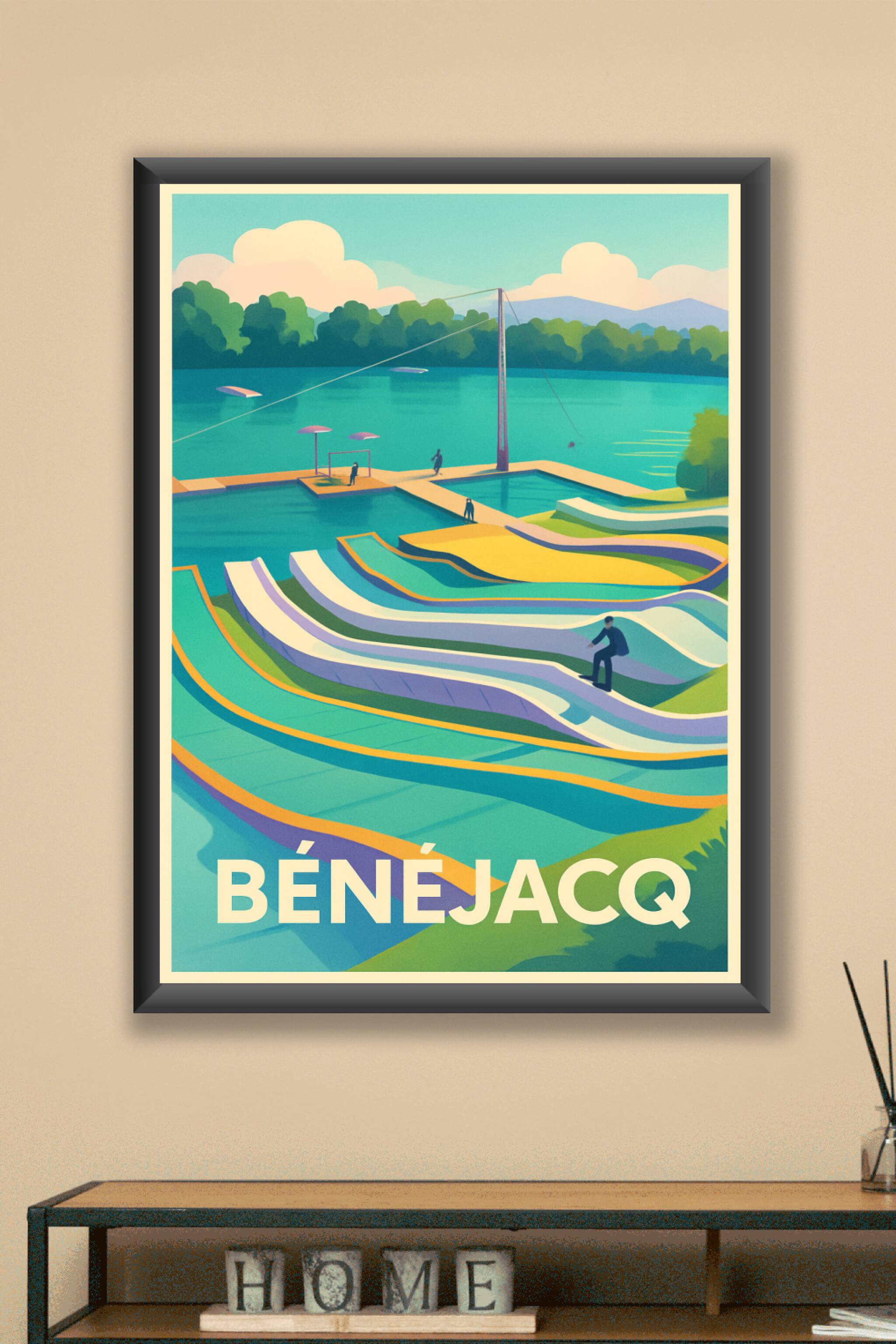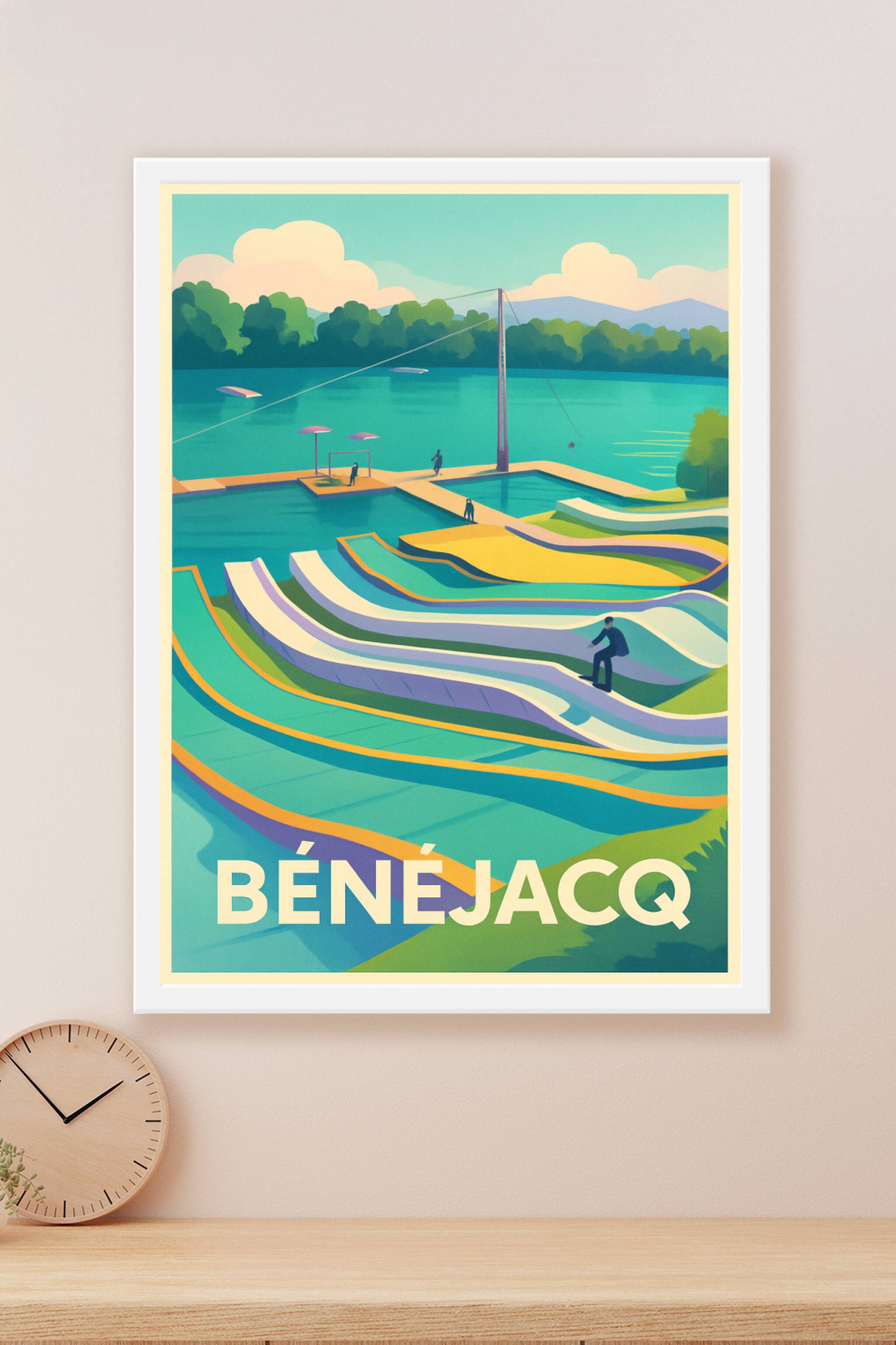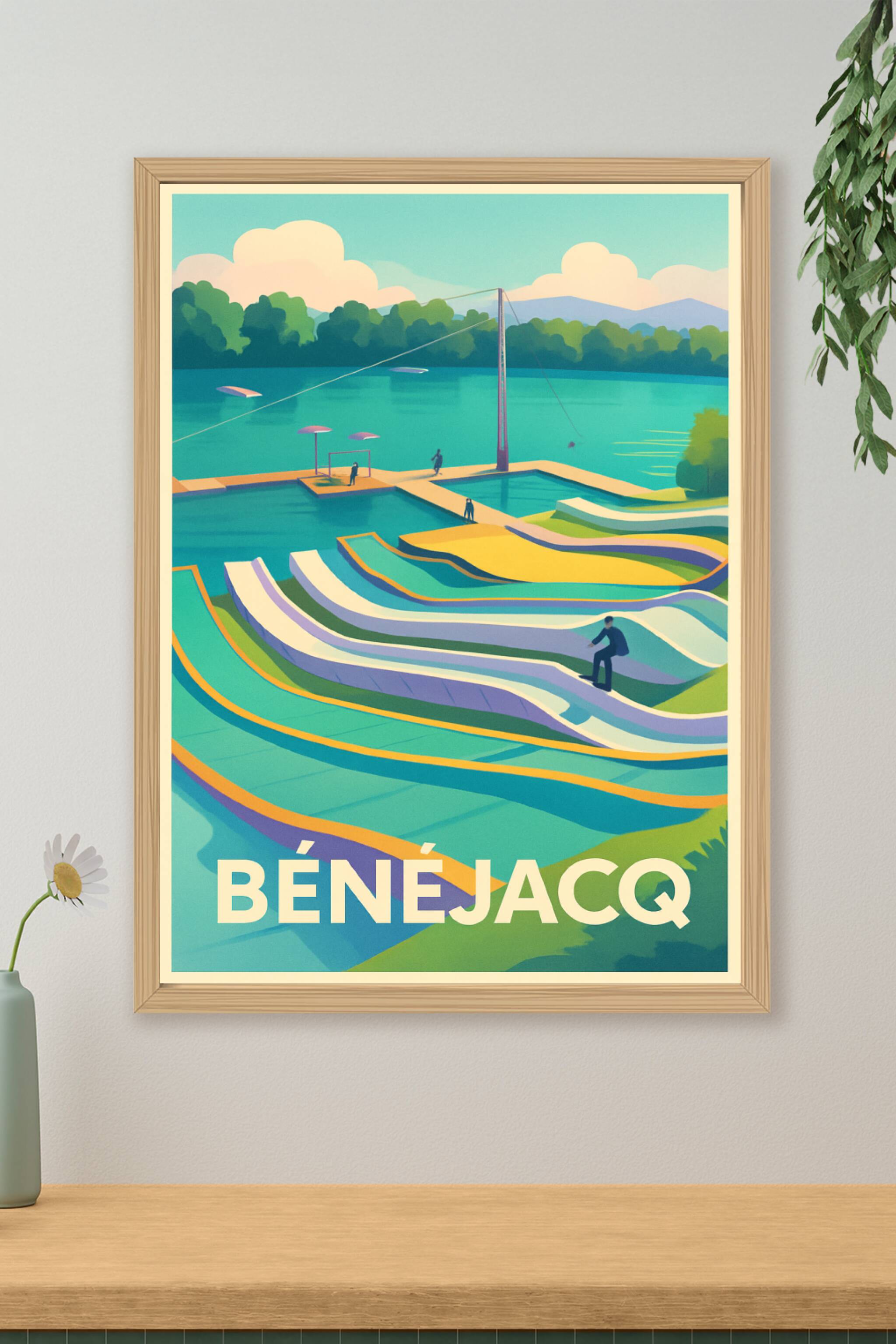 Découvrez toute la fraîcheur et la joie de vivre de Bénéjacq avec cette superbe affiche illustrée représentant son célèbre parc aquatique. Les bass...