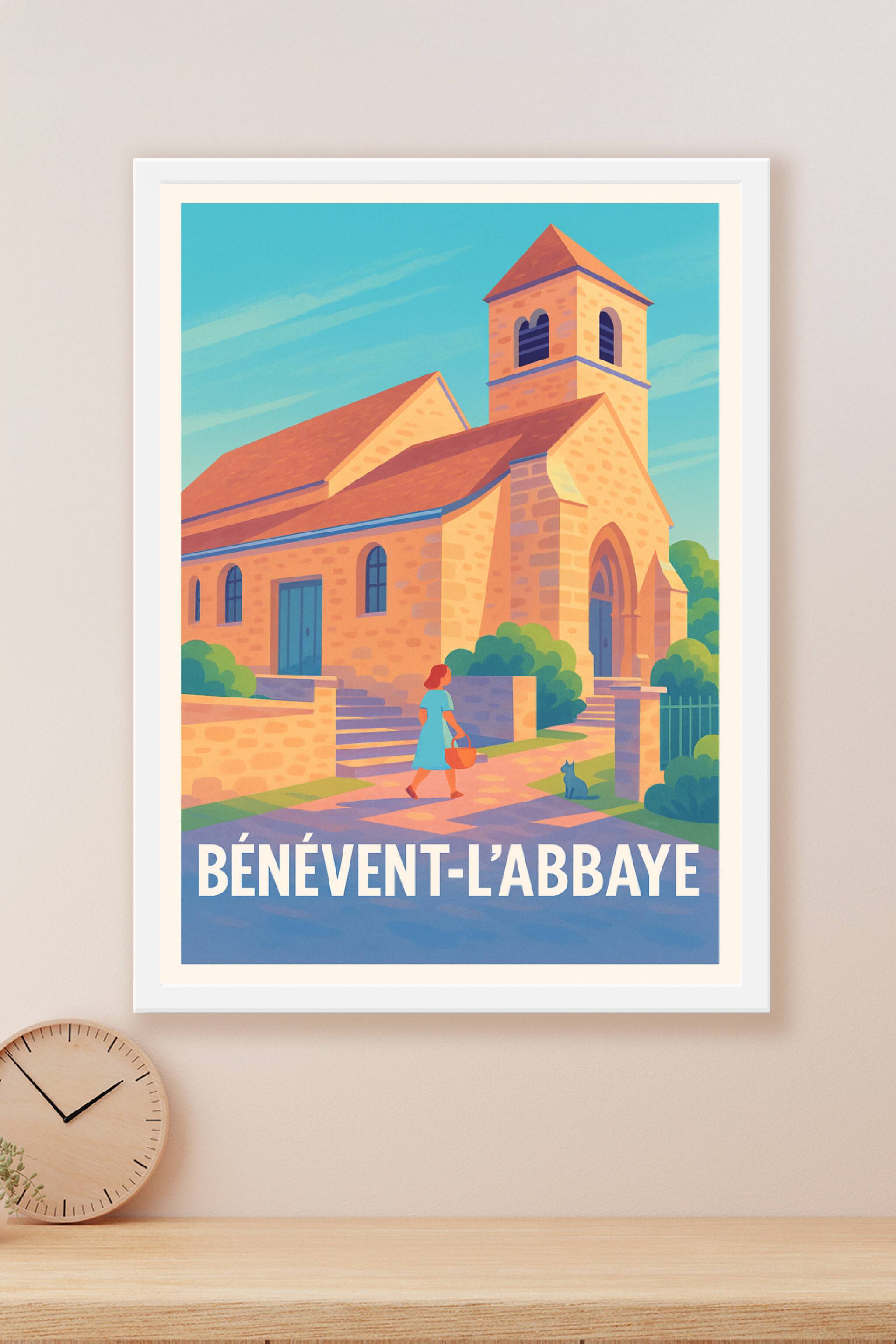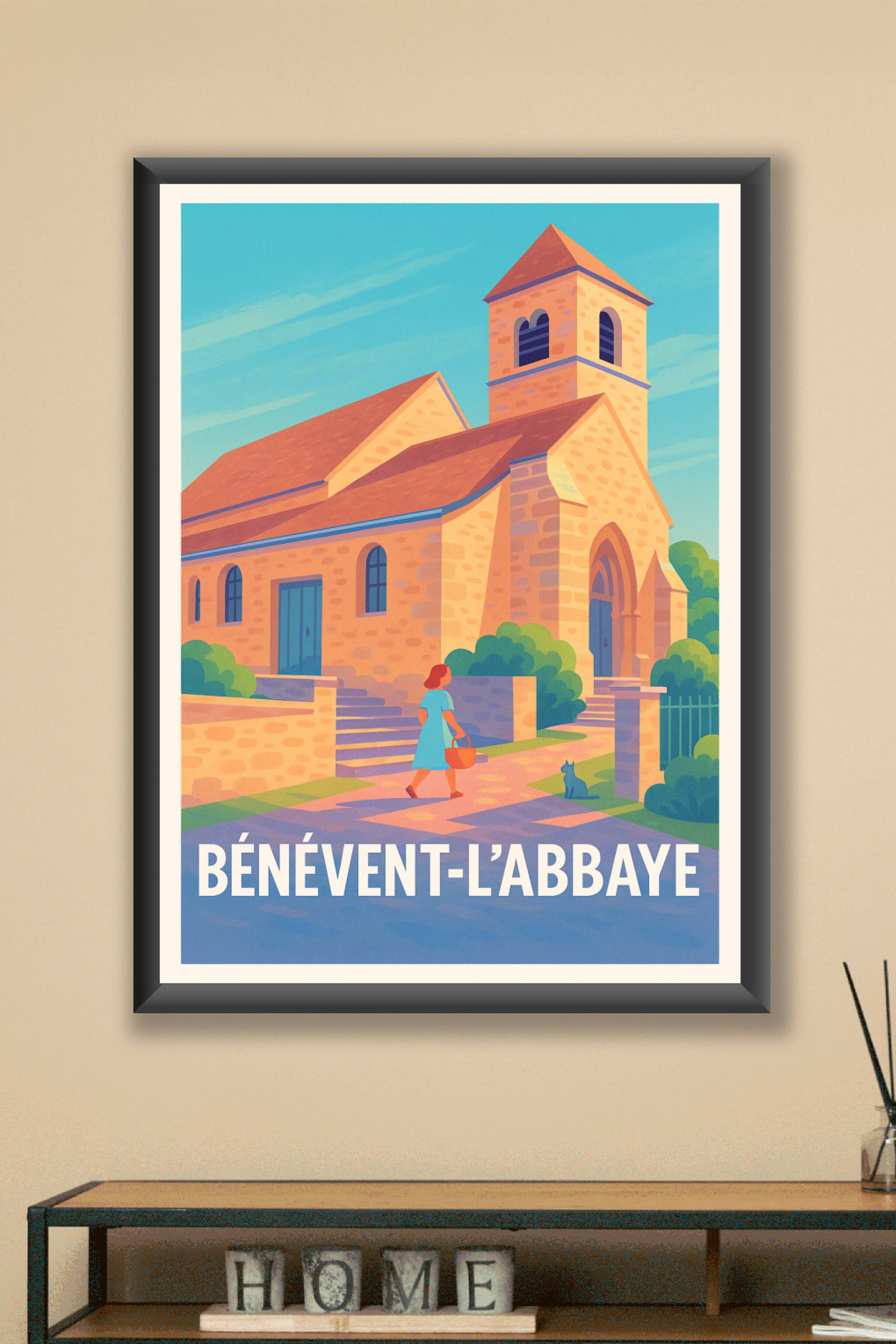 Découvrez l'élégance intemporelle de Bénévent-l'Abbaye à travers cette affiche illustrée mettant en lumière son architecture en pierre chaleureuse ...