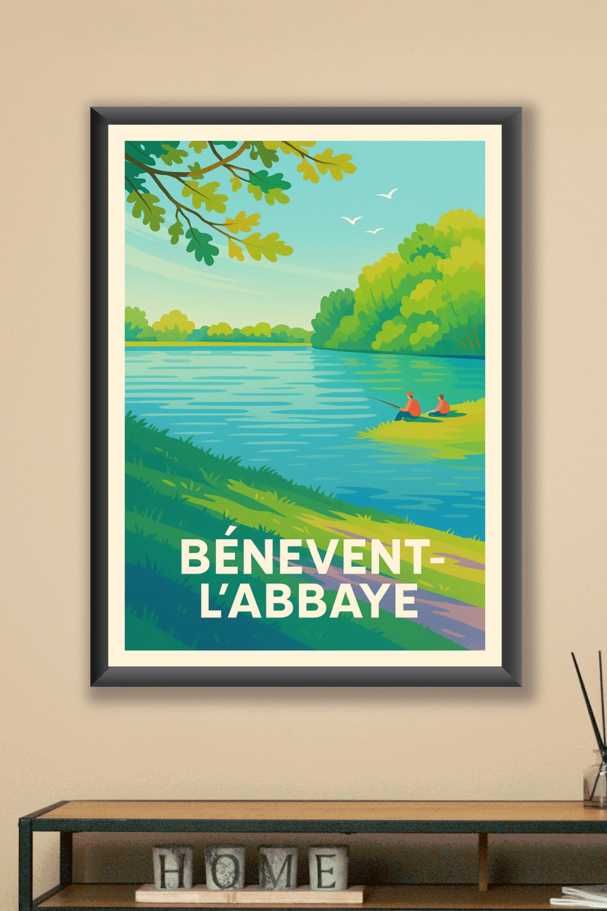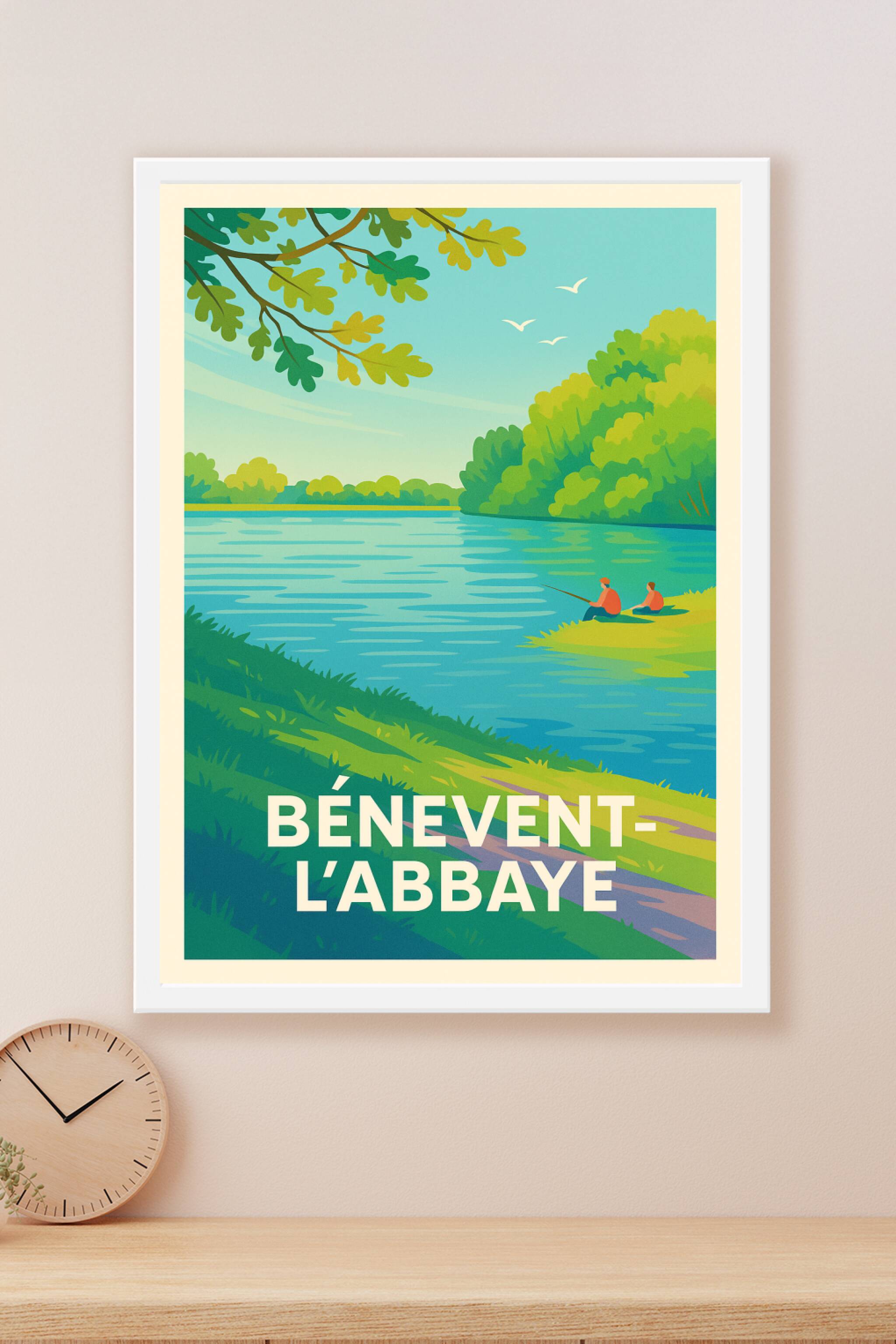 Découvrez la sérénité bucolique de Bénévent-l'Abbaye avec ce poster illustré mettant en scène un paysage paisible au bord de l'eau, où la nature lu...
