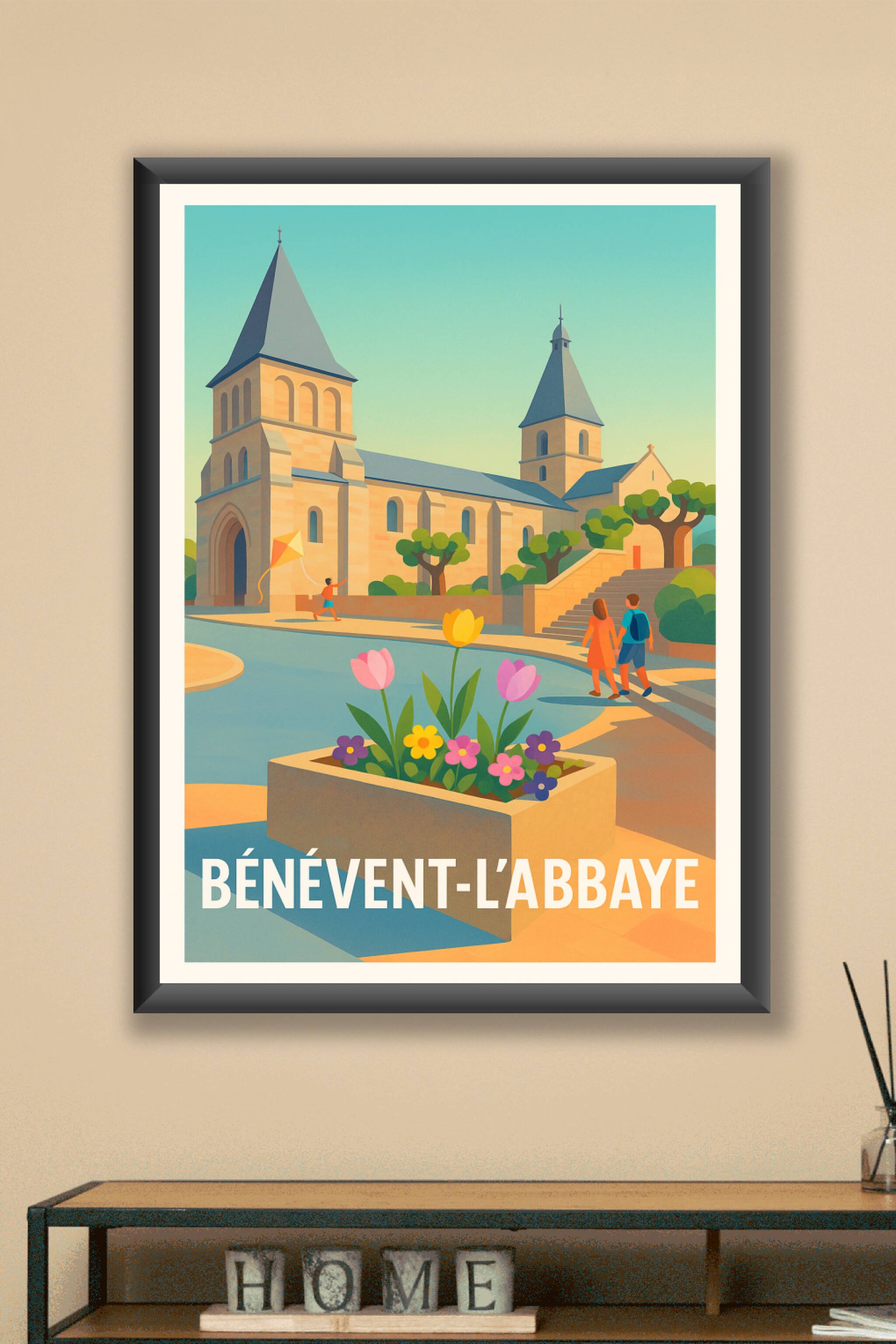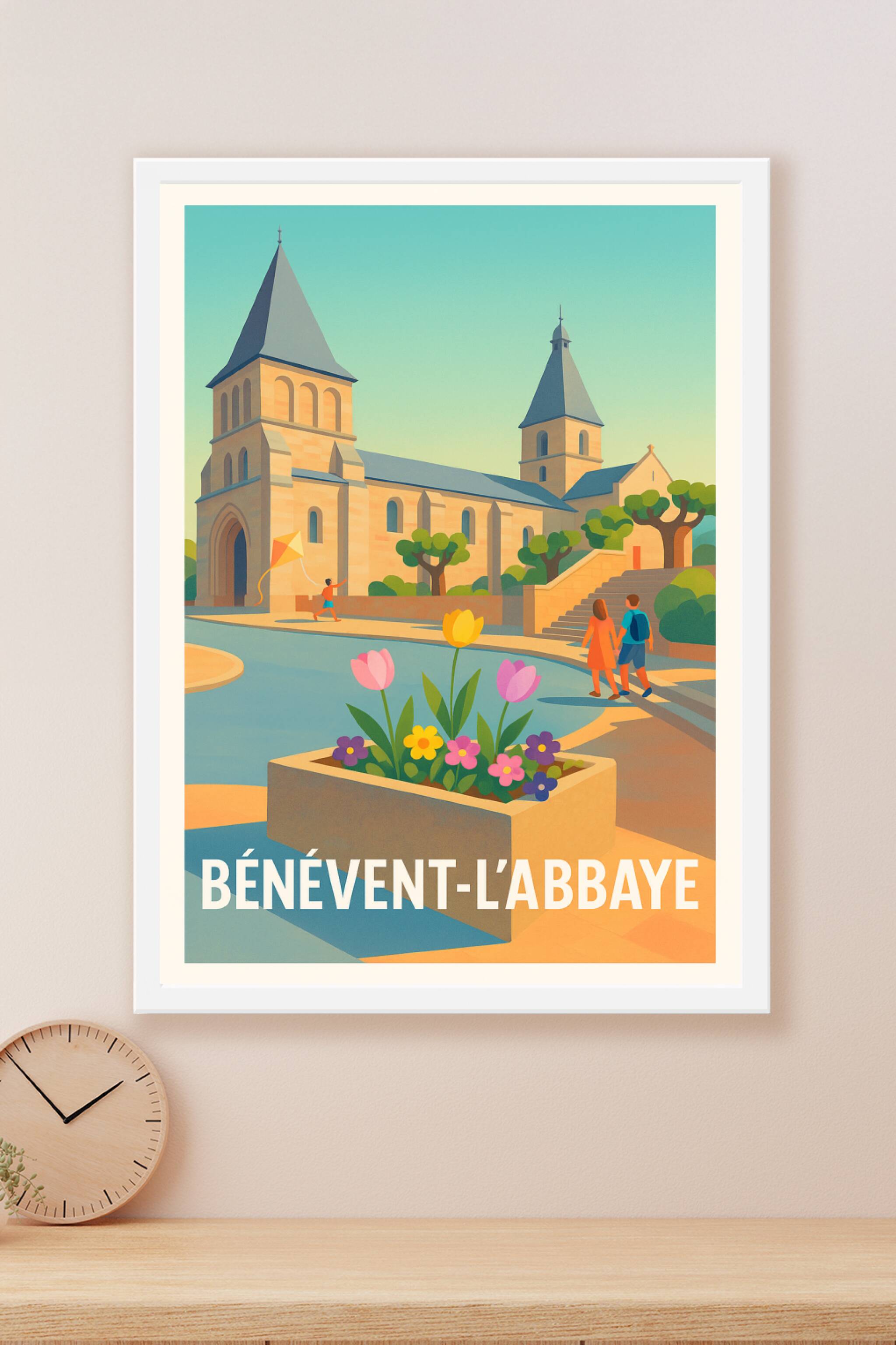 Découvrez la douceur paisible de Bénévent-l'Abbaye avec cette affiche élégante illustrant ses monuments historiques baignés d'une lumière tendre. C...