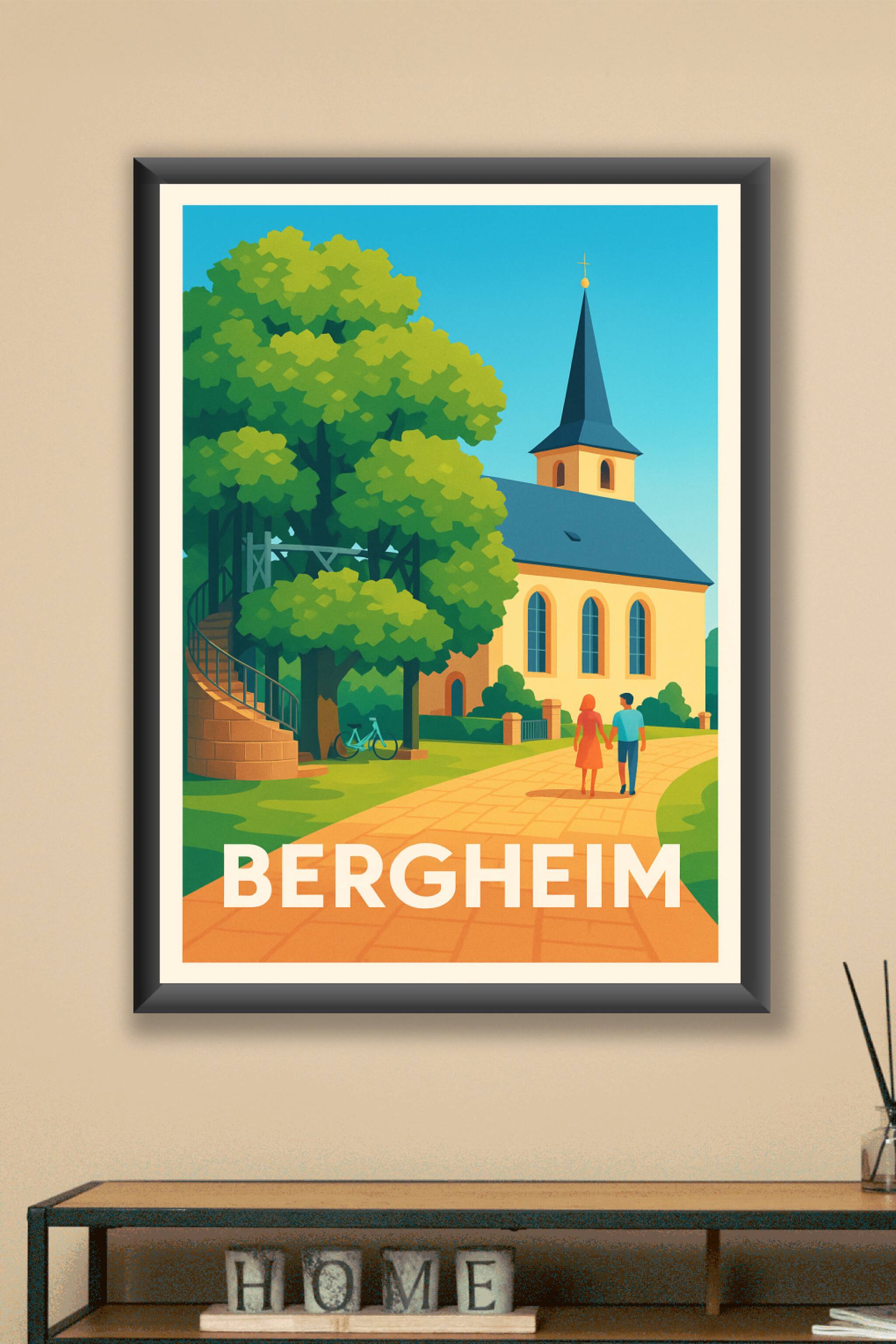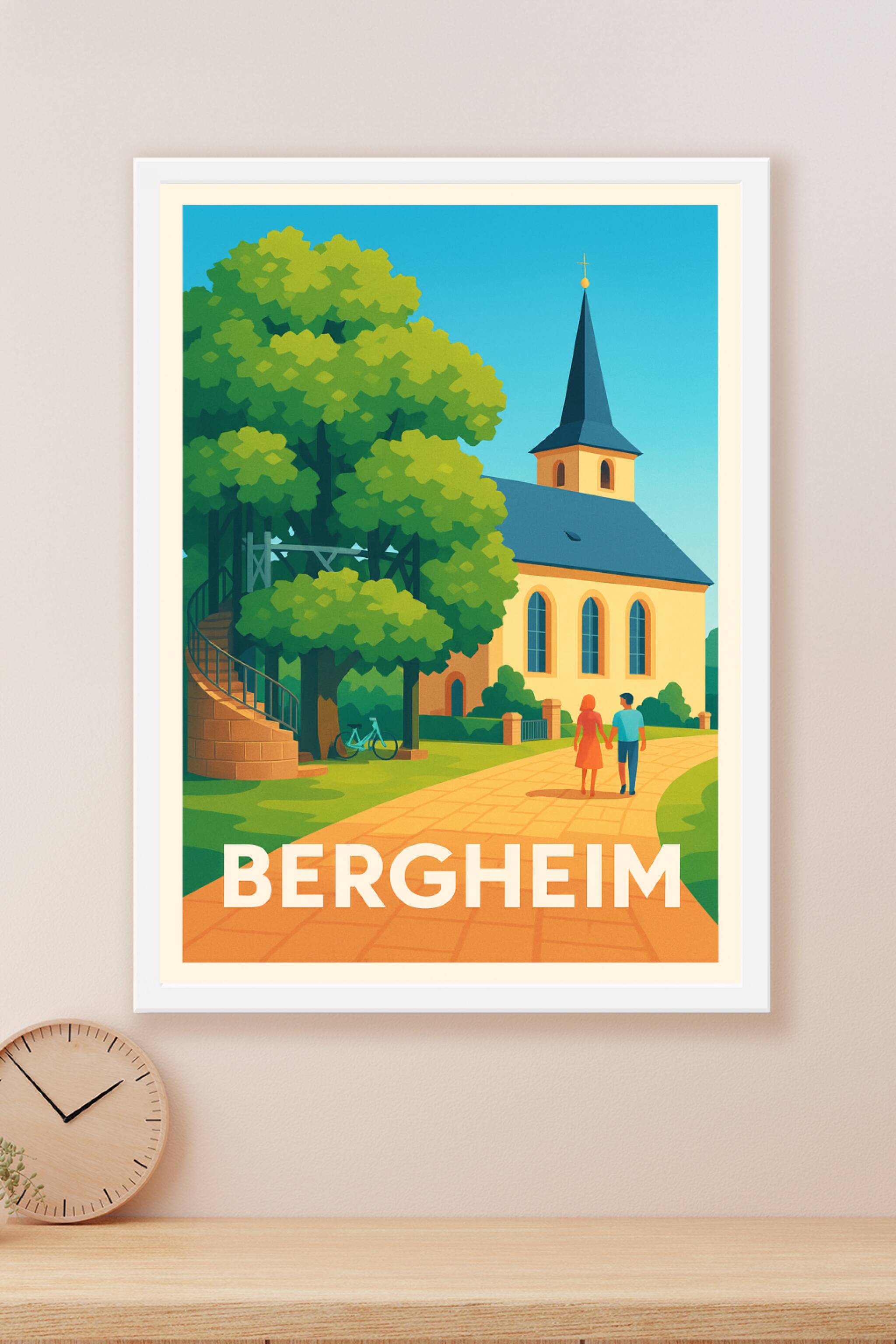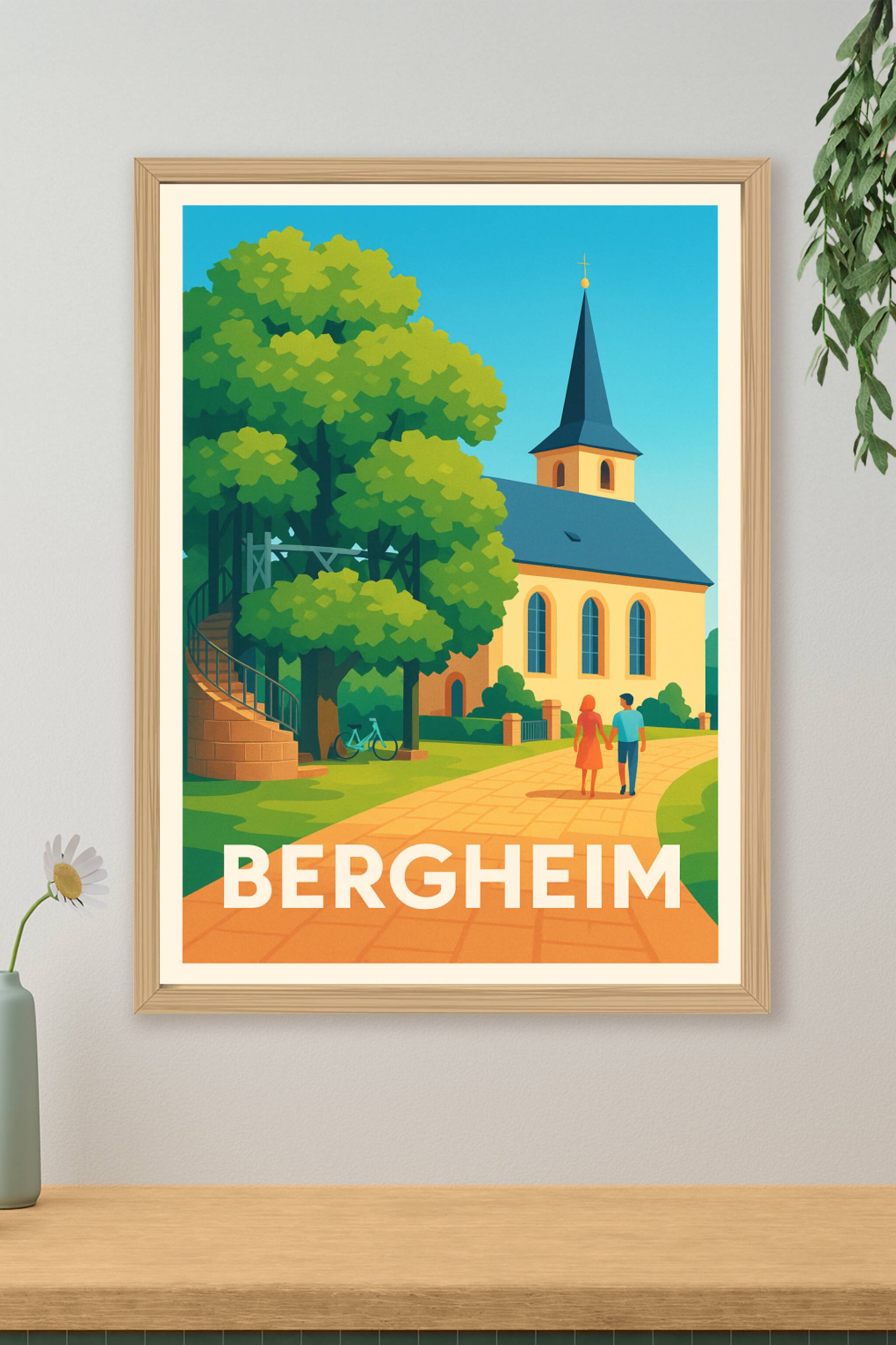 Découvrez l'ambiance paisible et pittoresque de Bergheim avec cette affiche illustrée mettant en avant son église typique et les sentiers verdoyant...