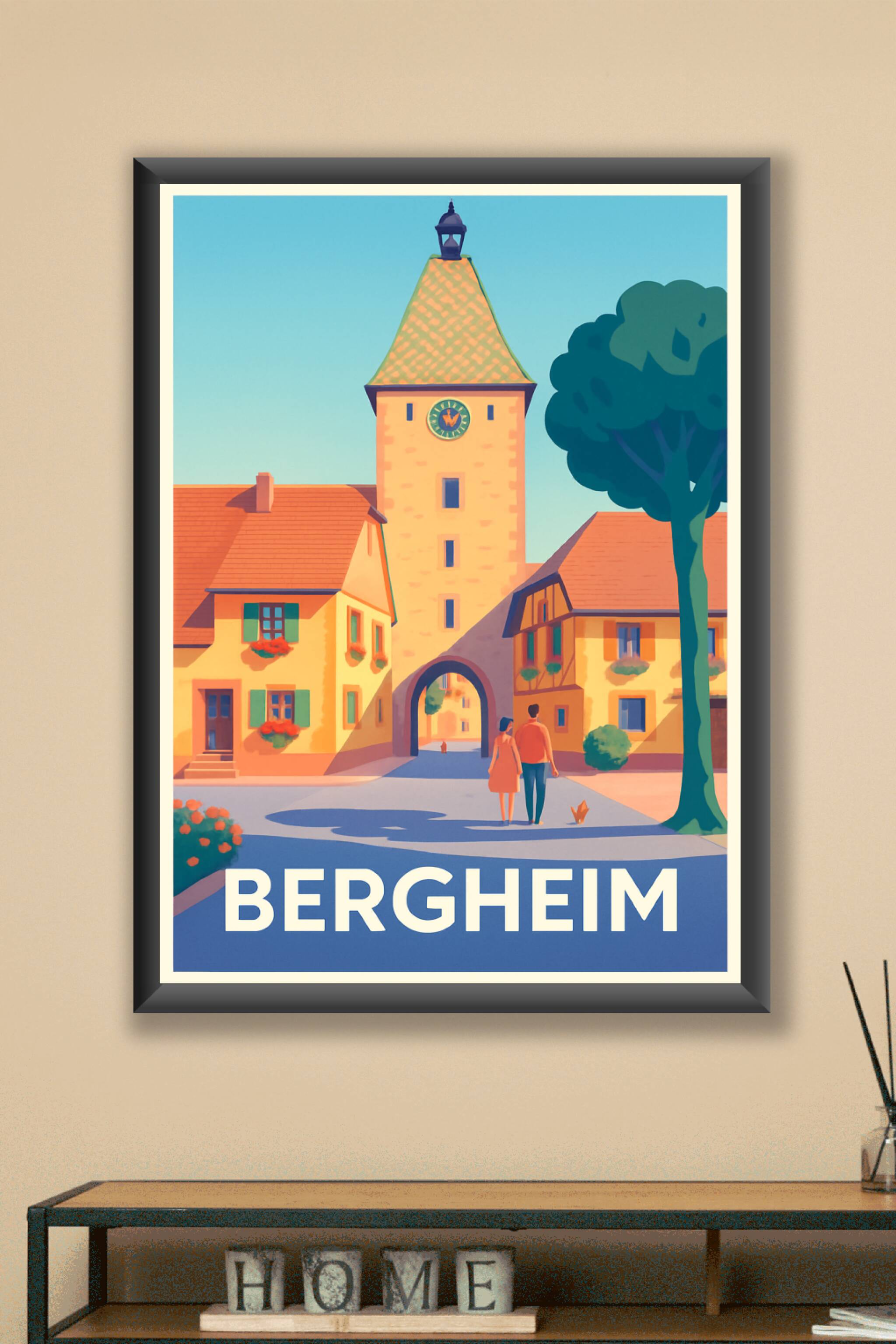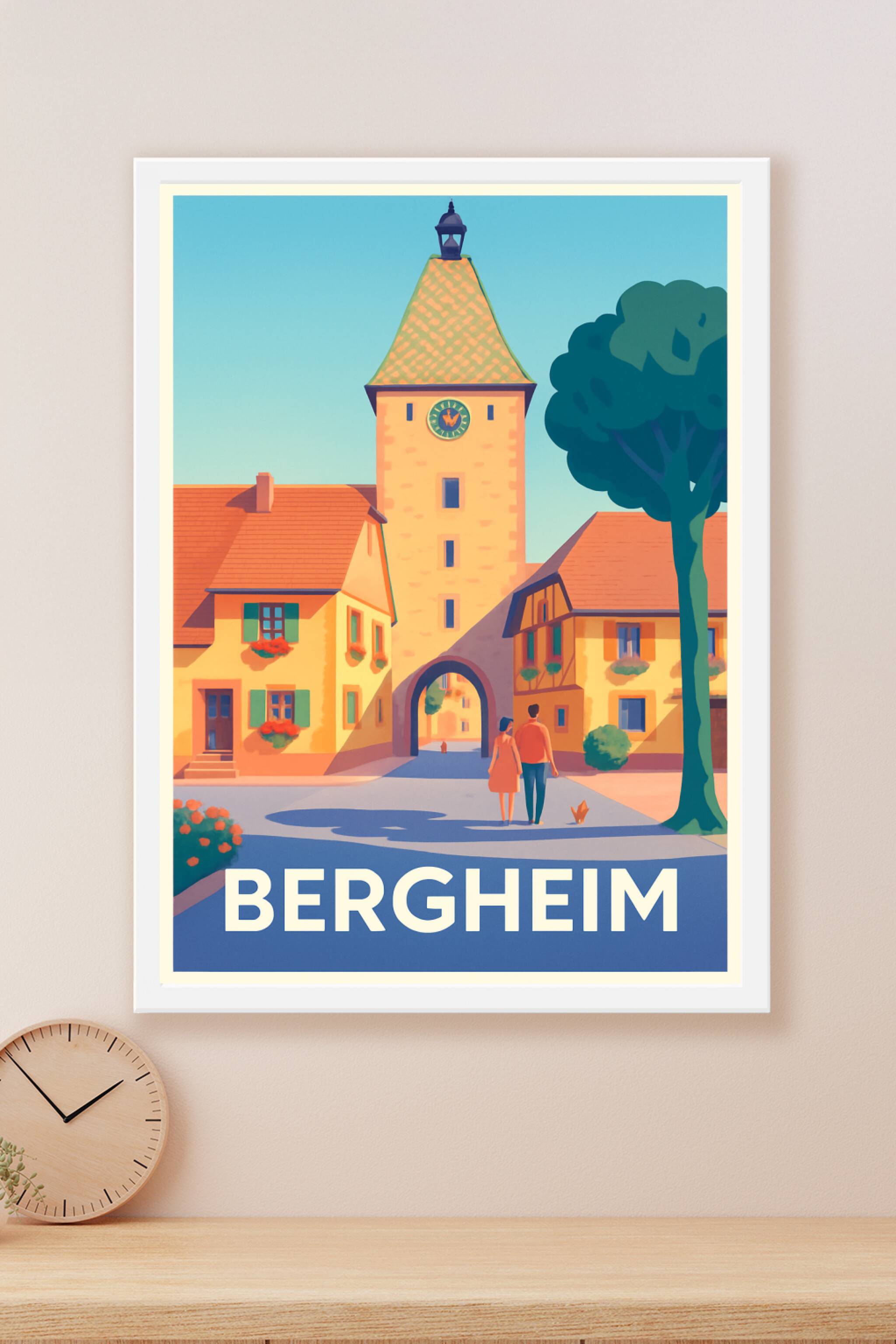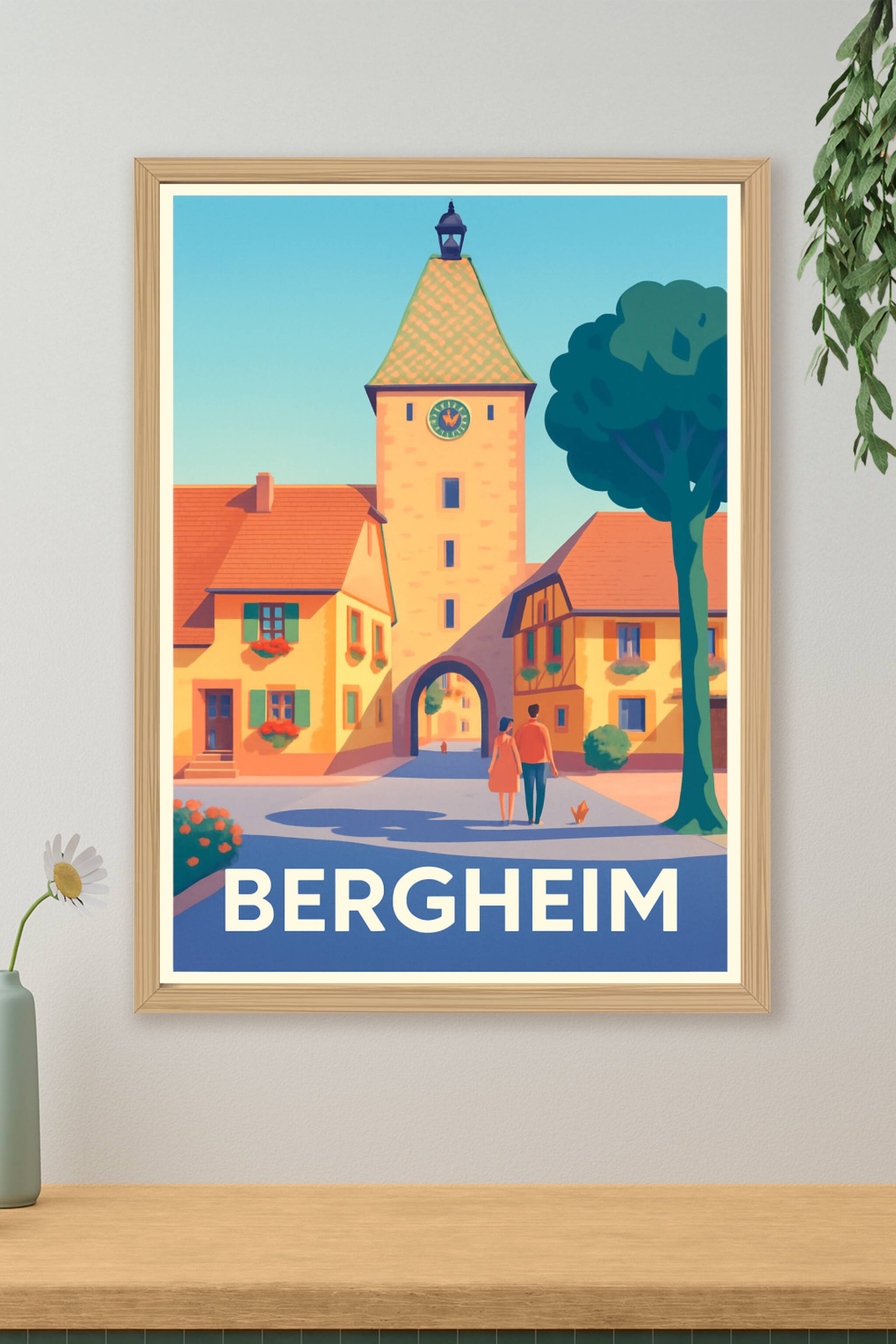 Découvrez le charme pittoresque de Bergheim à travers cette affiche illustrée mettant en scène ses ruelles typiques et sa célèbre porte fortifiée. ...