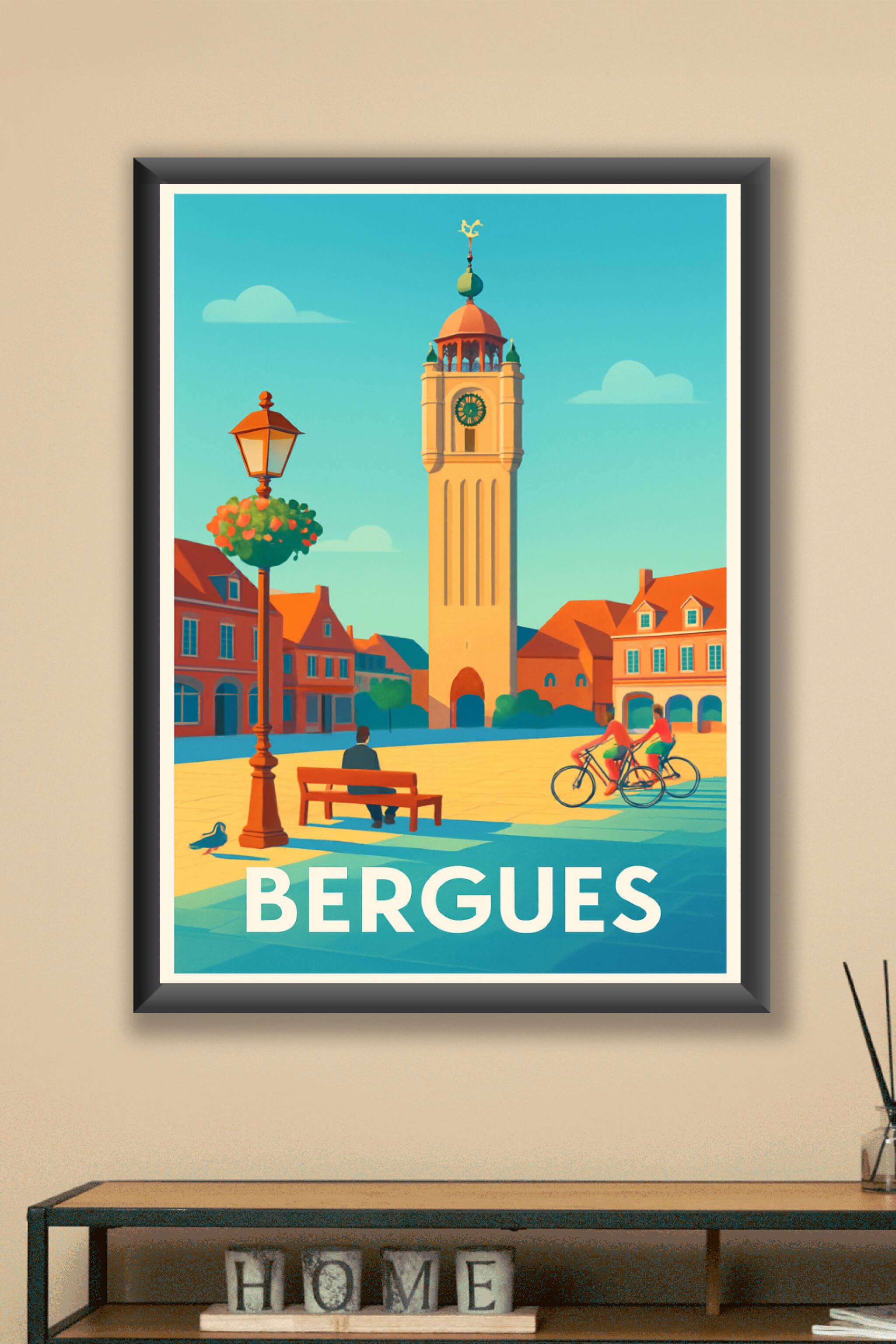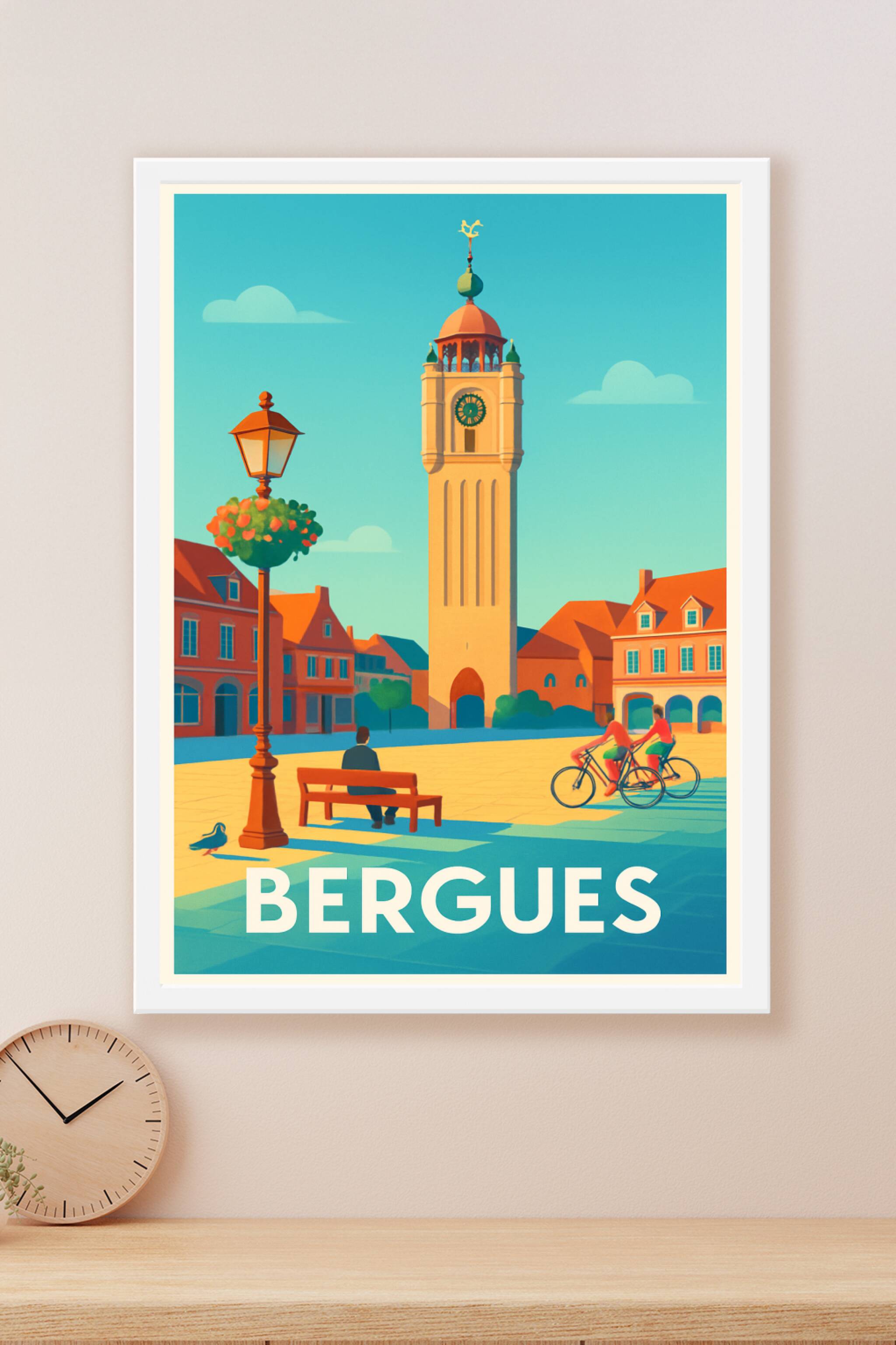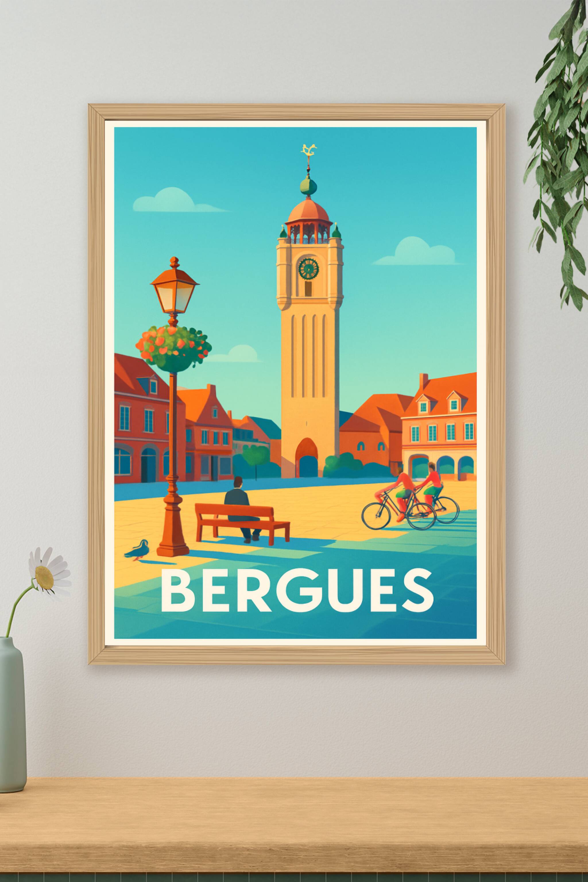 Découvrez la quiétude et l’authenticité de Bergues avec cette superbe affiche illustrée mettant en avant le célèbre beffroi, symbole emblématique d...