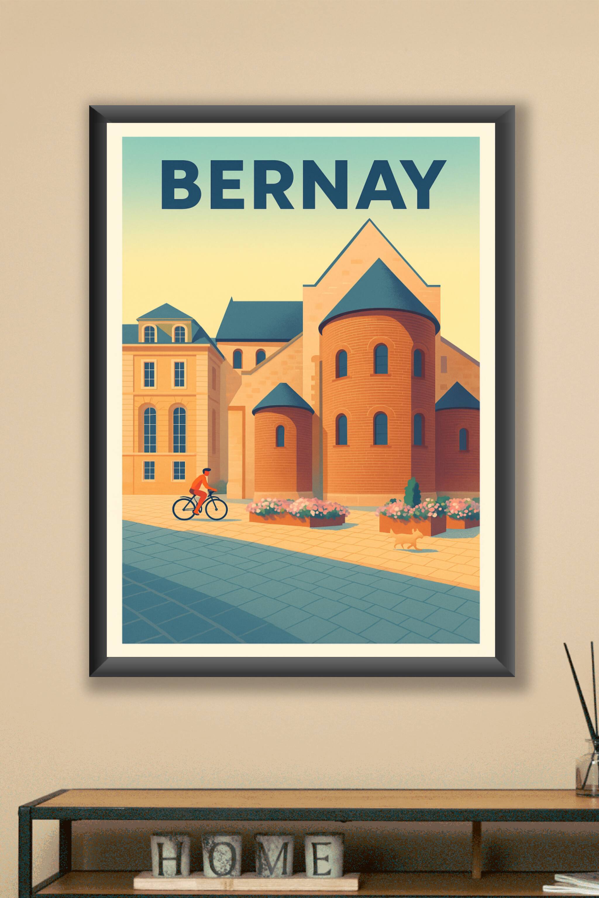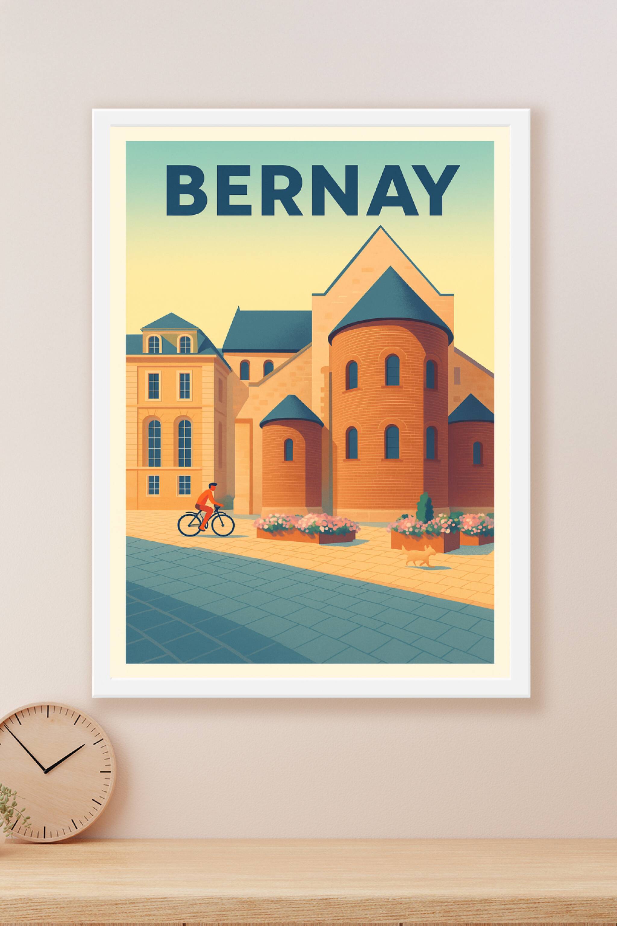Découvrez cette affiche illustrée mettant en valeur le patrimoine architectural de Bernay, une charmante ville normande. Le poster capture une scène paisible où un cycliste passe devant une remarquable bâtisse de pierre et de briques, bordée de fleurs colorées, sous une lumière douce et chaleureuse. Disponible en tirage "Fine Art" haute qualité, imprimé sur papier 305g coton, ce poster se décline en plusieurs formats A1 à A4, avec ou sans cadre, pour s'adapter à toutes vos envies de décoration intérieure. Sublimez votre intérieur avec ce poster au style vintage qui apporte une touche authentique et raffinée à votre espace, ou offrez un cadeau unique aux amoureux de Bernay et de la Normandie.