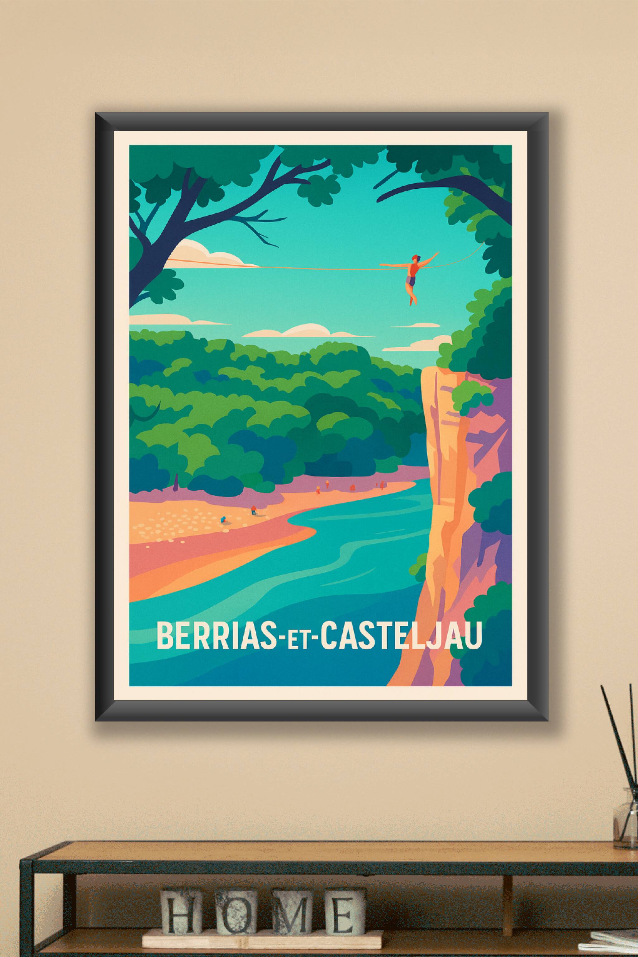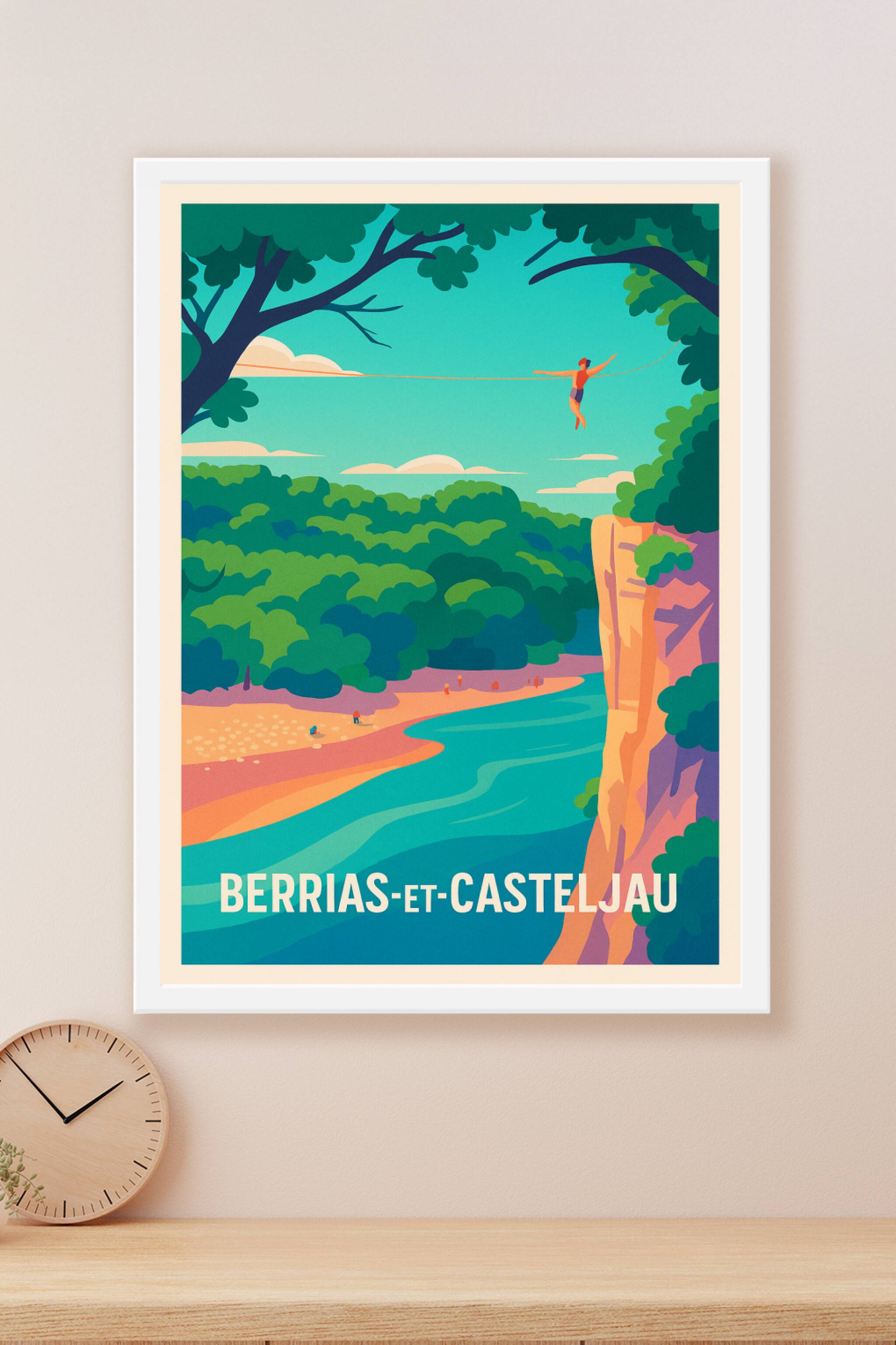 Découvrez la beauté sauvage et l'esprit d'aventure de Berrias-et-Casteljau avec cette affiche illustrée aux couleurs vives, représentant un funambu...