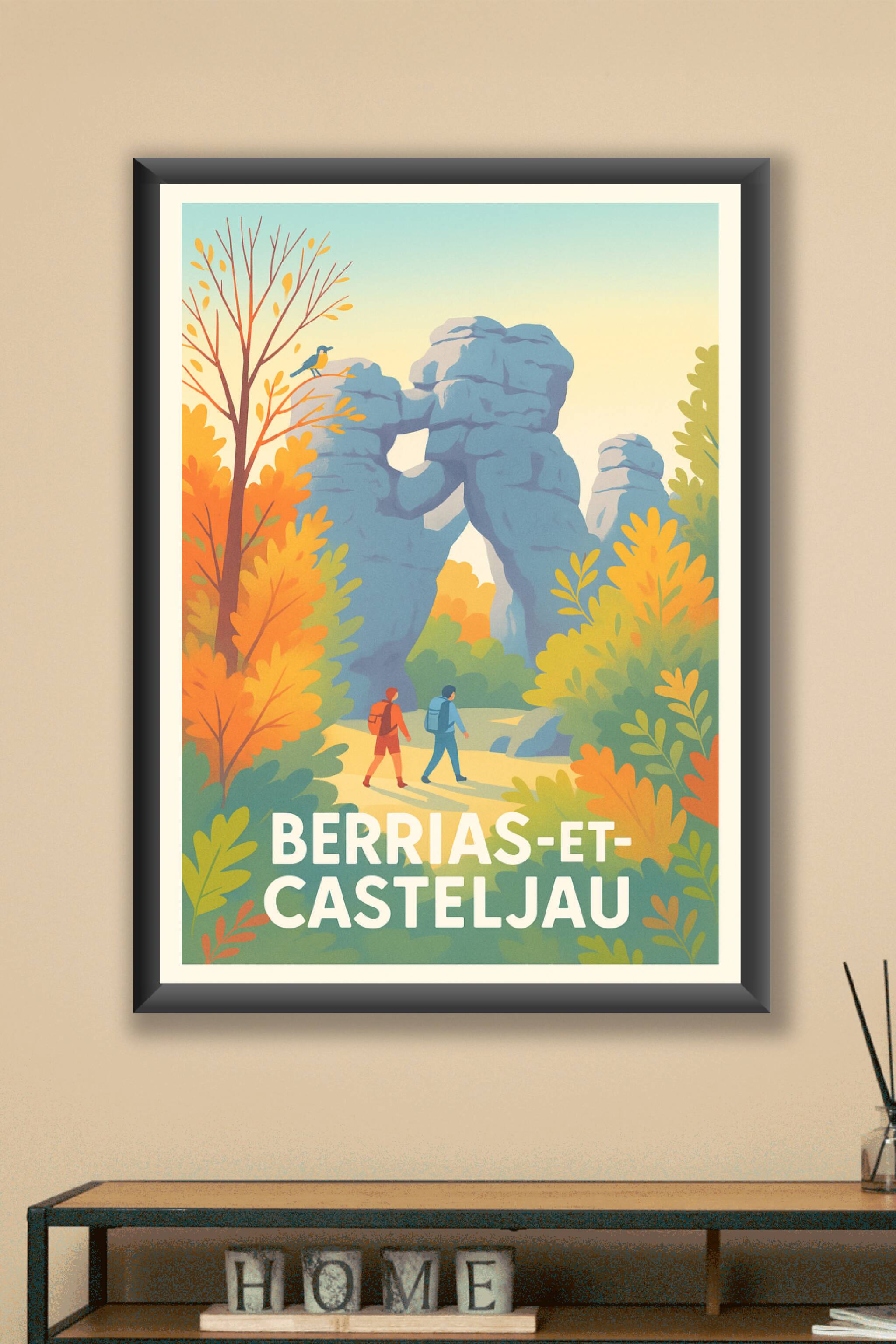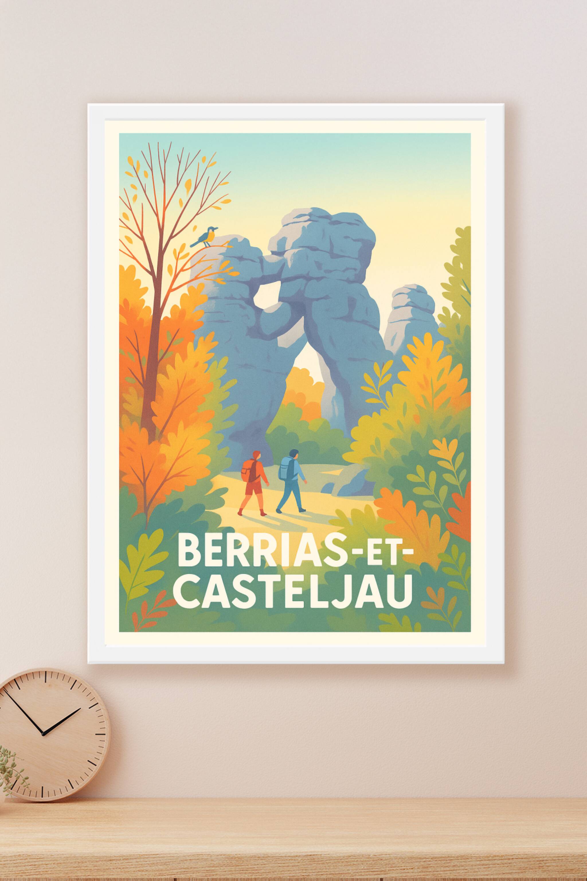 Découvrez le charme naturel de Berrias-et-Casteljau avec cette affiche illustrée mettant en scène une randonnée au milieu des roches impressionnant...