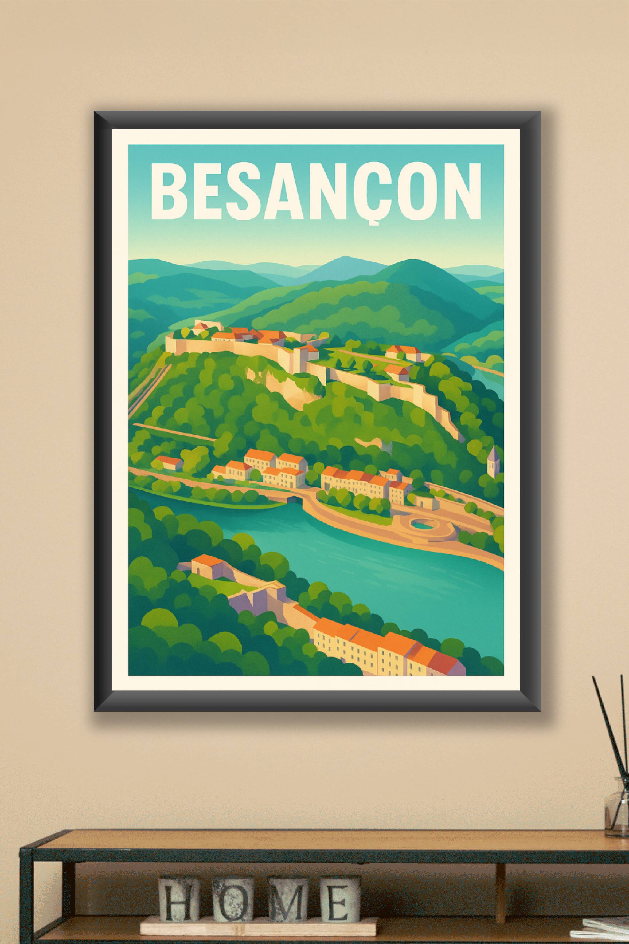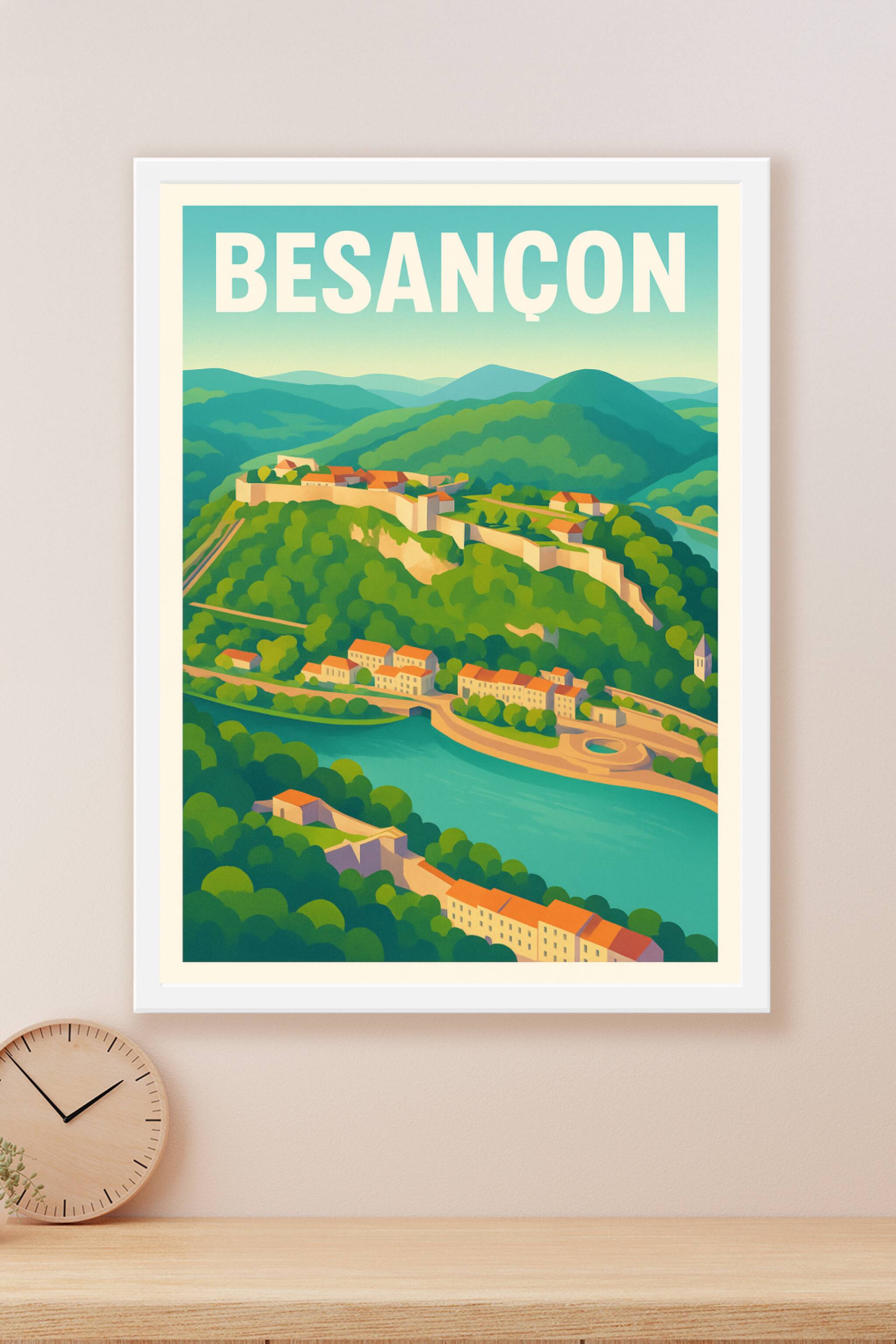 Découvrez la beauté paisible et verdoyante de Besançon avec cette affiche illustrée au style vintage, mettant en avant la célèbre citadelle qui dom...