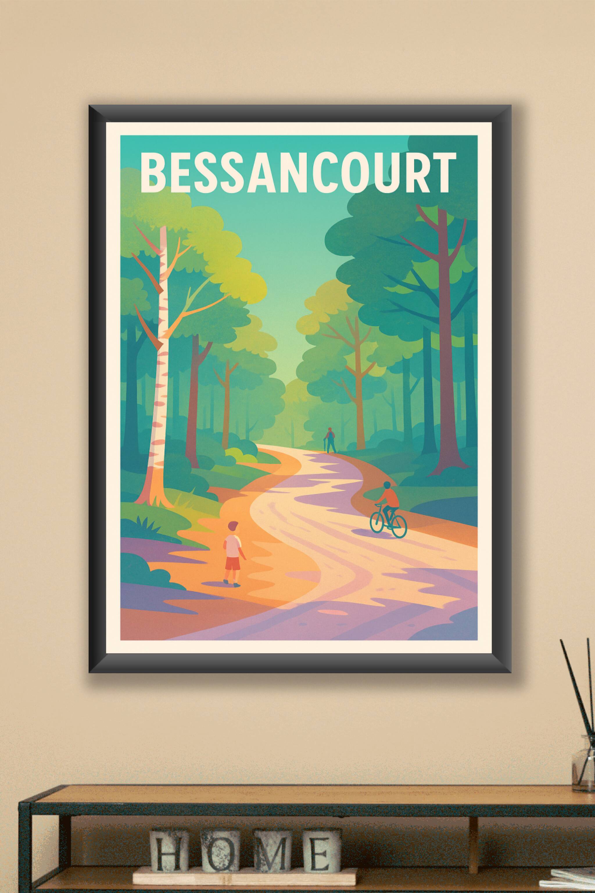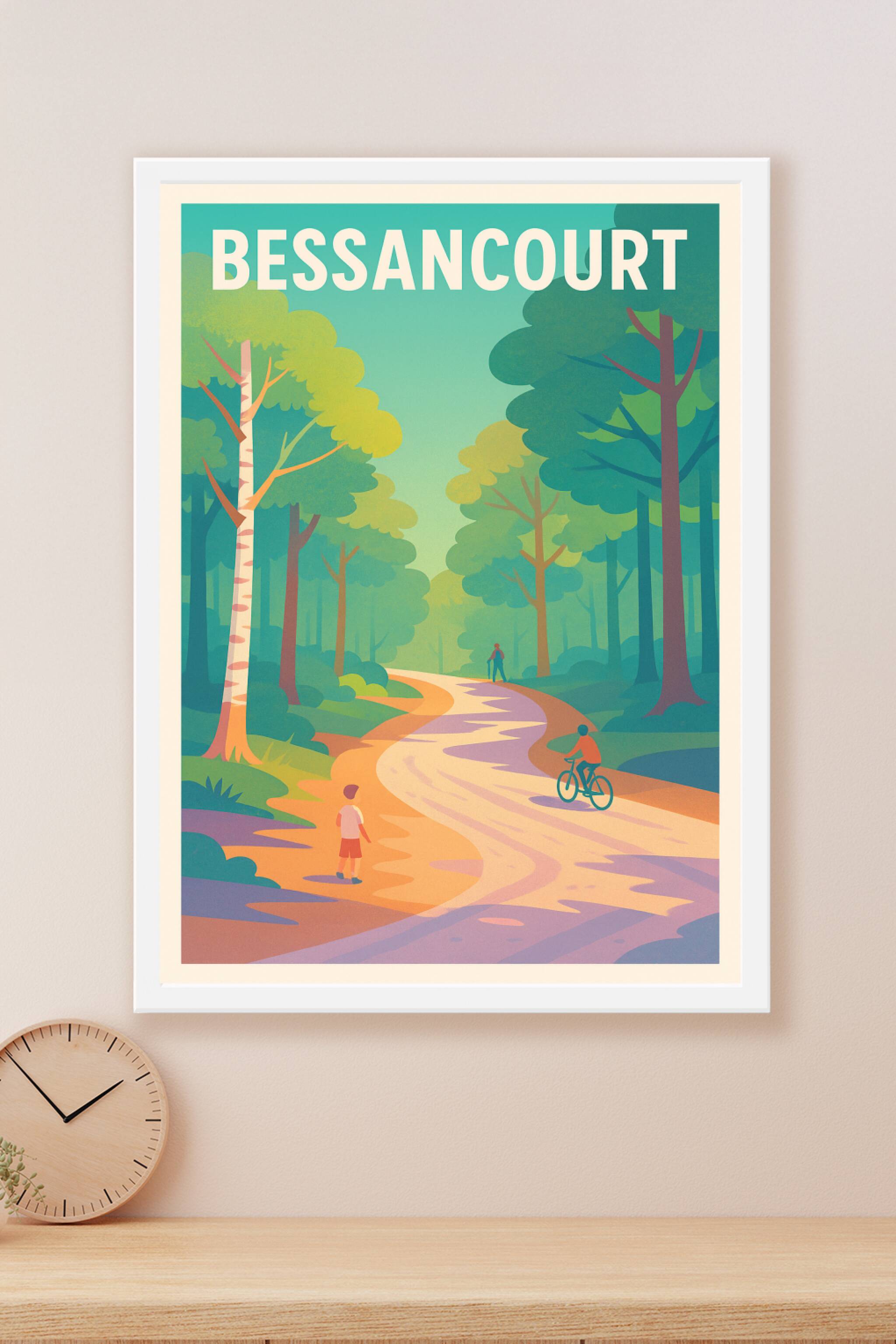 Découvrez la douceur de vivre de Bessancourt avec cette affiche illustrée mettant en scène une balade paisible à travers une forêt verdoyante. Ce p...