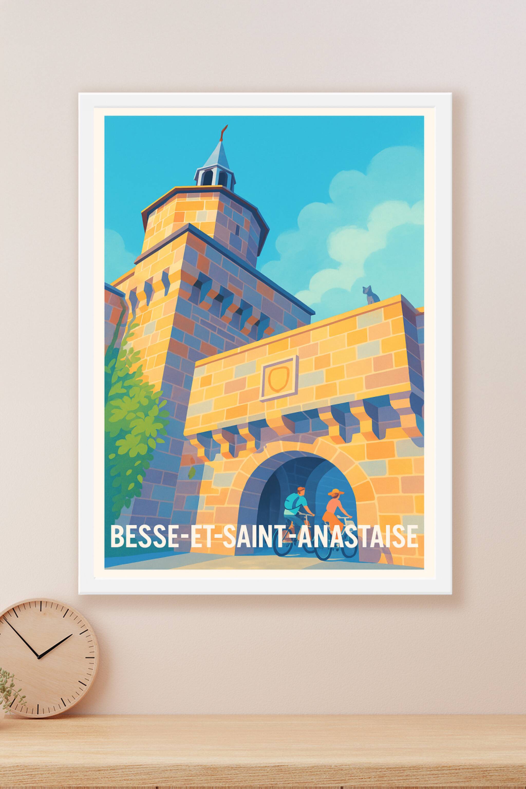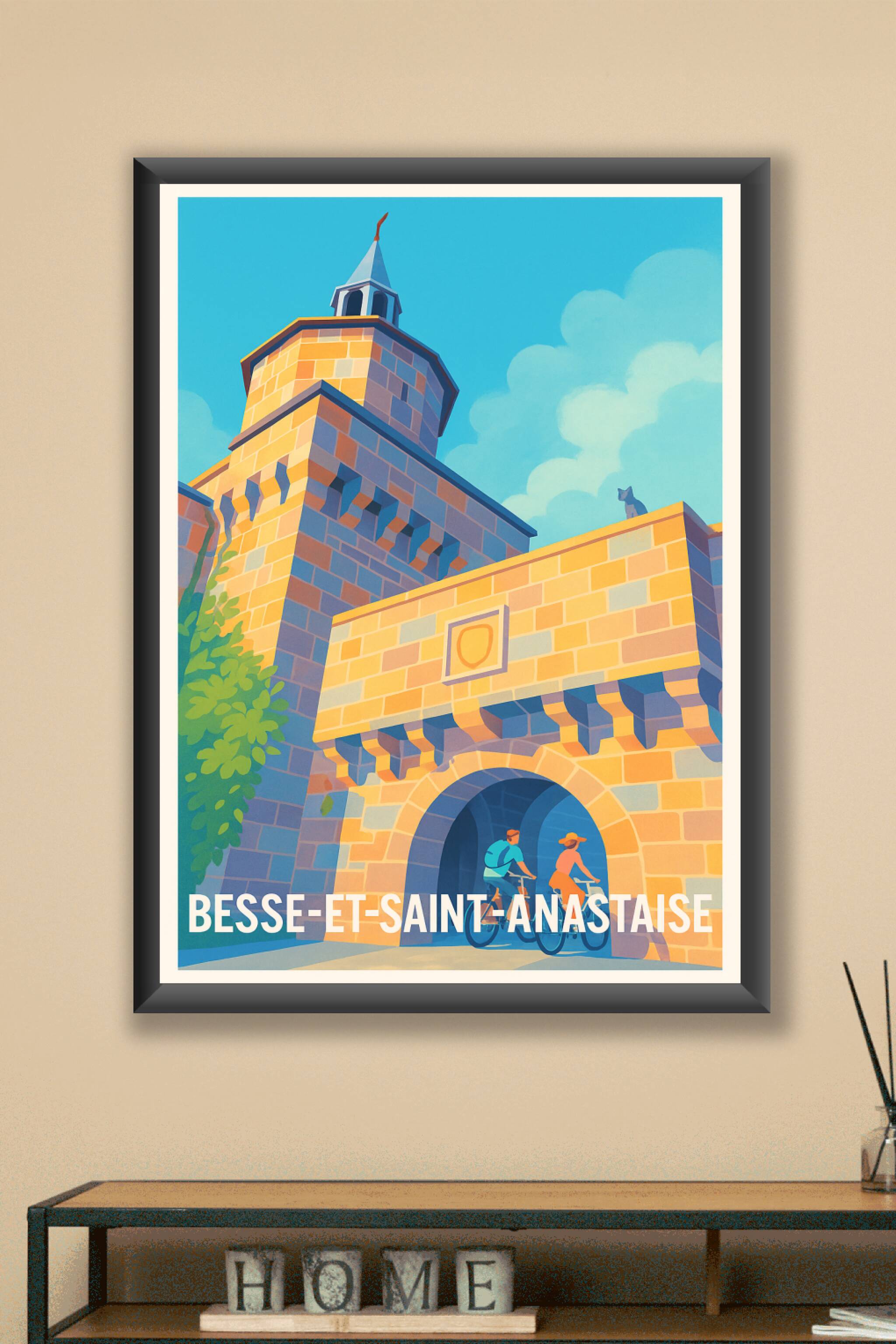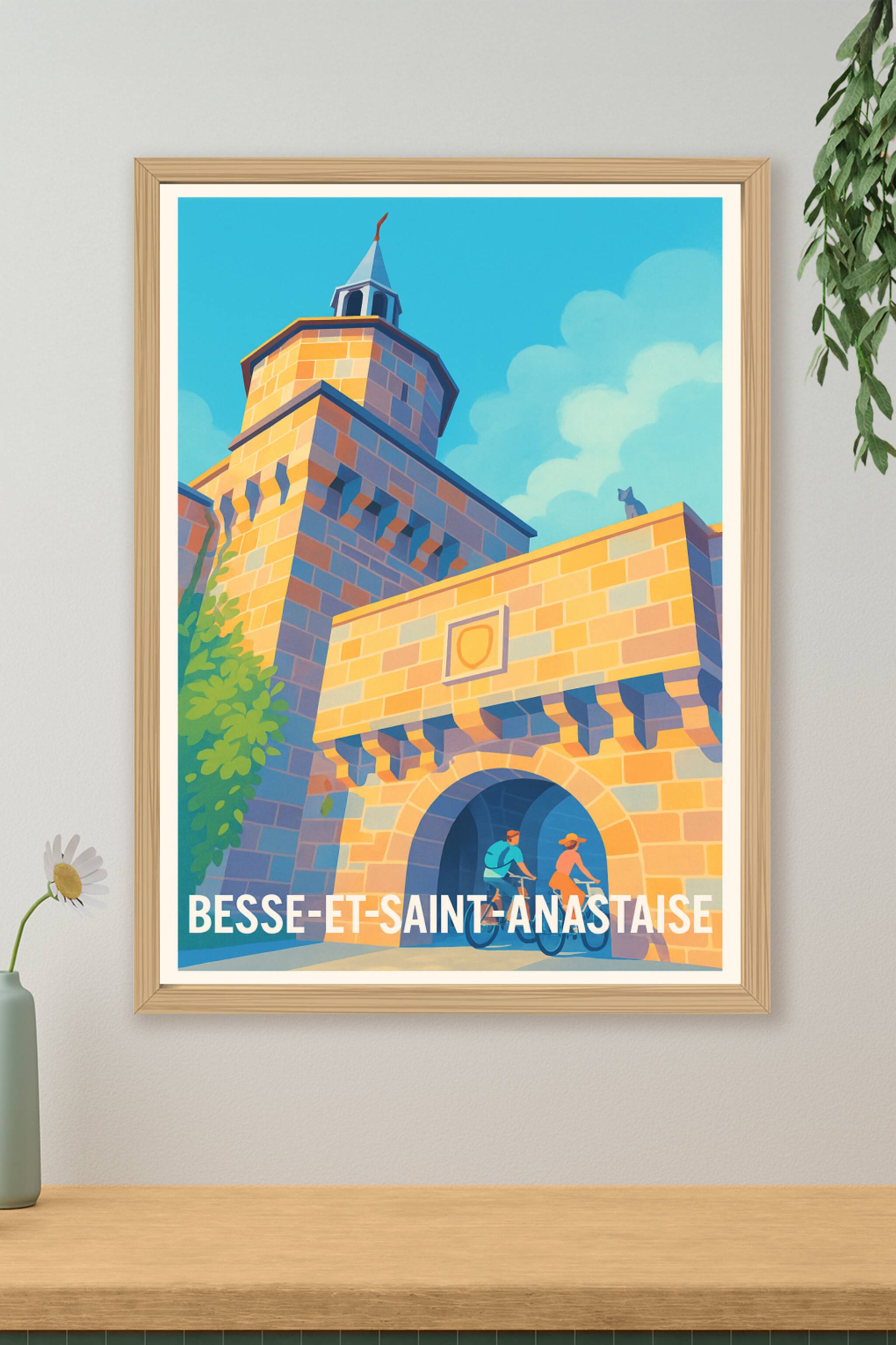 Découvrez l'élégance intemporelle de Besse-et-Saint-Anastaise avec cette affiche illustrée mettant en scène ses remparts ensoleillés et deux cyclis...